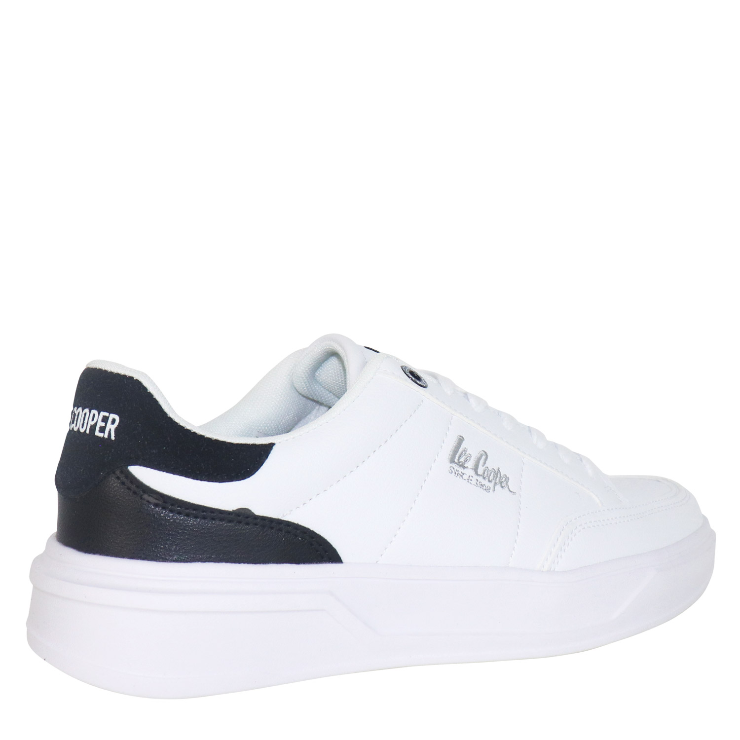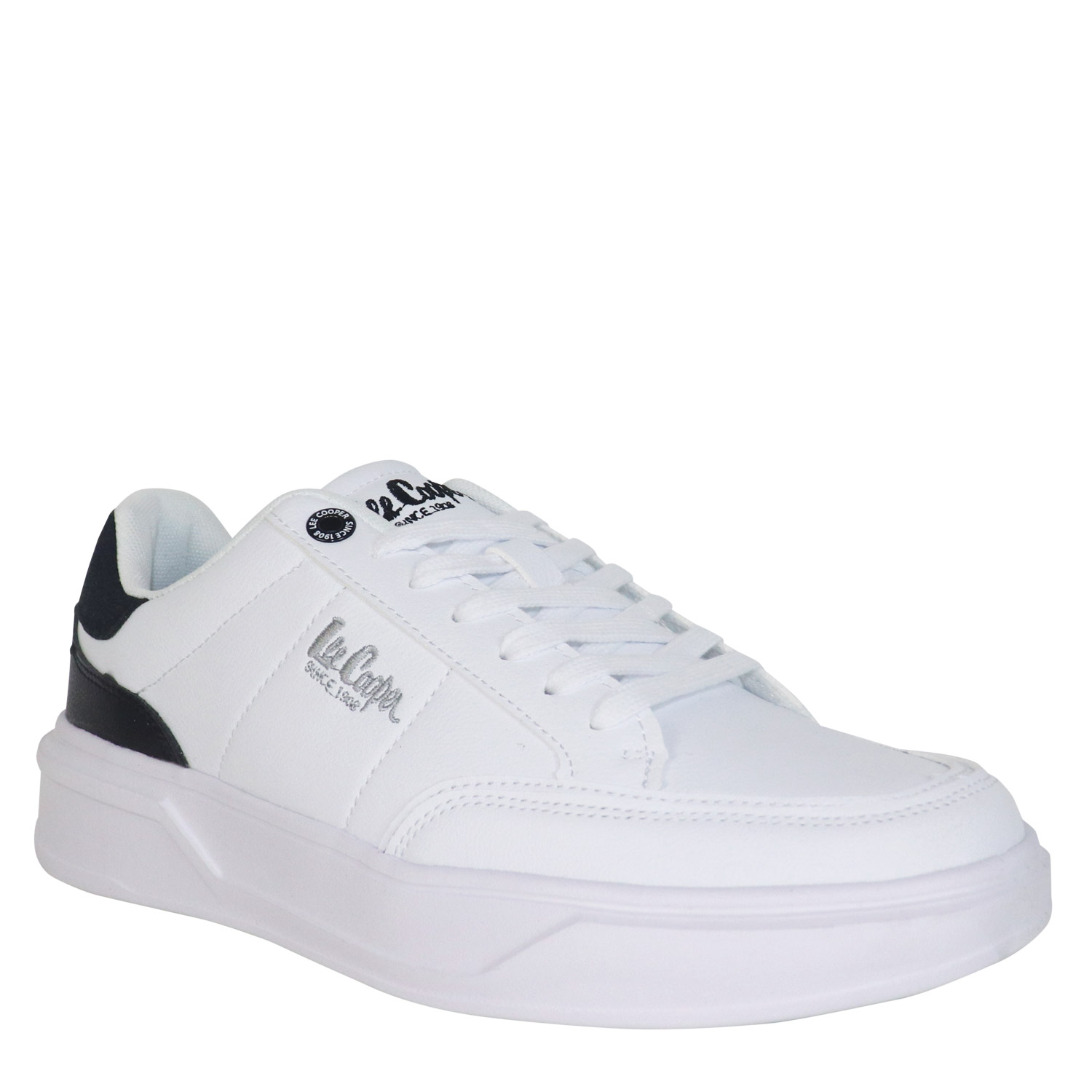 Lee Cooper ανδρικό sneaker σε λευκό με μαύρο χρώμα κατασκευασμενο από οικολογικό δέρμα.