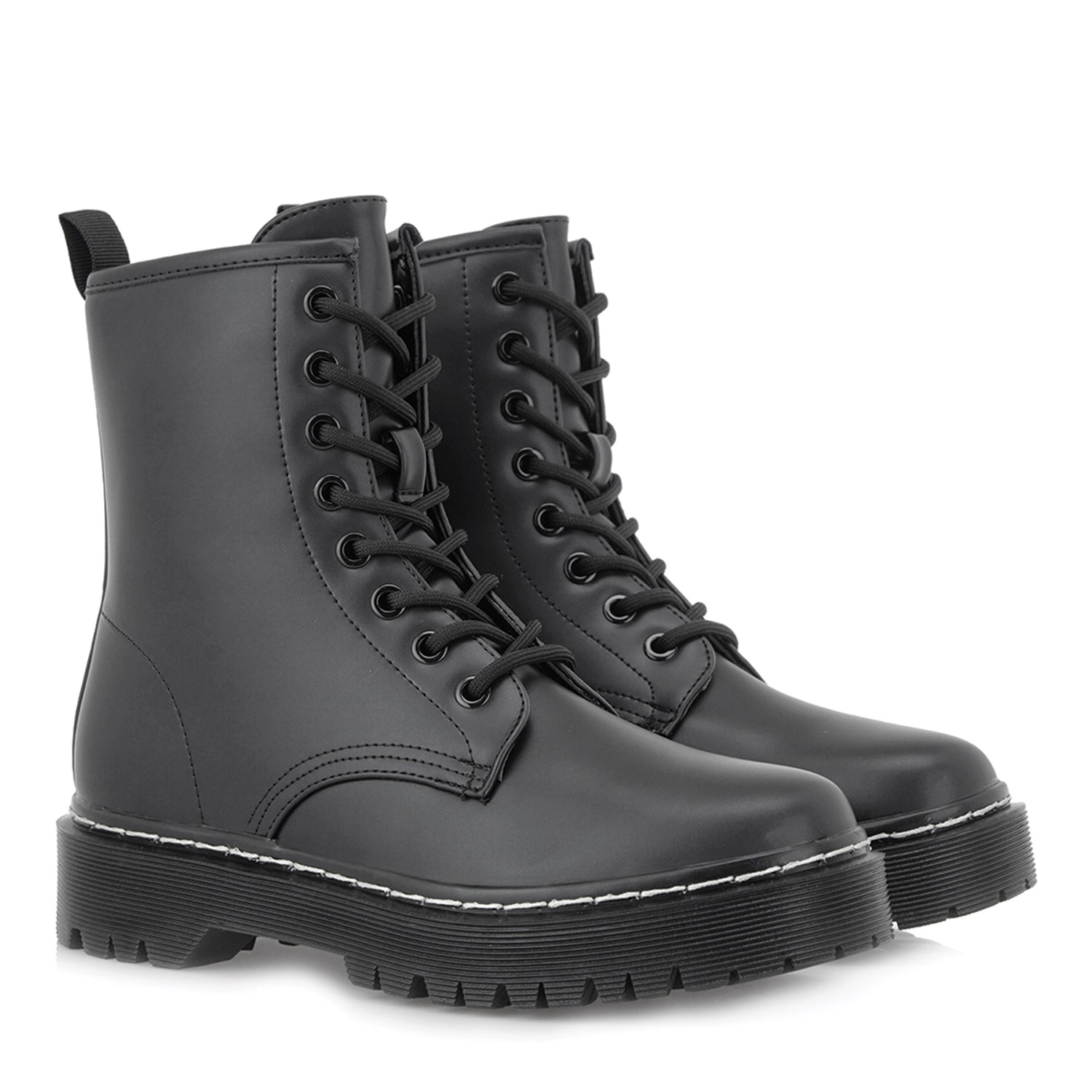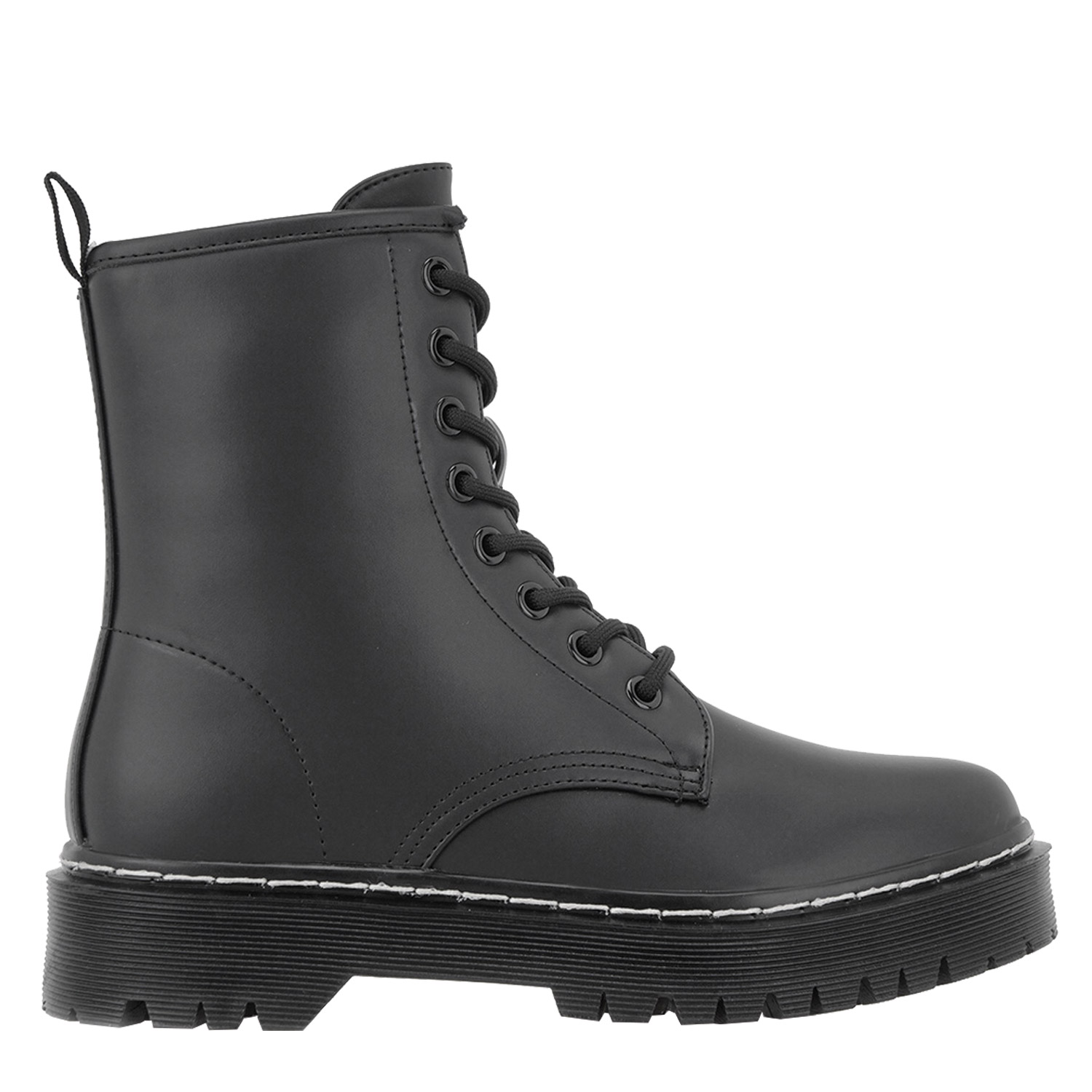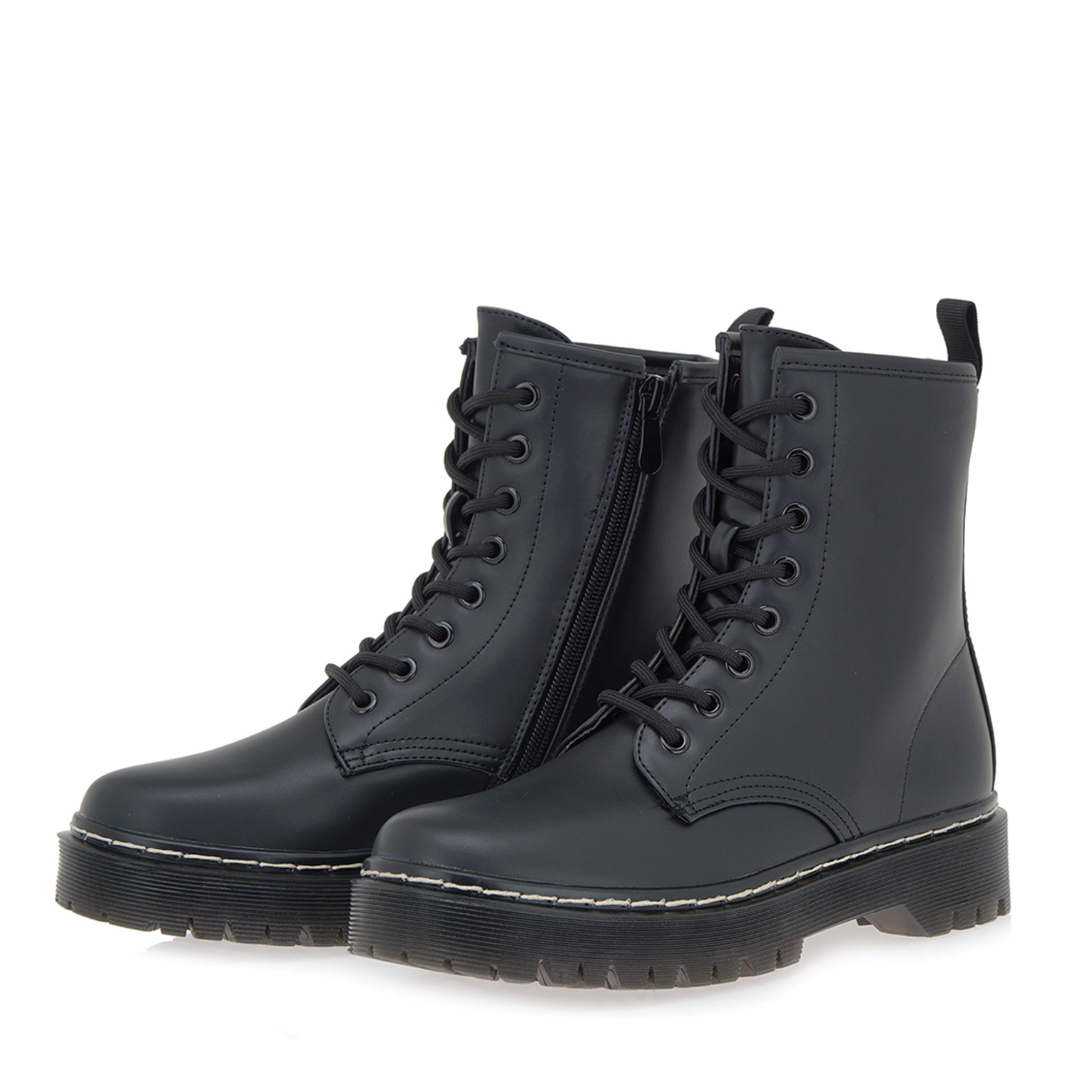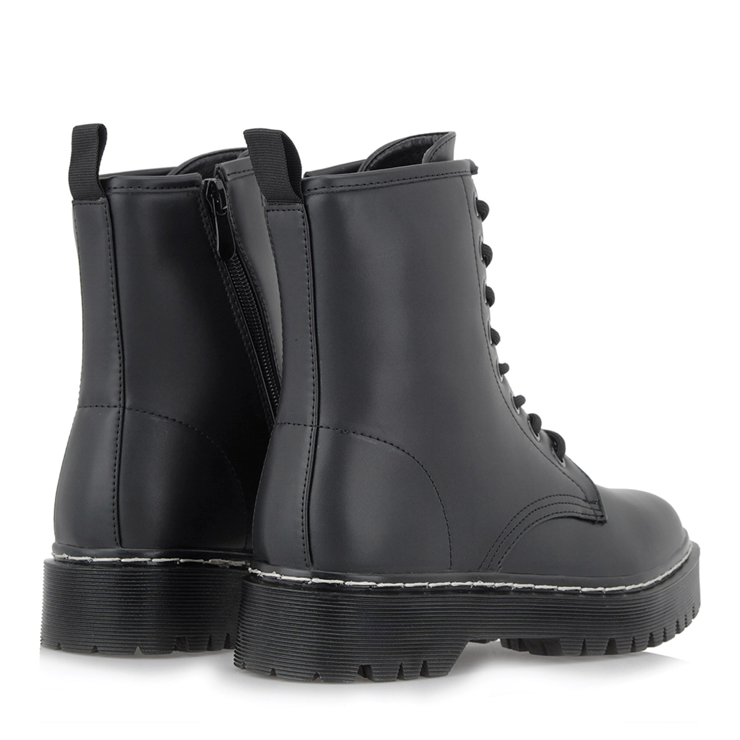 Seven γυναικείο μποτάκι, σε μαύρο χρώμα, κατασκευασμένο από οικολογικό δέρμα. Ύψος σόλας 4.5εκ.