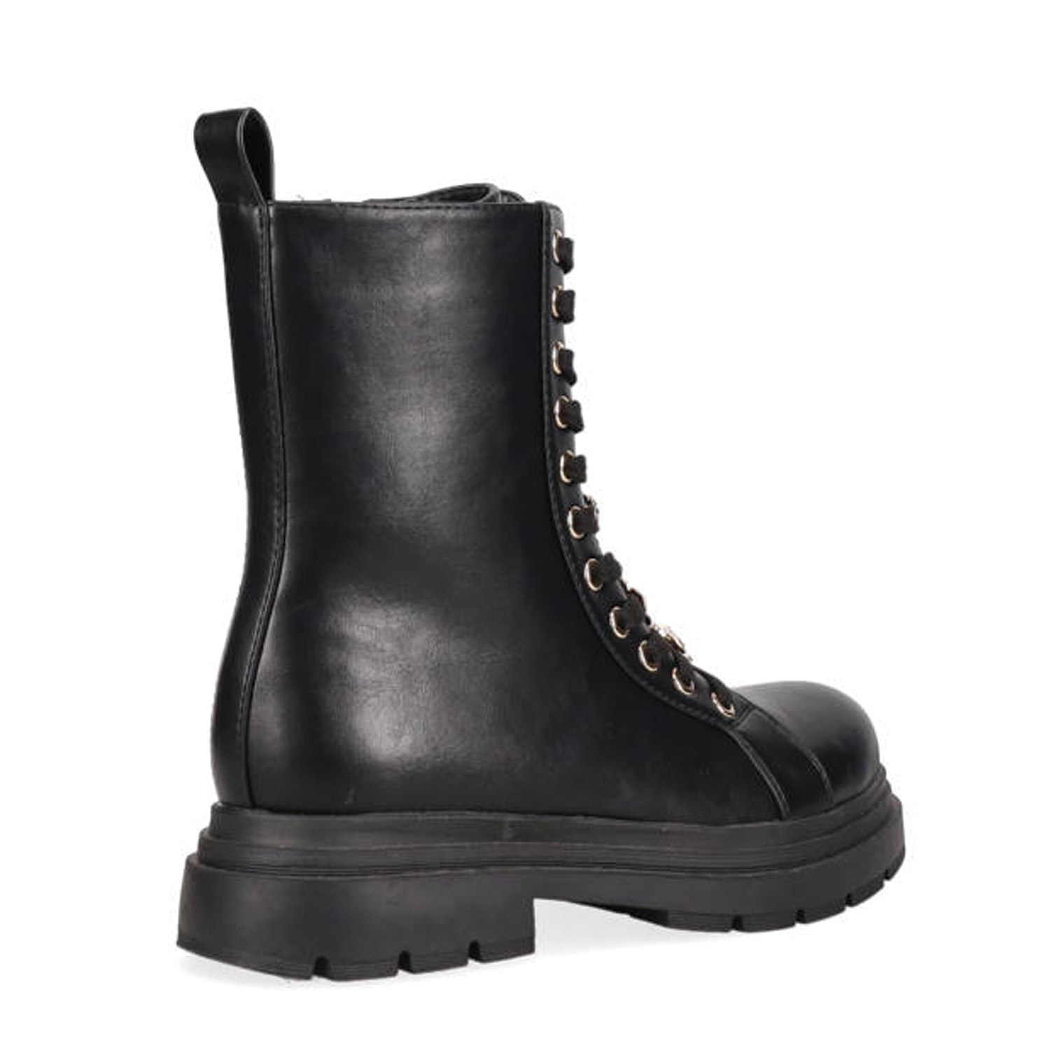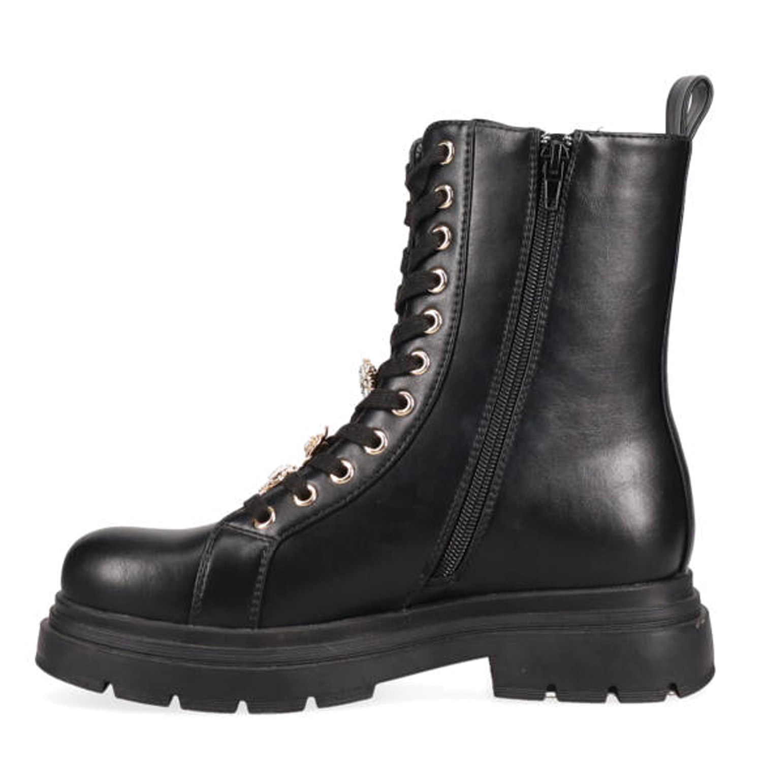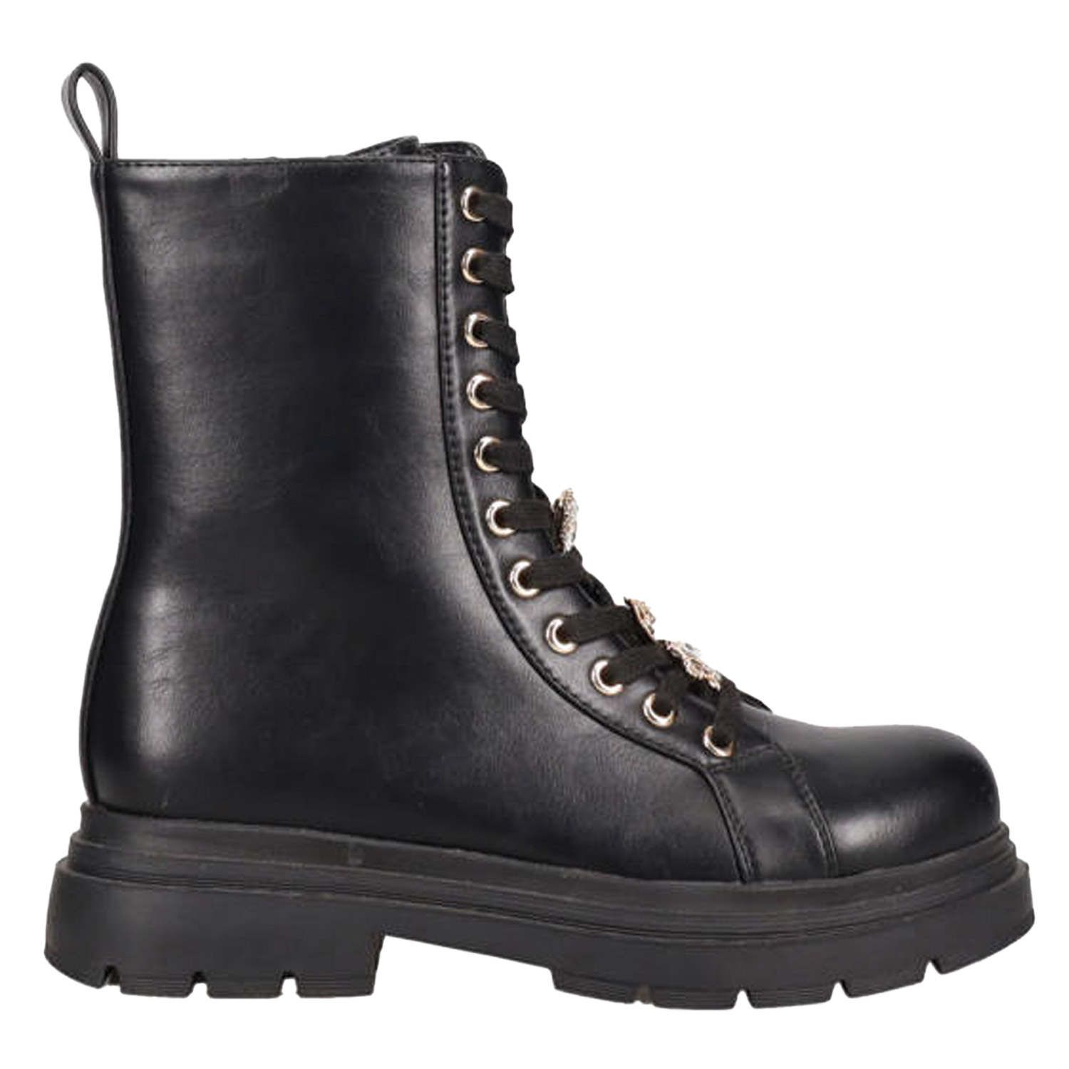 Μαύρο αρβυλάκι. Διαθέτει τρακτερωτή σόλα, χοντρό τακούνι και διακοσμητικά charms. Δένει με κορδόνια και φερμουάρ για πιο εύκολη και άνετη εφαρμογή.