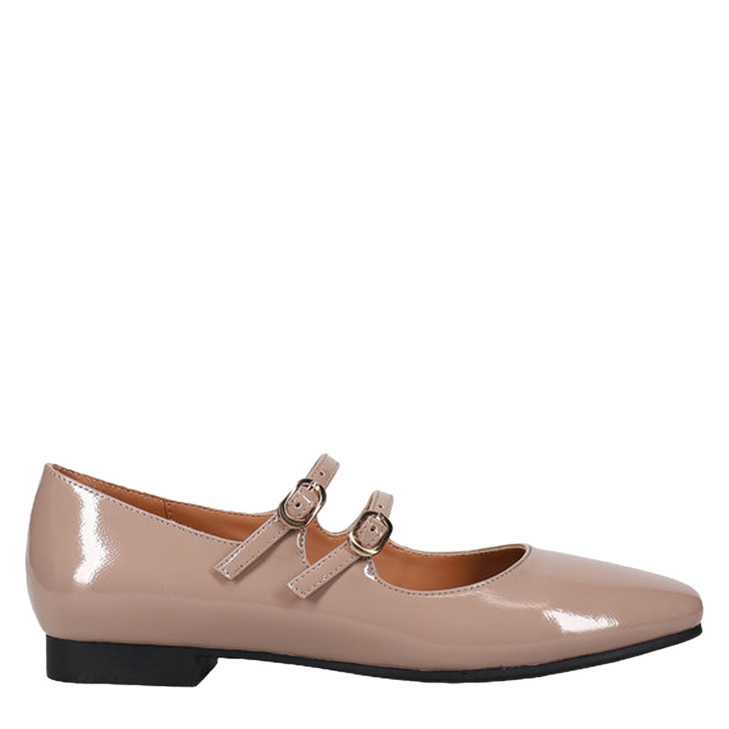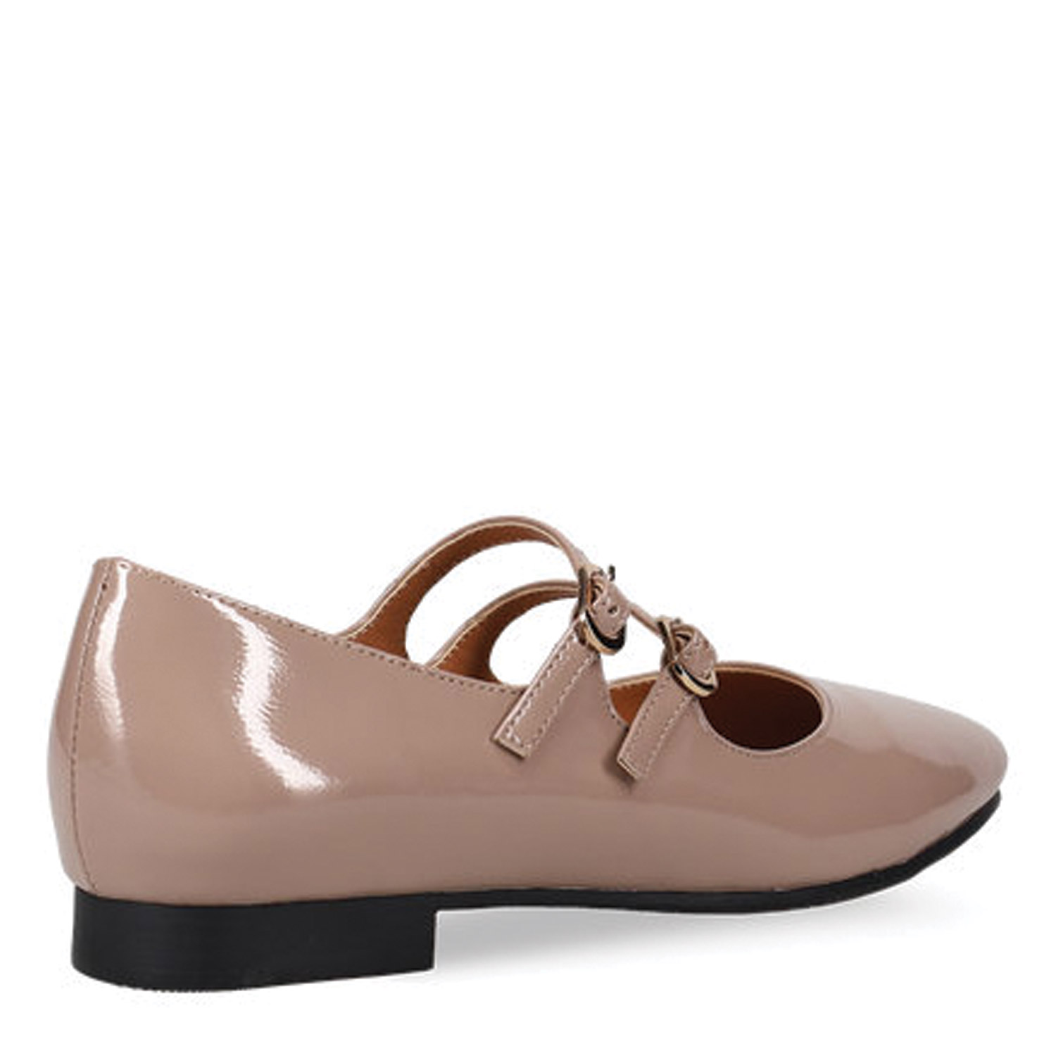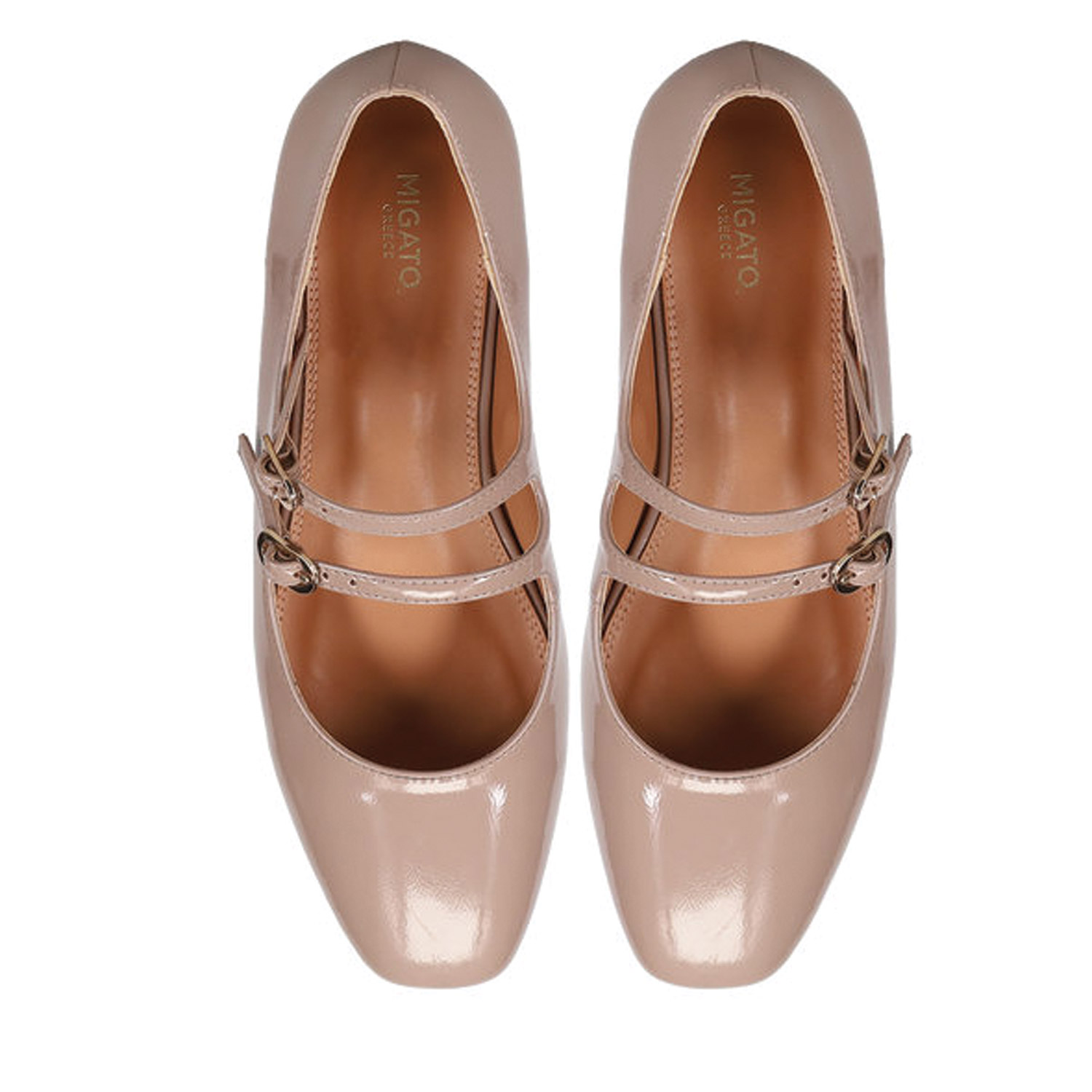 Μπεζ μπαλαρίνα λουστρίνι Mary Jane. Κλείνει με δύο ρυθμιζόμενα λουράκια με αγκράφες.