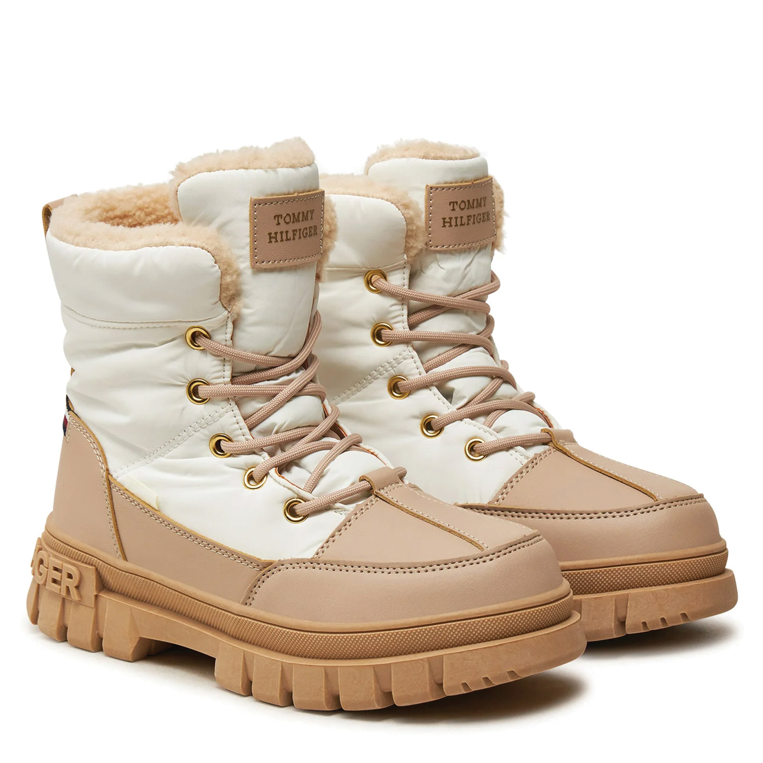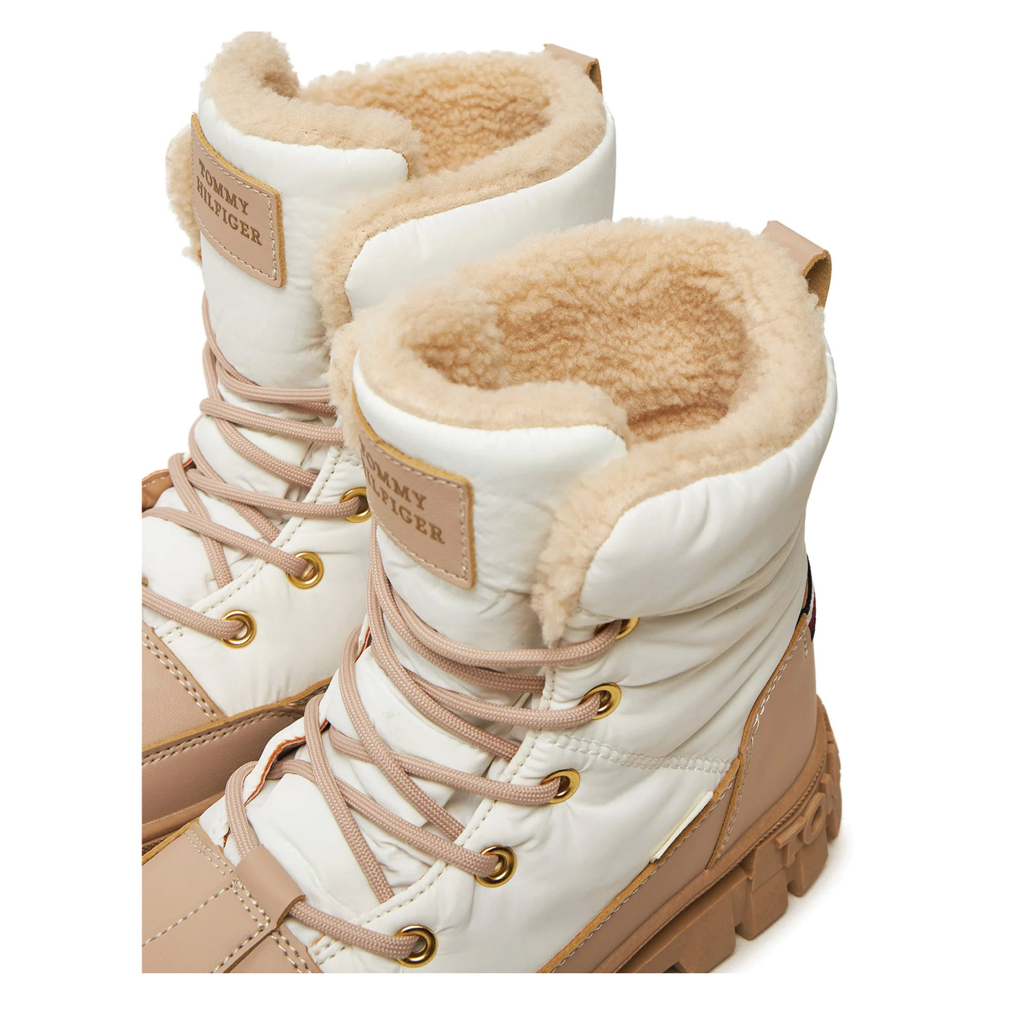 Tommy Hilfiger γυναικείο μποτάκι χιονιού, σε λευκό-μπεζ χρώμα, κατασκευασμένο από ύφασμα και οικολογικό δέρμα. Ύψος τακουνιού 4εκ.