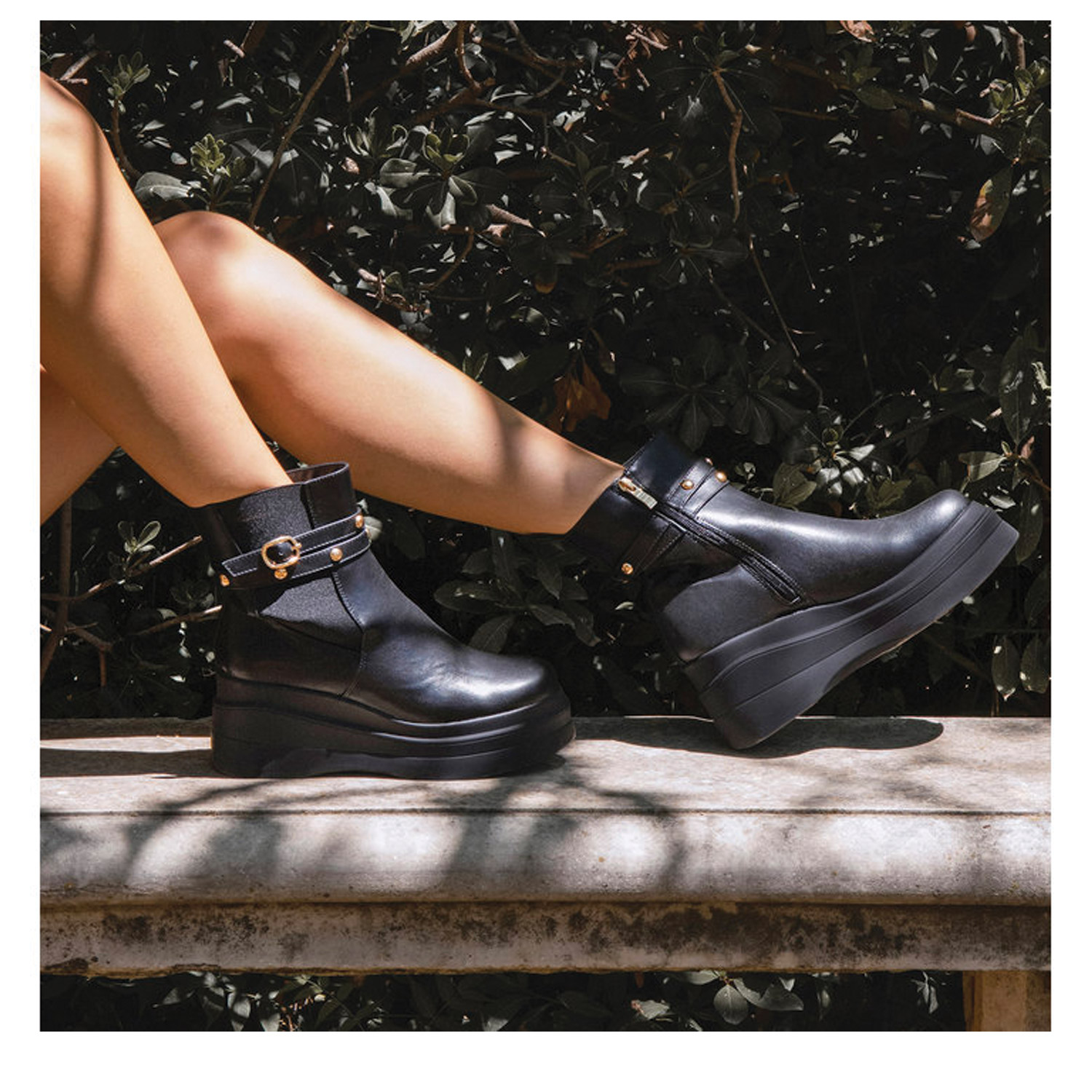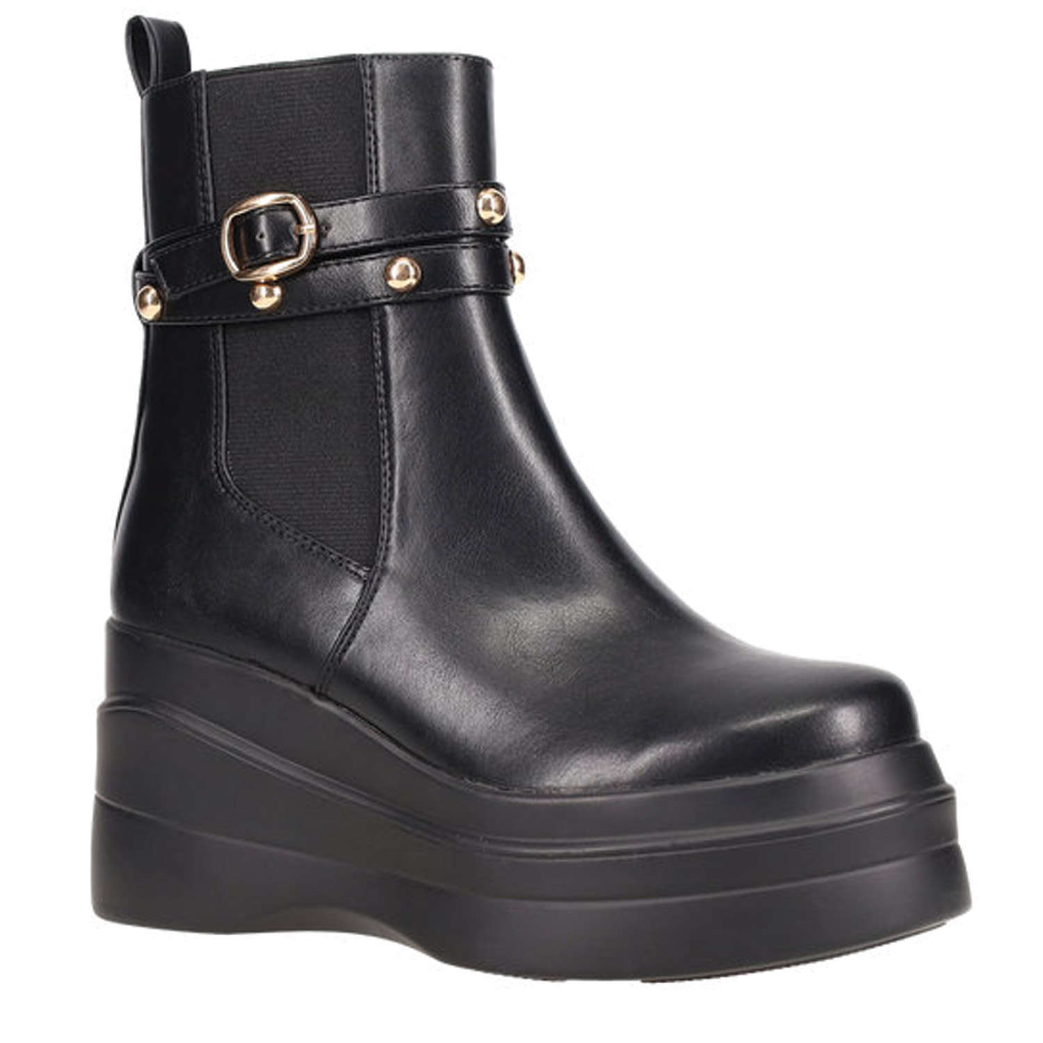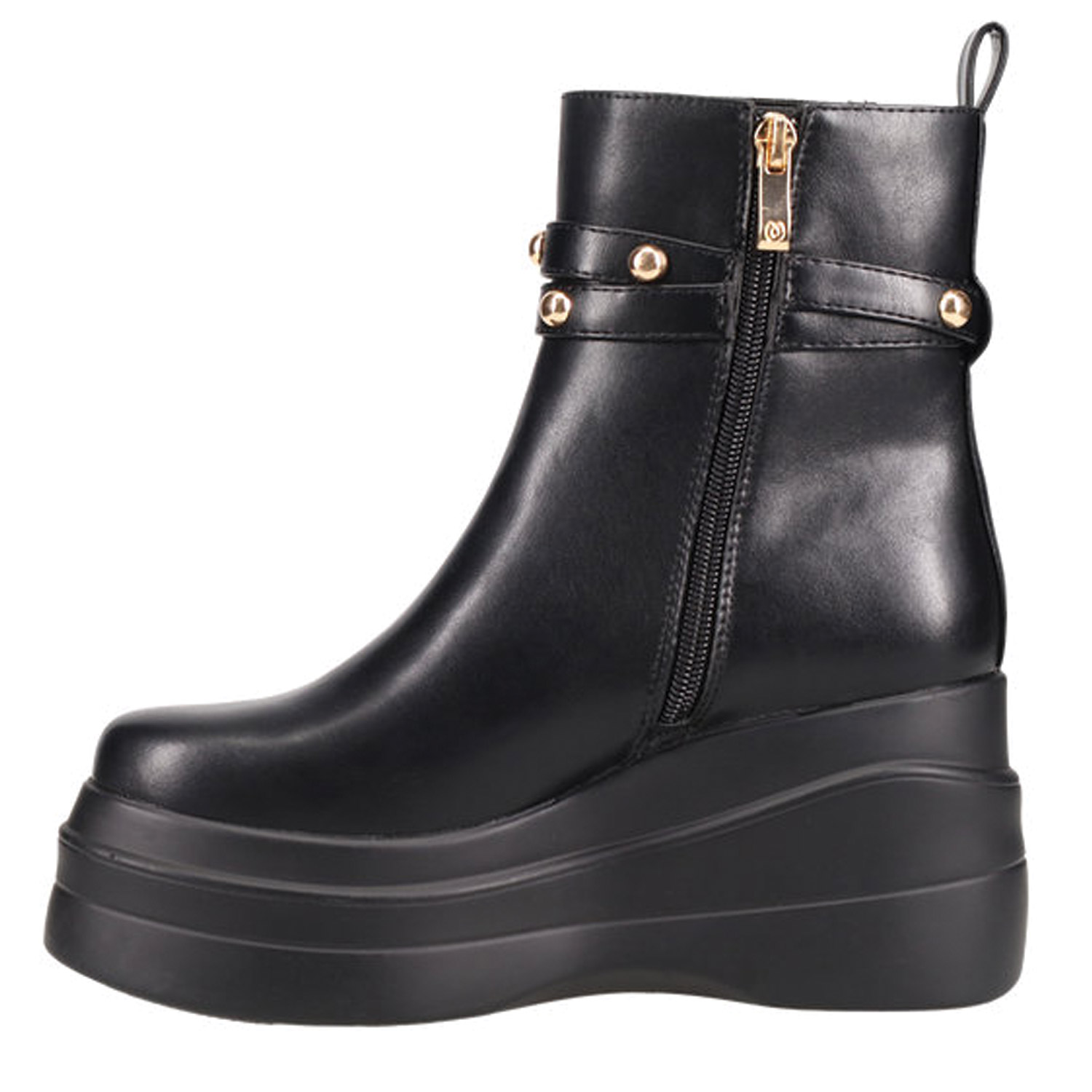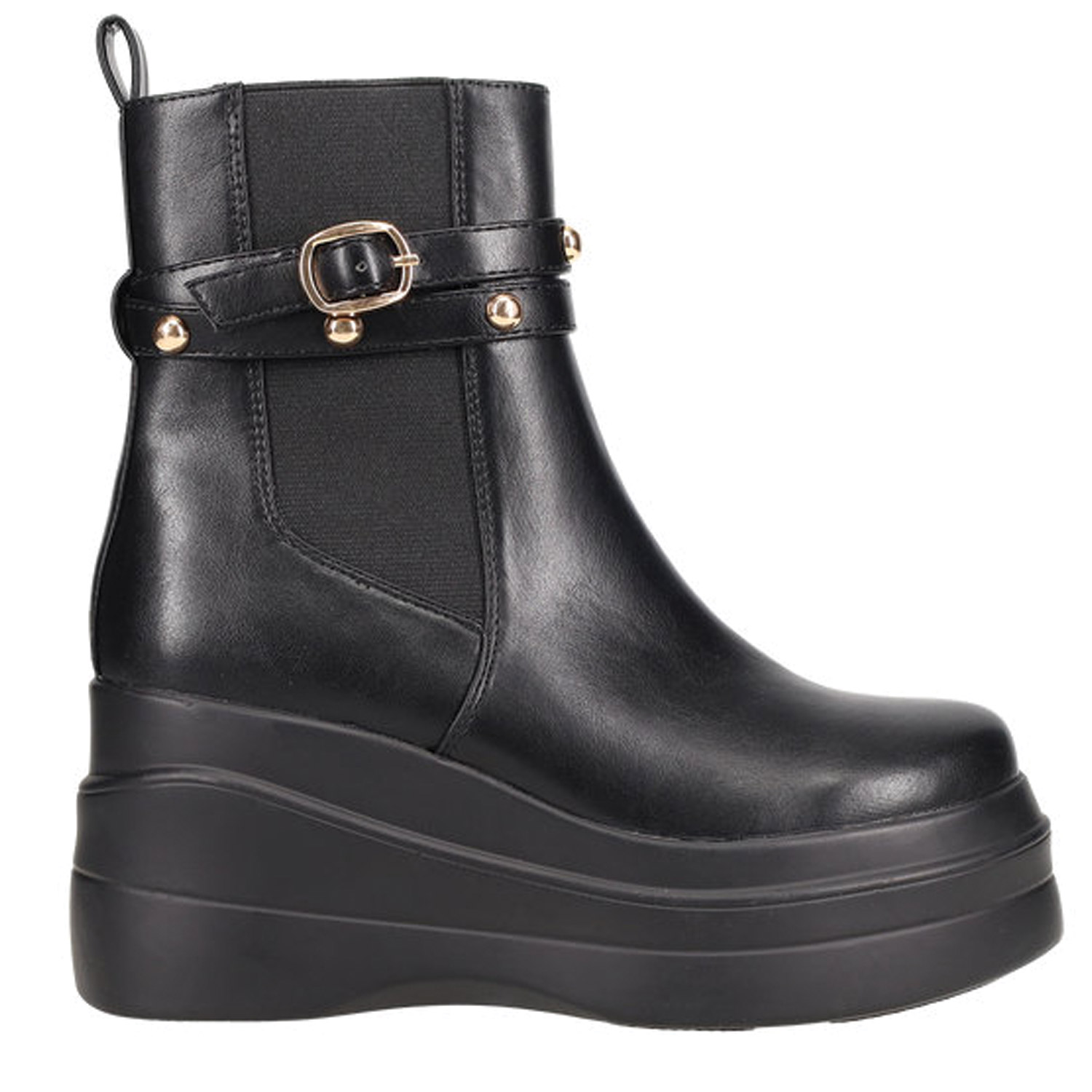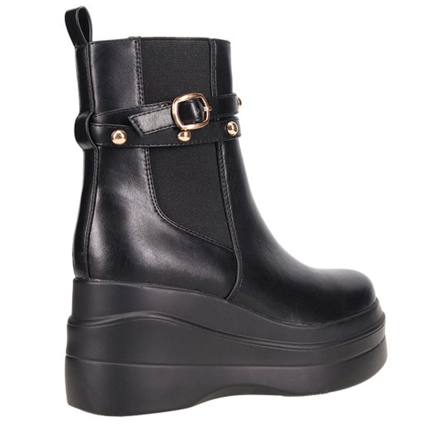 Μαύρο Chelsea μποτάκι με πλατφόρμα. Διαθέτει πλαϊνό ελαστικό πάνελ, διακοσμητικό λουράκι με χρυσές λεπτομέρειες. Κλείνει με φερμουάρ στο πλάι.