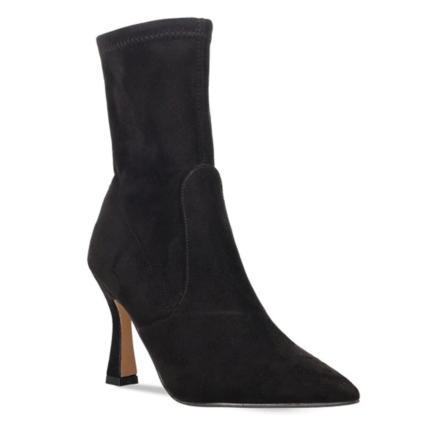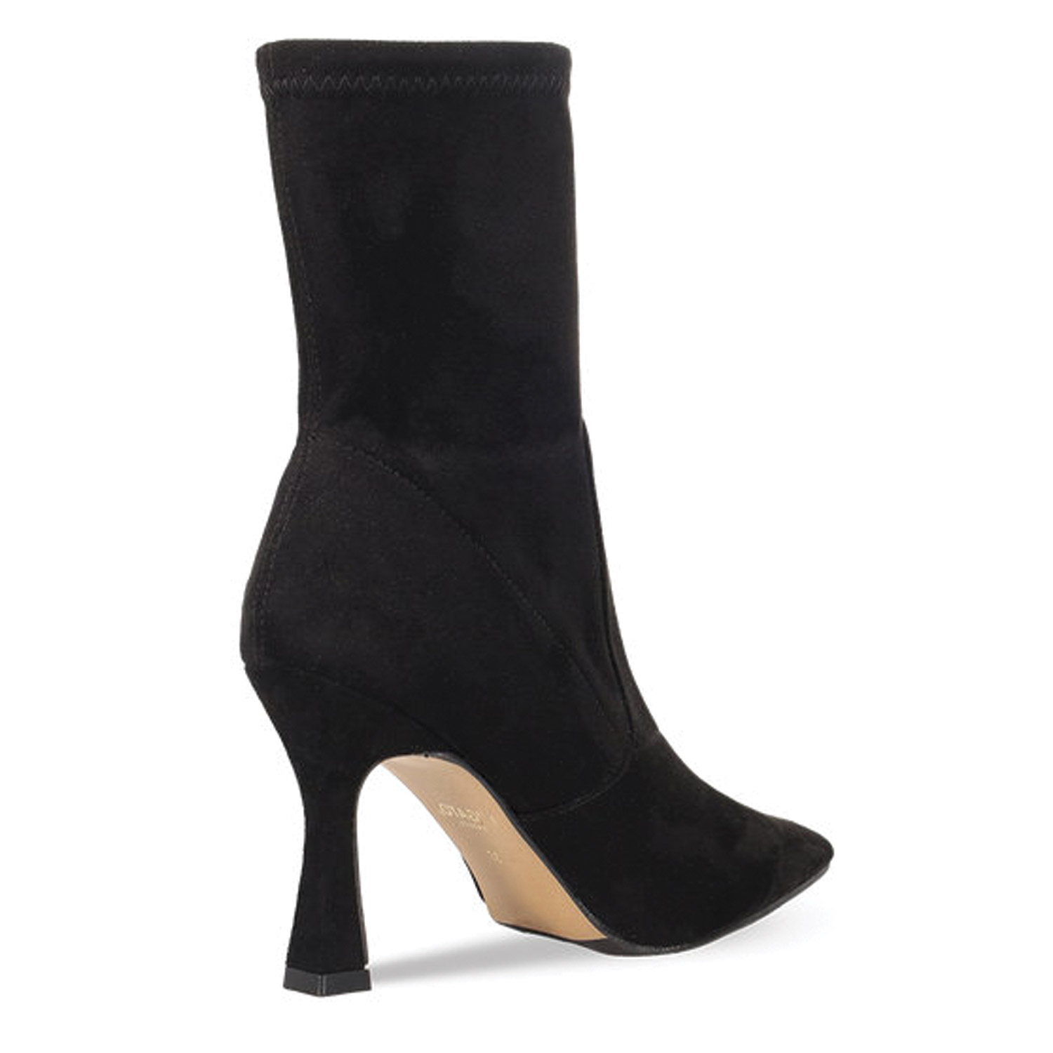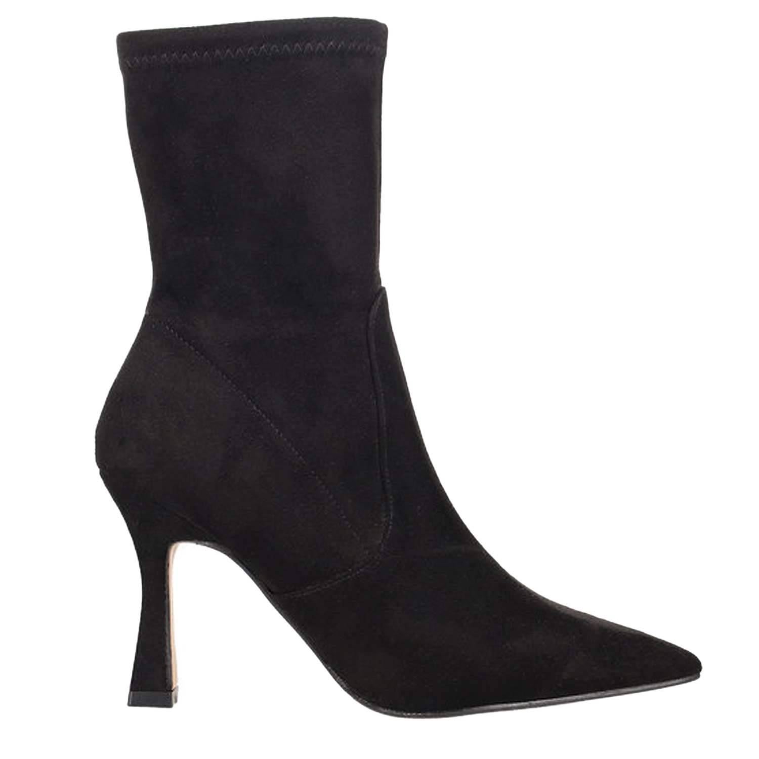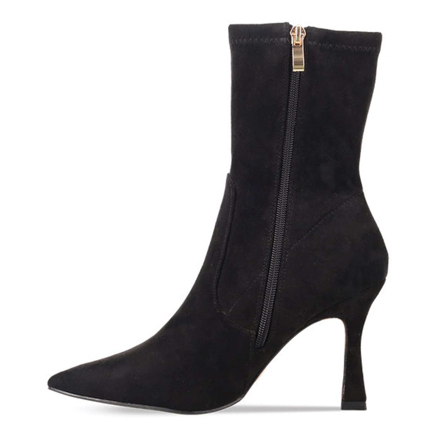 Μαύρο μυτερό μποτάκι με σουέντ υφή. Διαθέτει ψηλό λεπτό τακούνι. Κλείνει με εσωτερικό φερμουάρ.