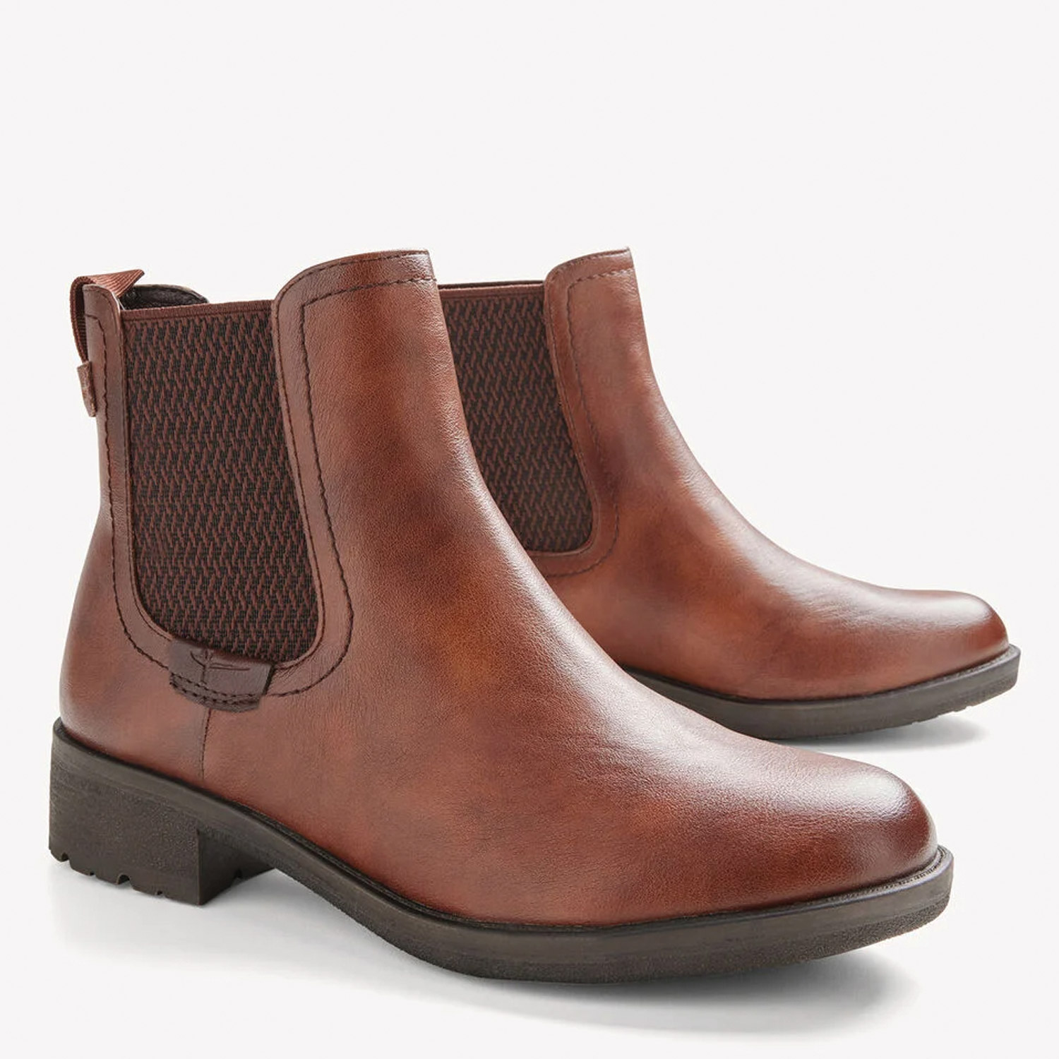 Με αυτές τα μποτάκια Chelsea από την Tamaris Essentials, κάθε βήμα σας θα είναι ταυτόχρονα casual και κομψό. Το στιβαρό, στιβαρό τακούνι παρέχει στήριξη, ενώ τα ελαστικά ένθετα και η πρακτική θηλιά κάνουν την εφαρμογή τους παιχνιδάκι. Η επίπεδη, δομημένη σόλα εξασφαλίζει άνεση για όλες τις καθημερινές σας περιπέτειες - είτε πρόκειται για φθινοπωρινές βόλτες είτε για μια βόλτα στην πόλη.