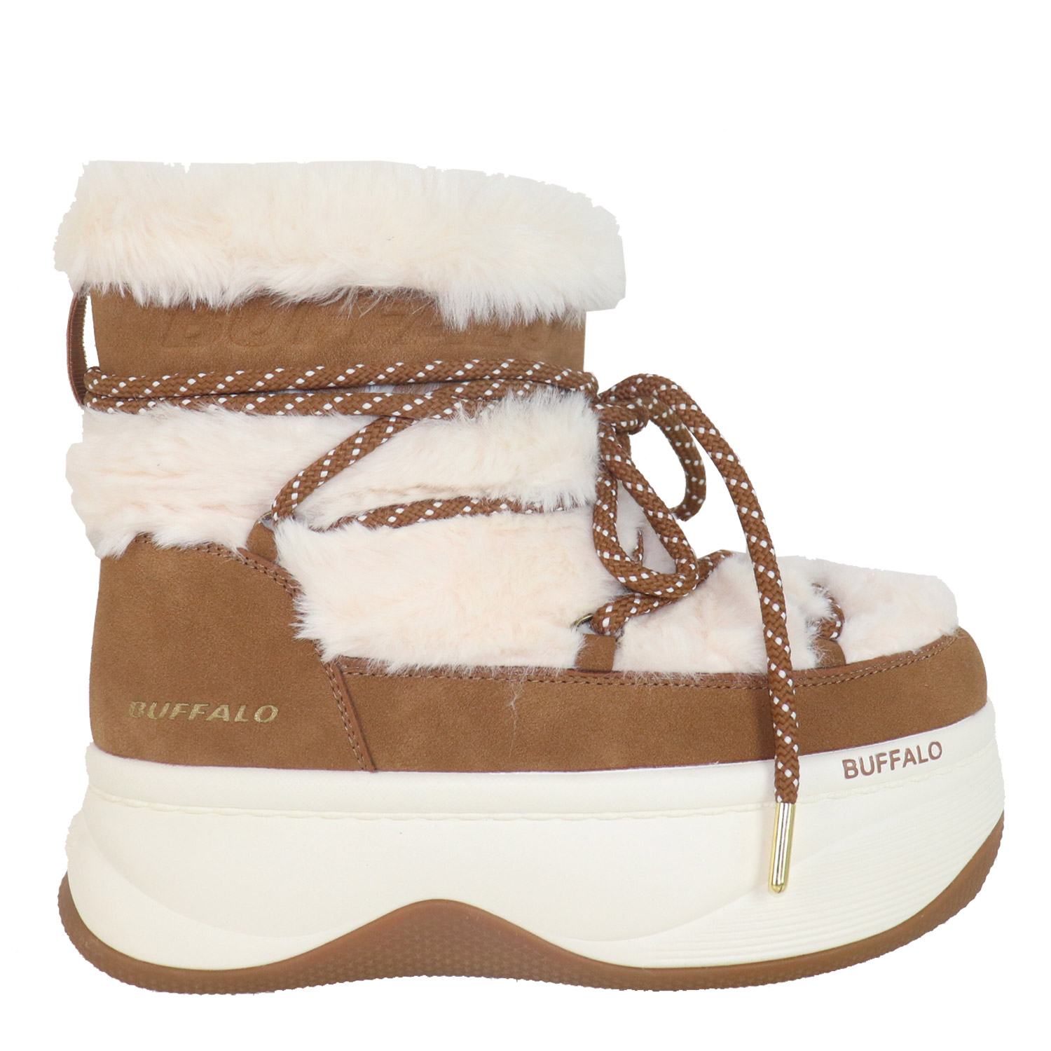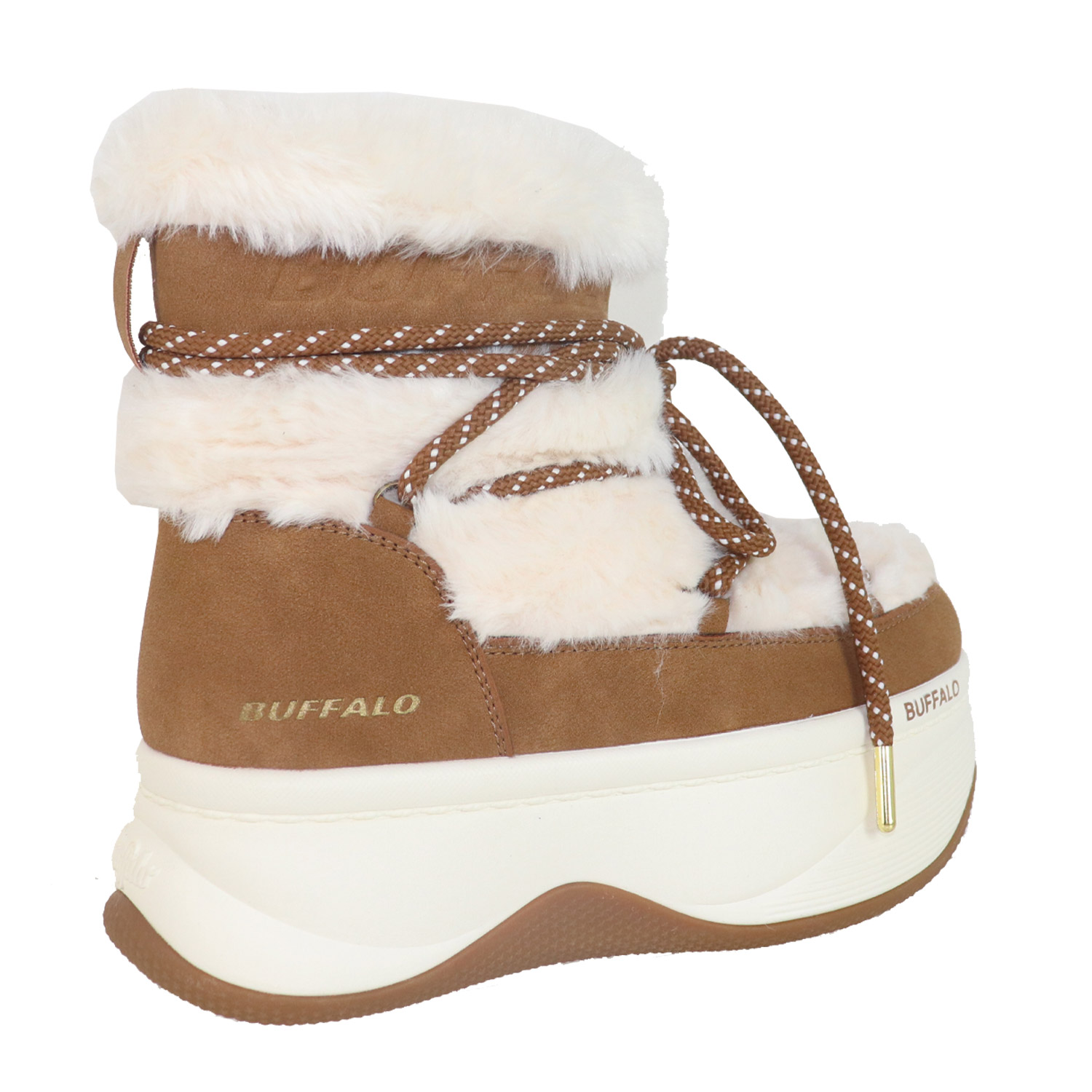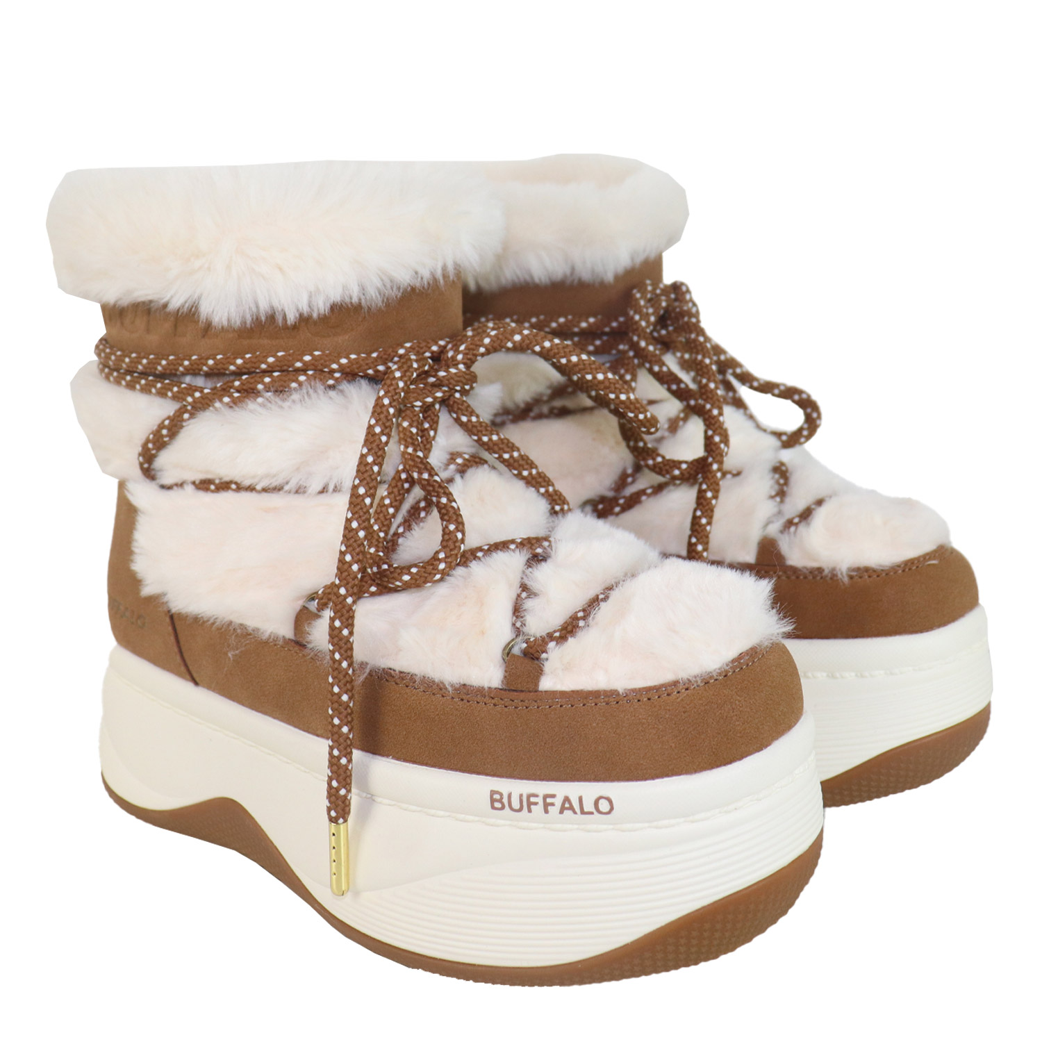 Buffalo γυναικείο μποτάκι, σε ταμπά χρώμα, κατασκευασμένο από οικολογικό δέρμα και γούνα, με ανατομικό πάτο από memory foam. Ύψος σόλας 7εκ.