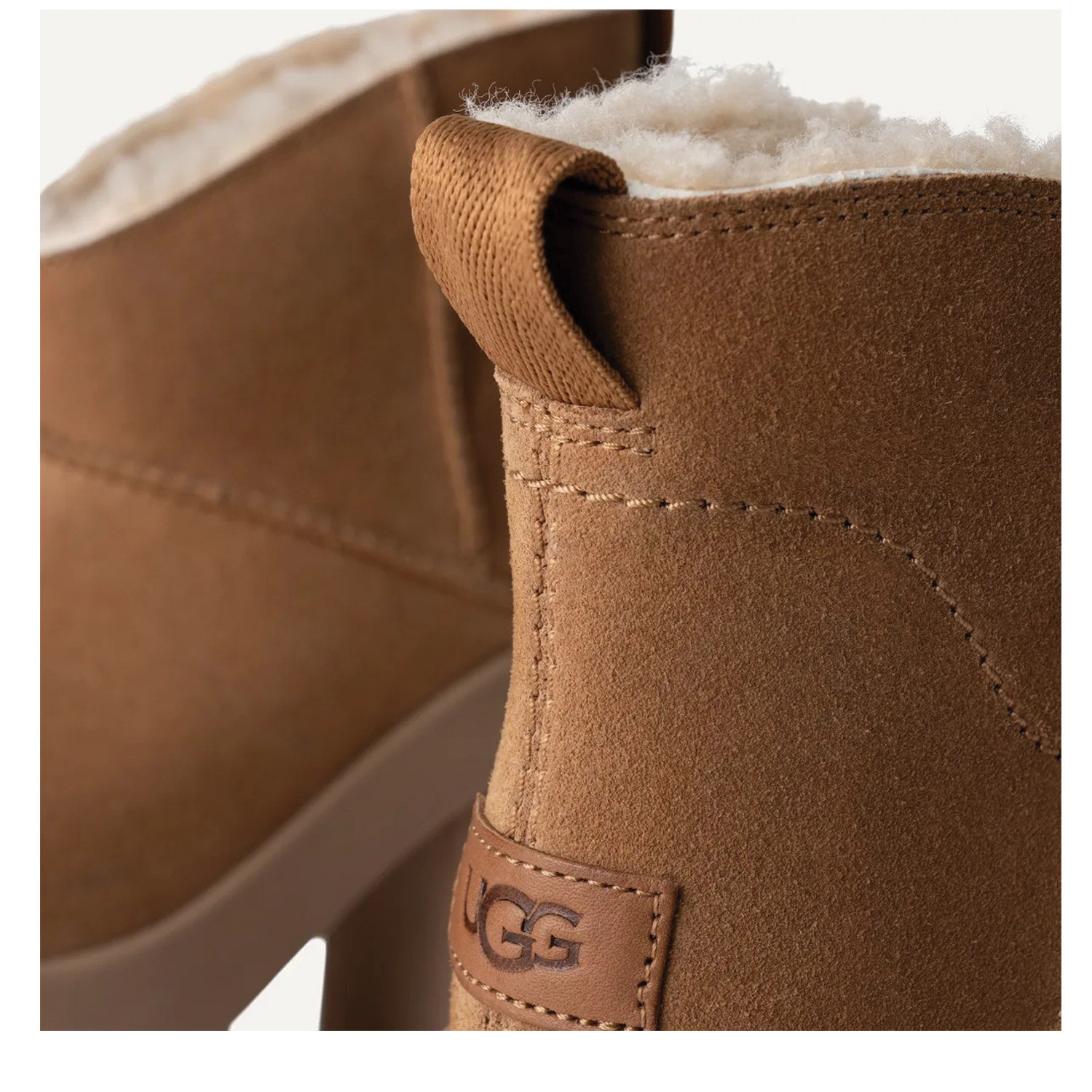 Γυναικεία μποτάκια με πλατφόρμα της εταιρίας Ugg Australia. Είναι κατασκευασμένα από καστόρι, ένα μαλακό και εύκαμπτο υλικό με απαλή υφή. Διαθέτουν ενδιάμεση σόλα με αφρό EVA, η οποία προσφέρει αποτελεσματικότερη αντικραδασμική προστασία και ξεκούραστο πάτημα. Η τεχνολογία Gore-Tex προσφέρει απόλυτη στεγανότητα και εξαιρετική διαπνοή.