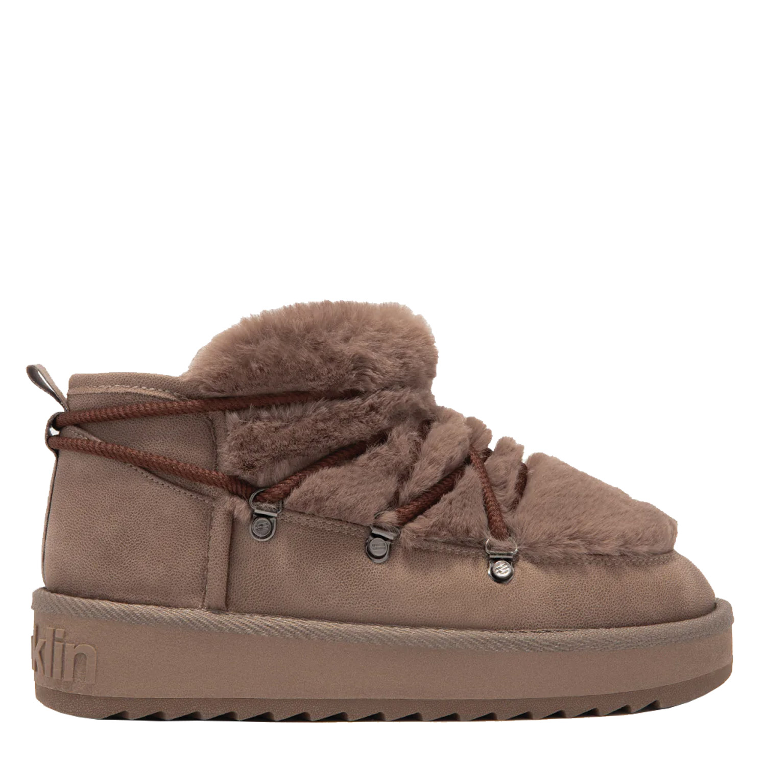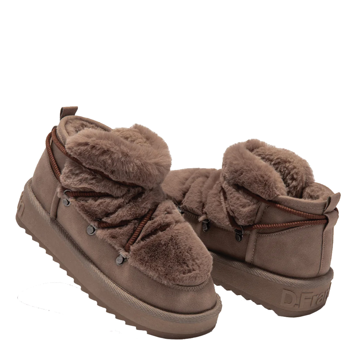 D.Franklin γυναικείο μποτάκι, σε καφέ χρώμα, κατασκευασμένο από οικολογικό δέρμα και γούνα. Ύψος σόλας 3εκ.