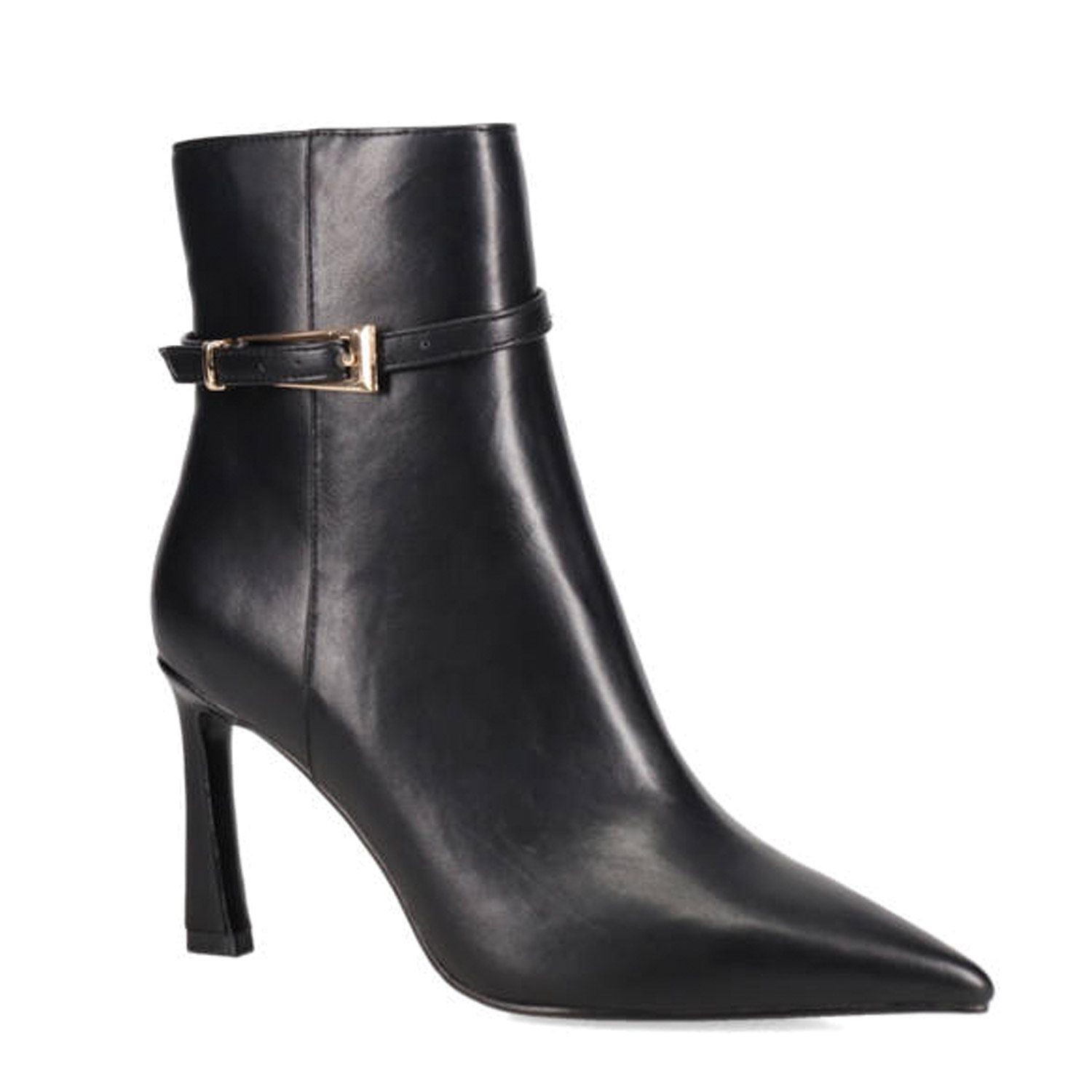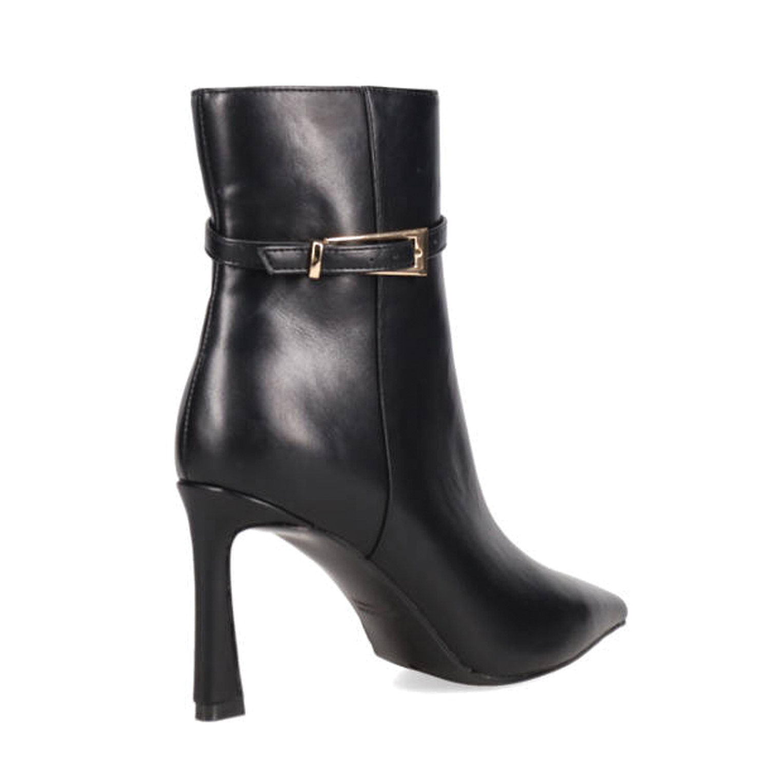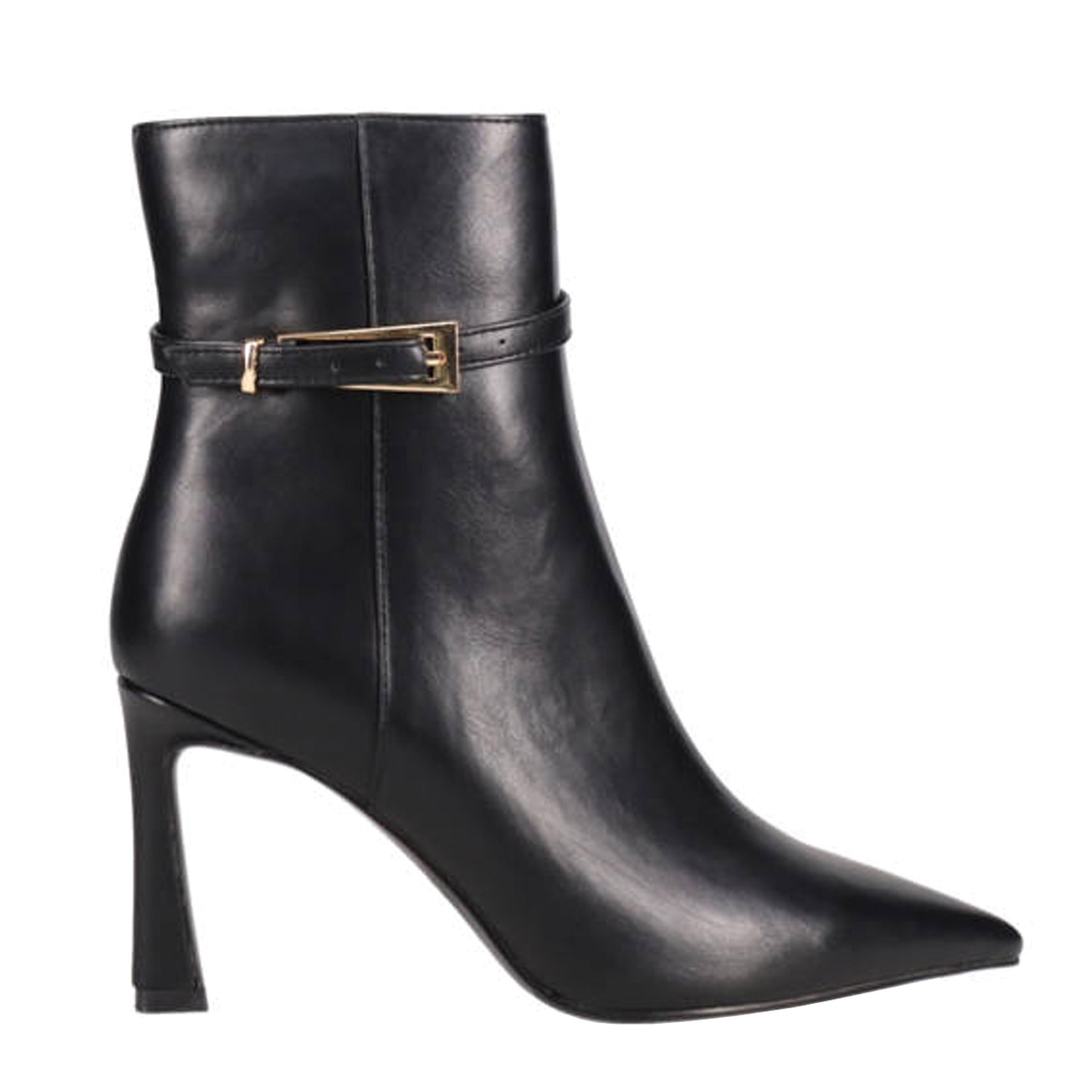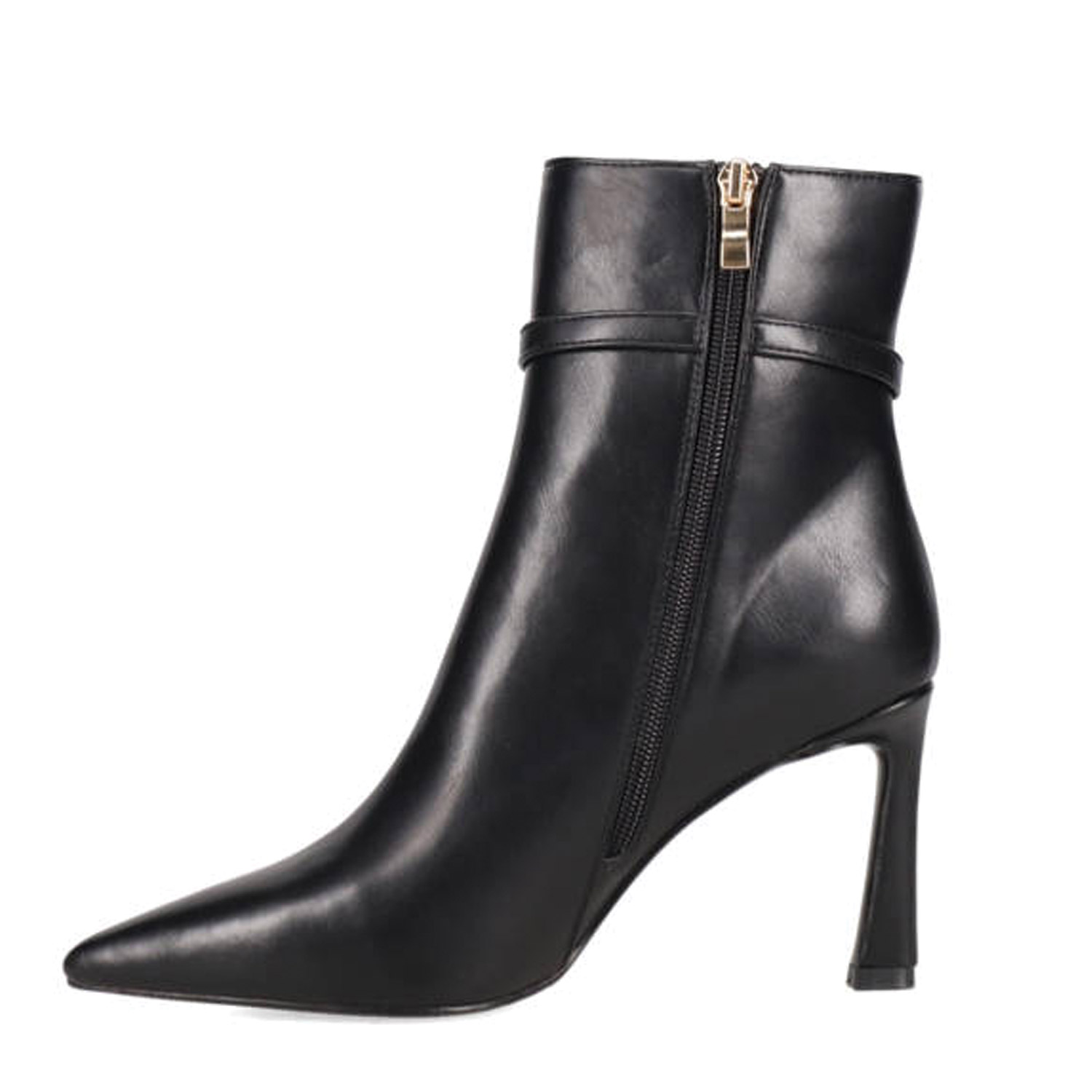 Μαύρο μποτάκι μέχρι πάνω από τον αστράγαλο. Διαθέτει διακοσμητικό λουράκι, μυτερή φόρμα και ψηλό τακούνι. Κλείνει με φερμουάρ.