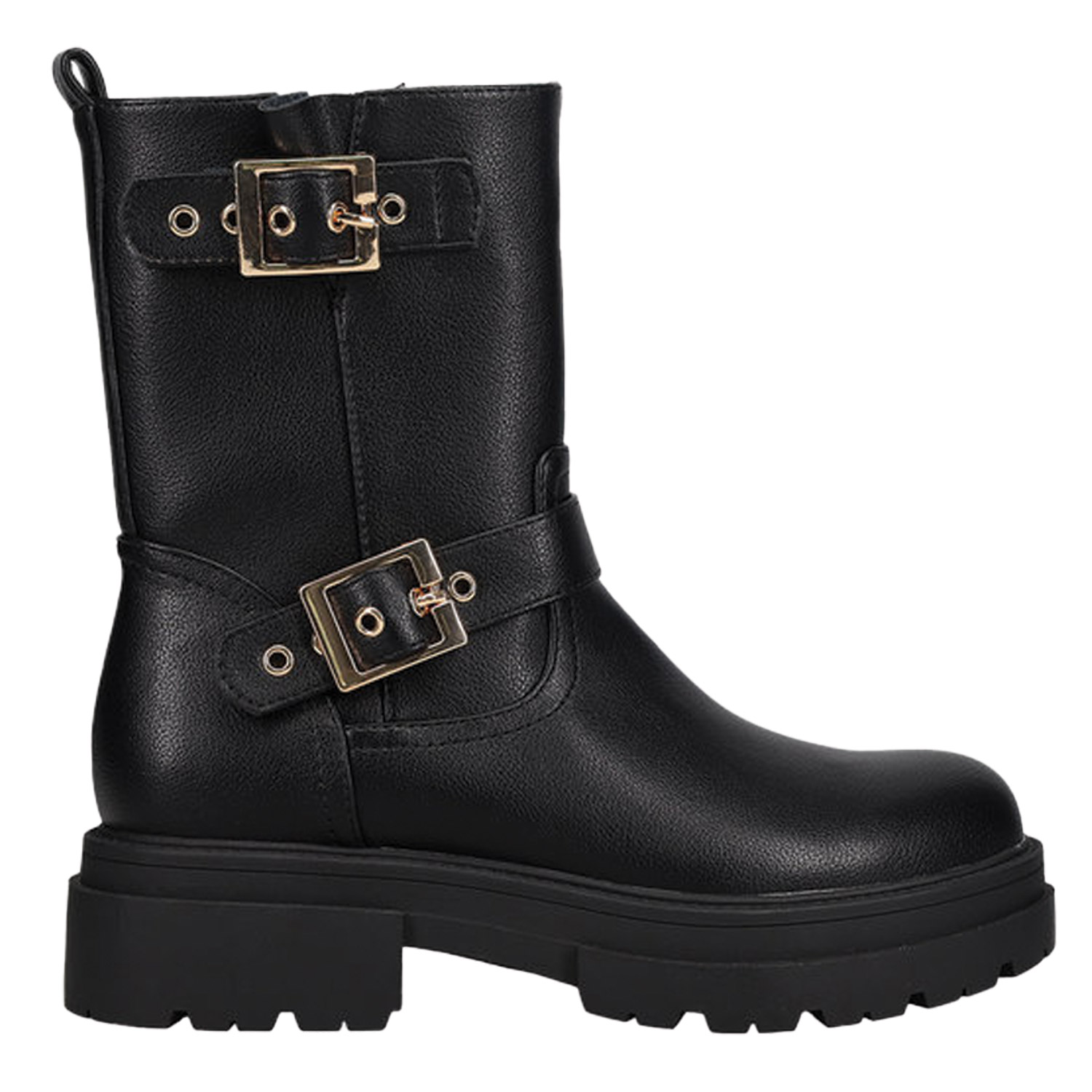 Μαύρο μποτάκι biker μέχρι τη μέση της γάμπας. Διαθέτει διακοσμητικά λουράκια με αγκράφες. Κλείνει με φερμουάρ στο πλάι.