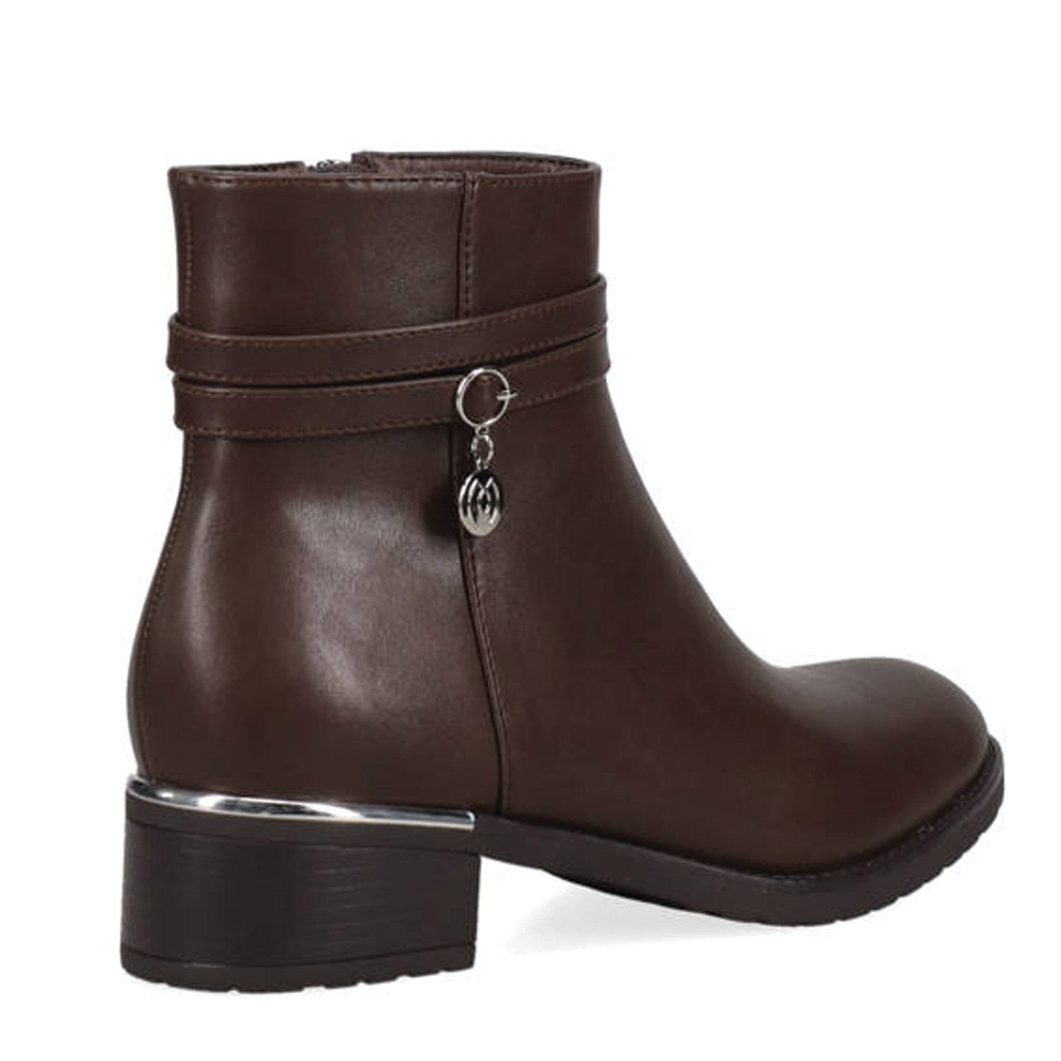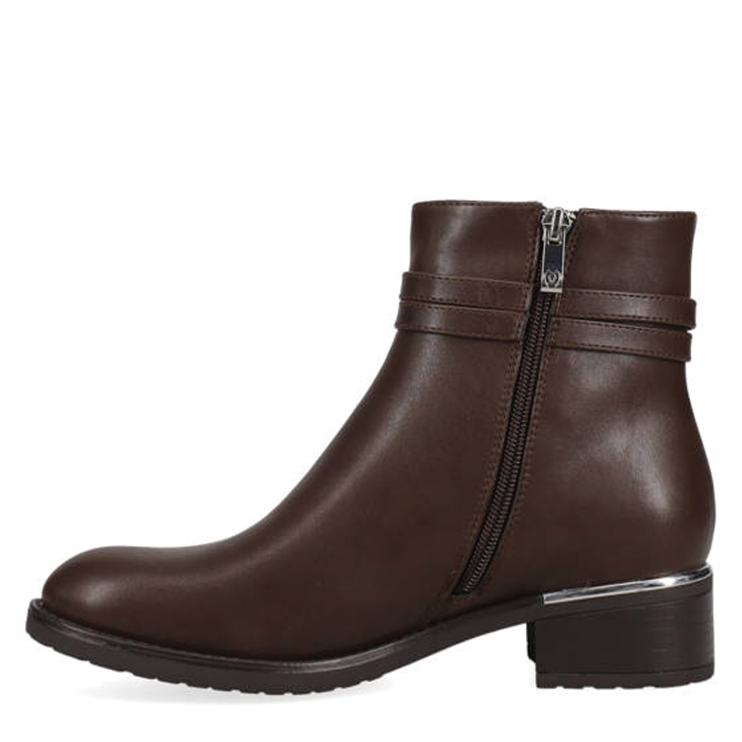 Καφέ μποτάκι μέχρι πάνω από τον αστράγαλο. Διαθέτει χαμηλό χοντρό τακούνι. Κλείνει με φερμουάρ στο πλάι.