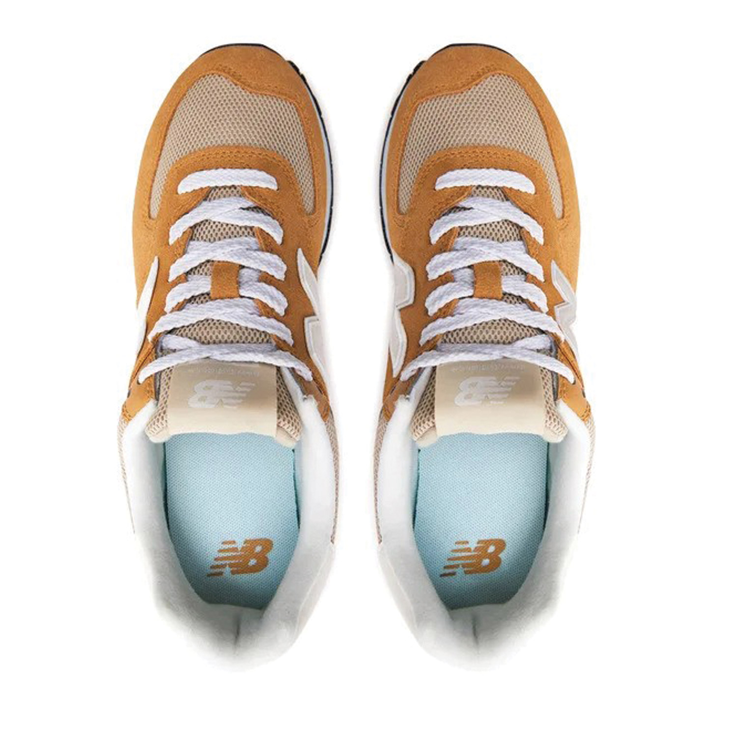 New Balance 574 γυναικείο sneaker, σε μπεζ χρώμα, κατασκευασμένο από ύφασμα και καστόρι.