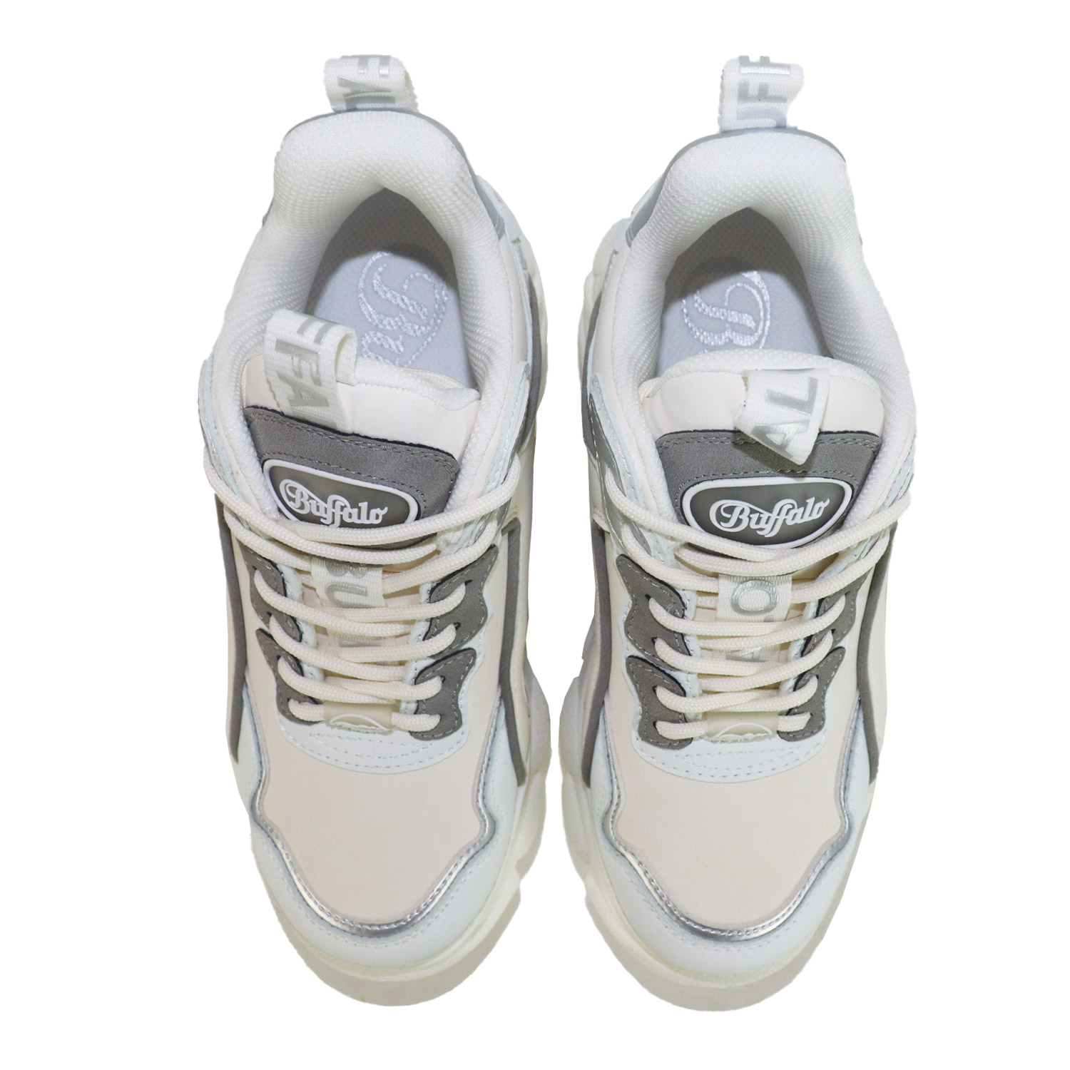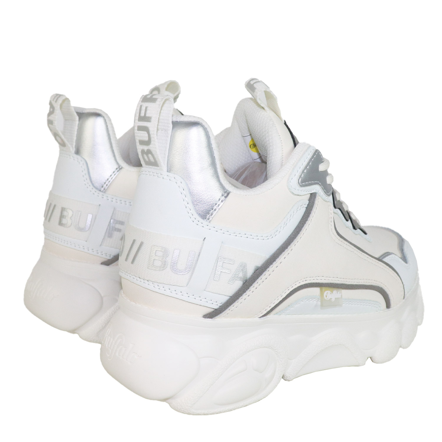 Buffalo γυναικείο sneaker, σε λευκό χρώμα, κατασκευασμένο από οικολογικό δέρμα, με ανατομικό πάτο, κατασκευασμένο από vegan υλικά. Ύψος τακουνιού 4εκ.