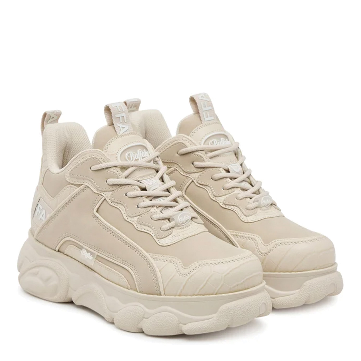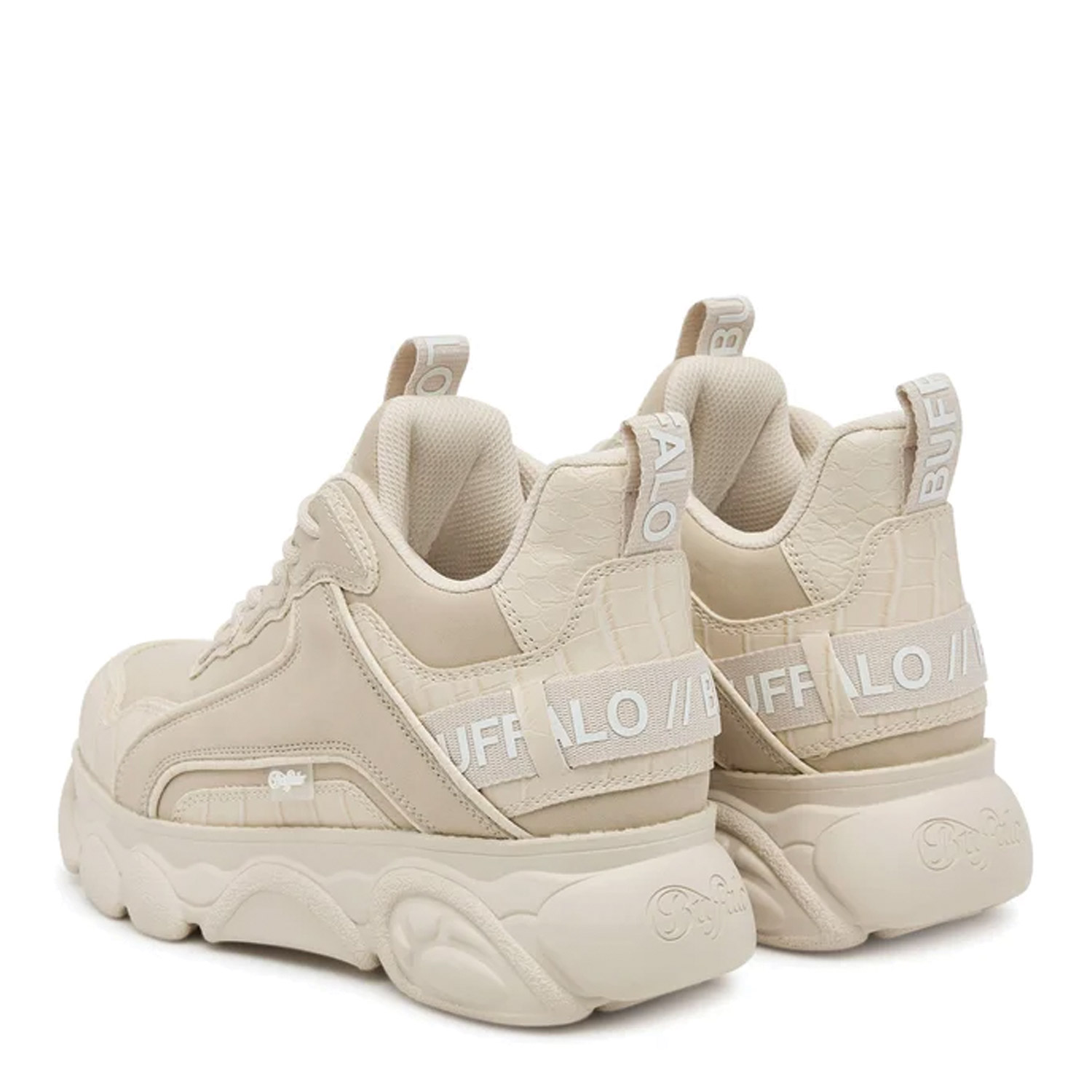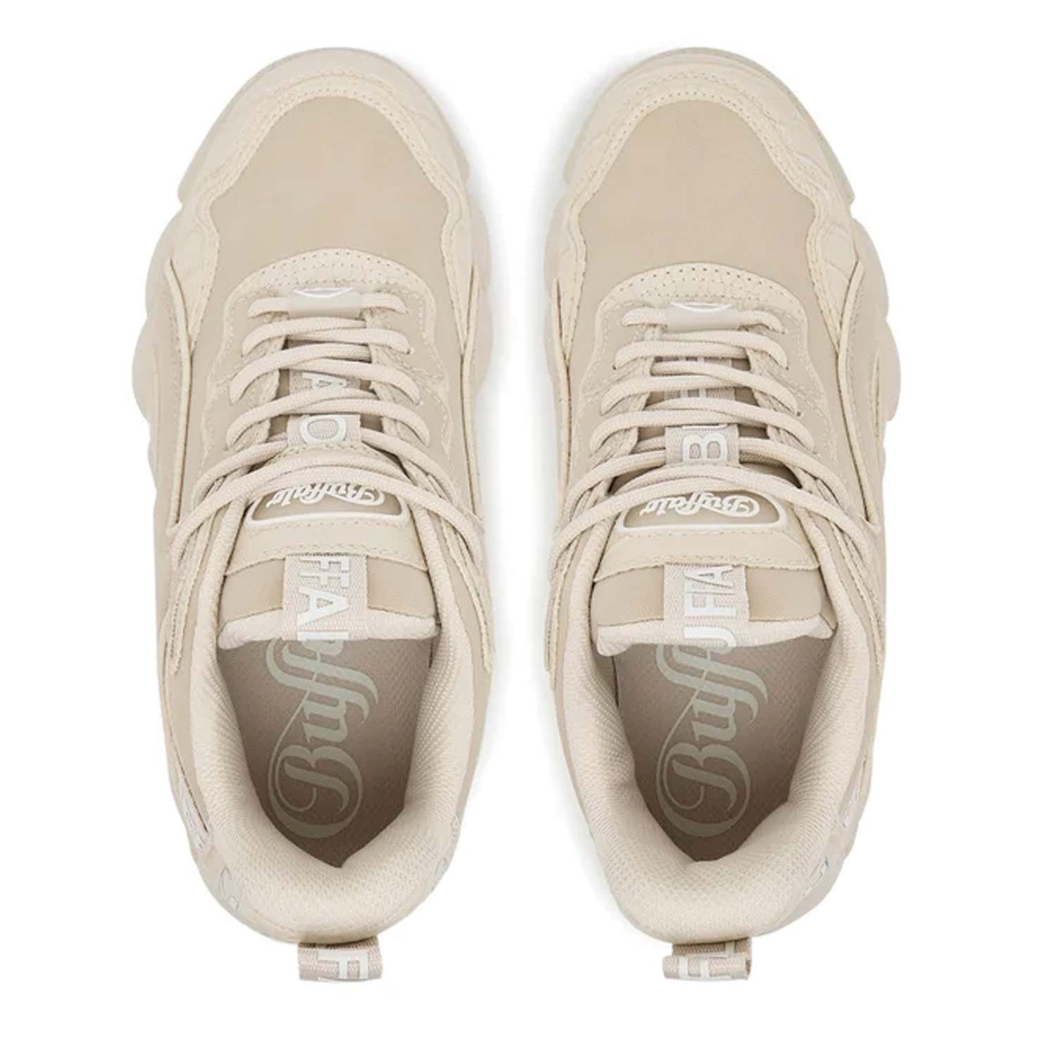 Buffalo γυναικείο sneaker, σε μπεζ χρώμα, κατασκευασμένο από οικολογικό δέρμα, με ανατομικό πάτο, κατασκευασμένο από vegan υλικά. Ύψος τακουνιού 4εκ.