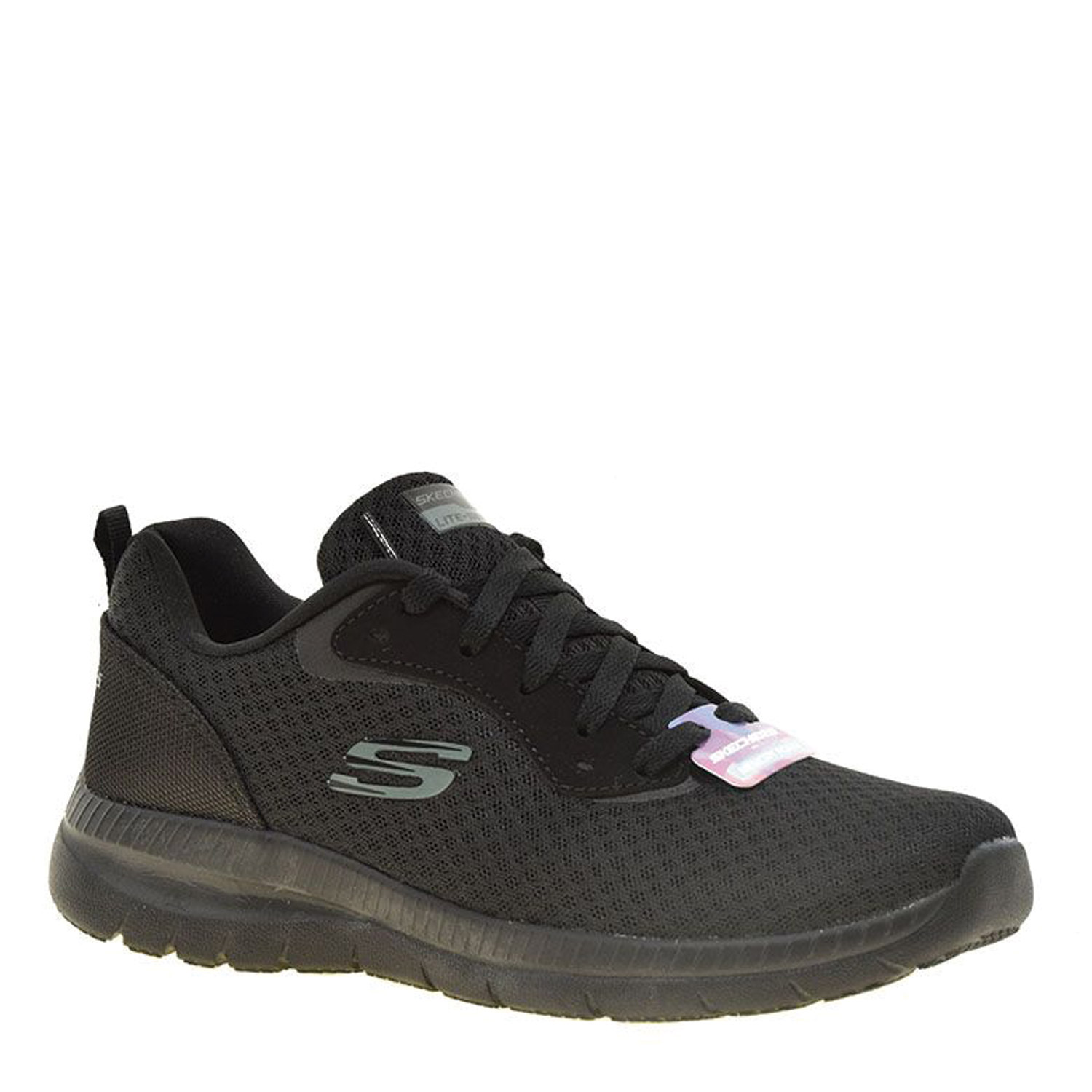 Skechers γυναικείο sneaker, σε μαύρο χρώμα, κατασκευασμένο από ύφασμα, με άνετη σόλα πλήρους μήκους Memory Foam με αντικραδασμική προστασία. Υποστηρικτική ενδιάμεση σόλα που απορροφά τους κραδασμούς. Ύψος σόλας 3.5εκ.
