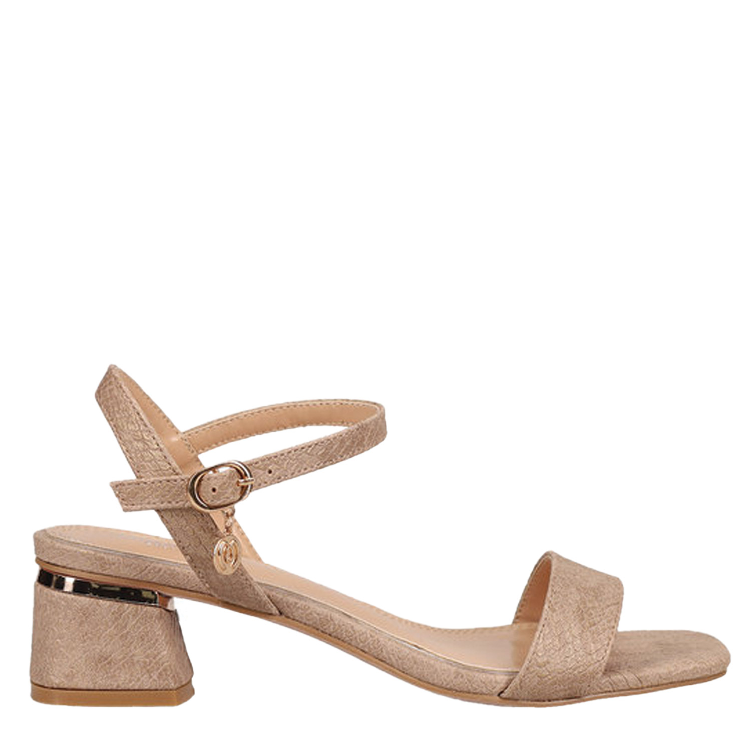 Μπεζ πέδιλο με snakeskin υφή. Διαθέτει φάσα και χαμηλό χοντρό τακούνι. Δένει με ρυθμιζόμενο λουράκι αστραγάλου με αγκράφα.