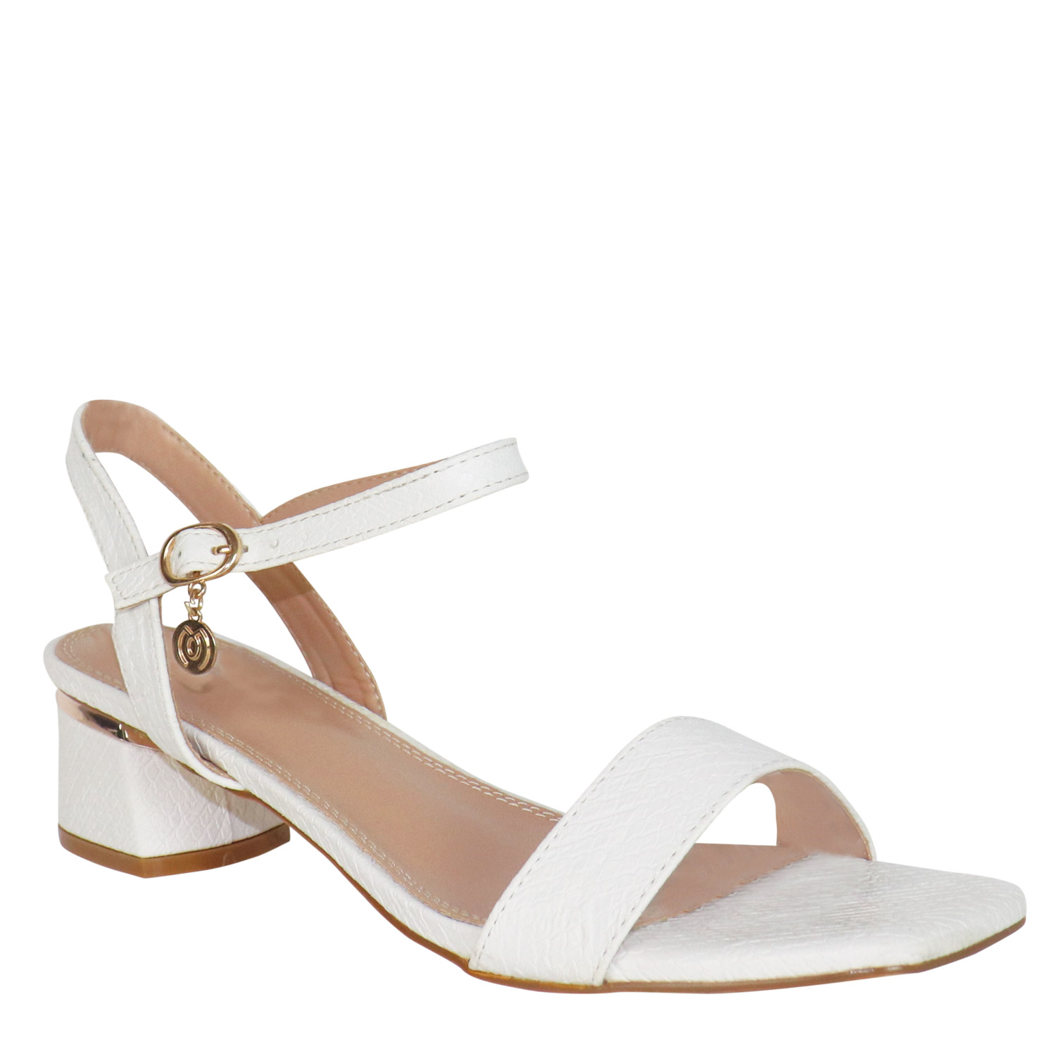 Λευκό πέδιλο με snakeskin υφή. Διαθέτει φάσα και χαμηλό χοντρό τακούνι. Δένει με ρυθμιζόμενο λουράκι αστραγάλου με αγκράφα.