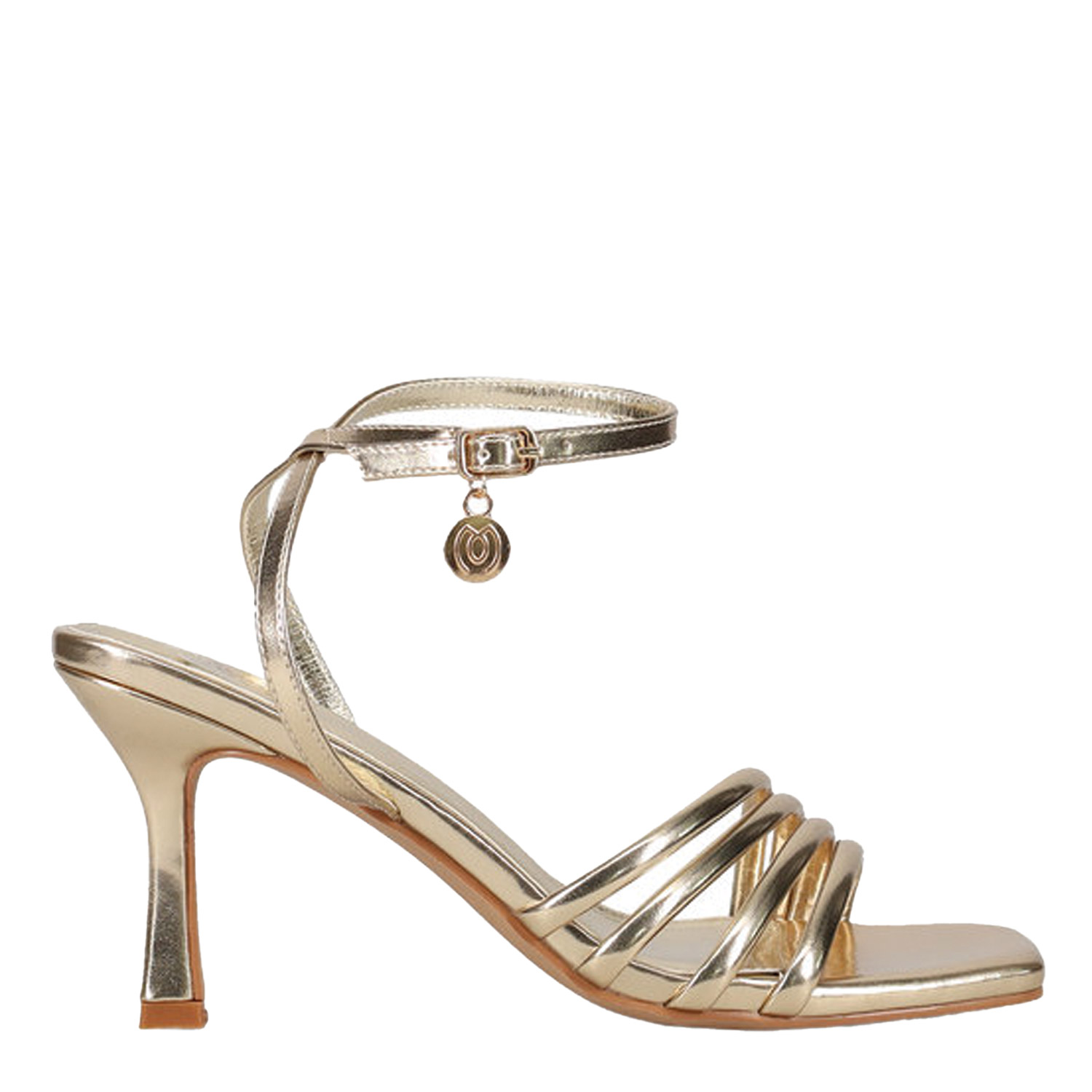 Χρυσό πέδιλο. Διαθέτει λεπτά λουράκια και ψηλό τακούνι. Δένει με ρυθμιζόμενο λουράκι αστραγάλου.