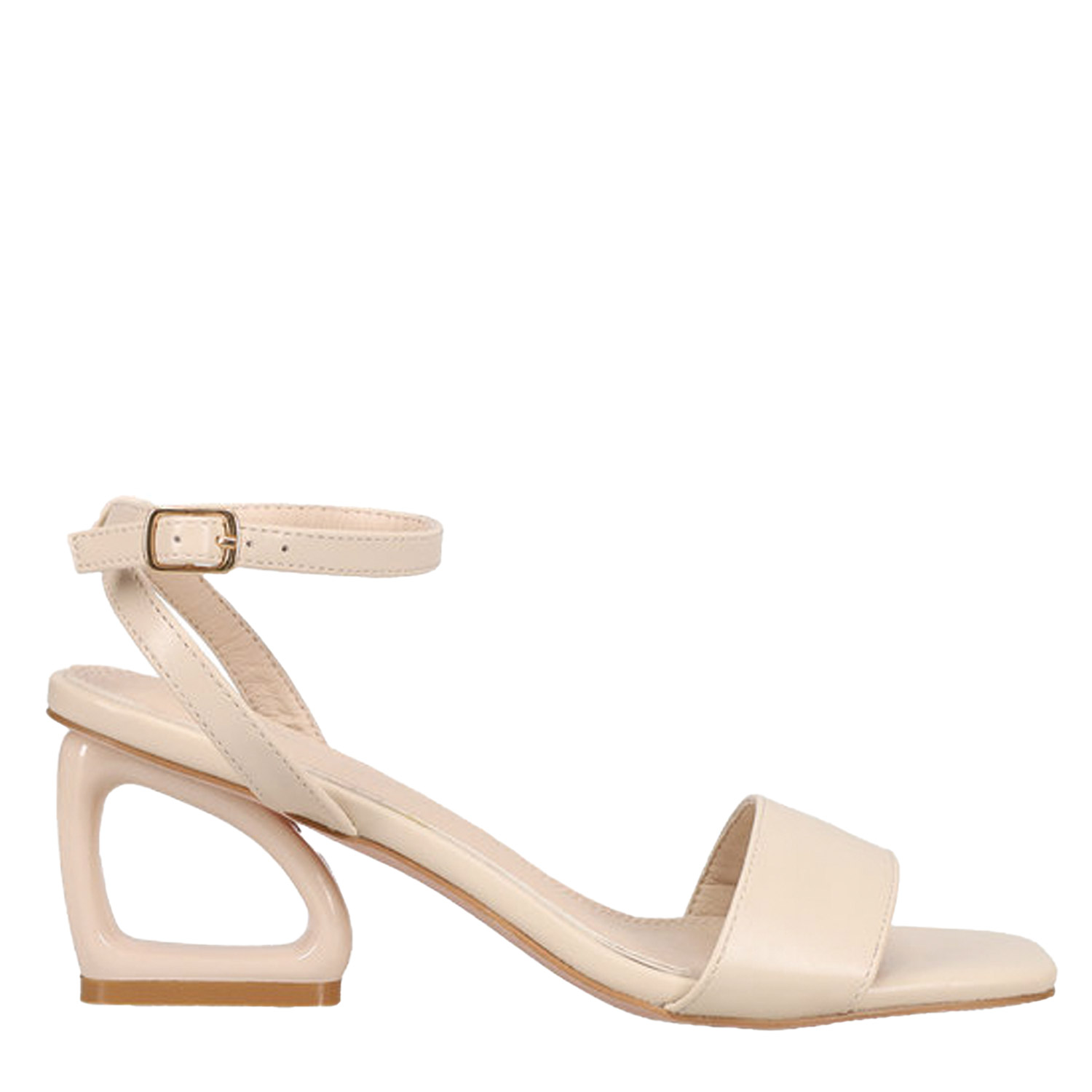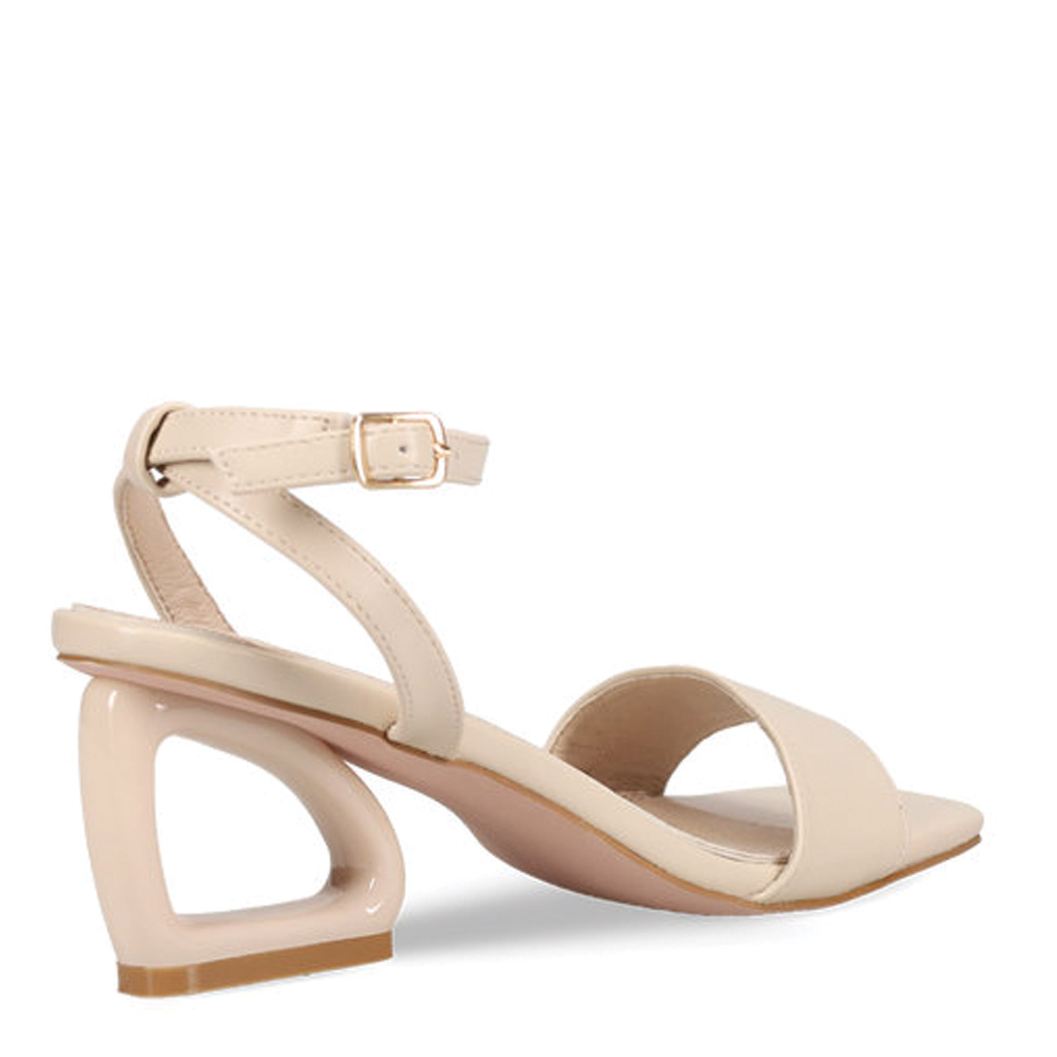 Μπεζ πέδιλο με φαρδιά φάσα. Διαθέτει ιδαίτερο γλυπτό τακούνι μεσαίου ύψους. Δένει με ρυθμιζόμενο λουράκι αστραγάλου.