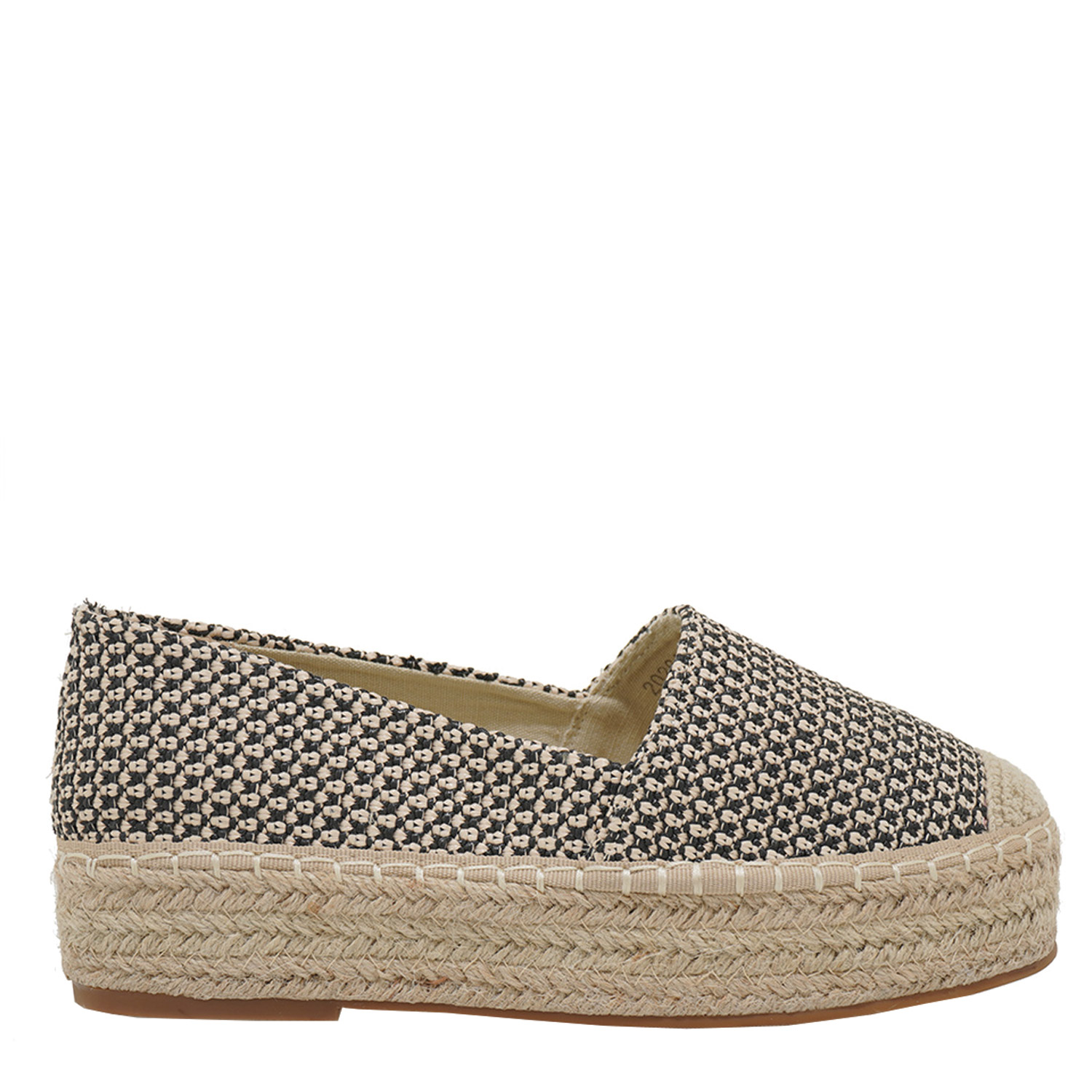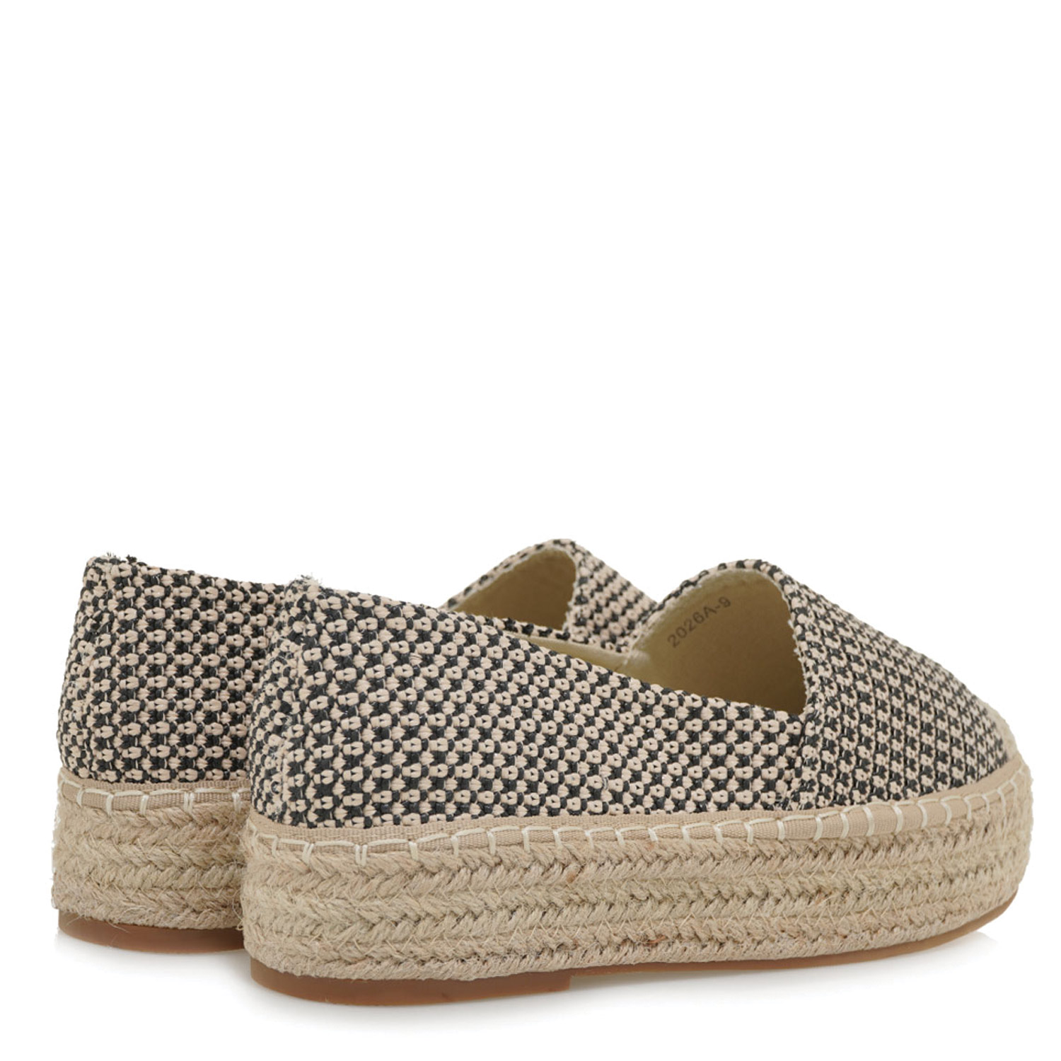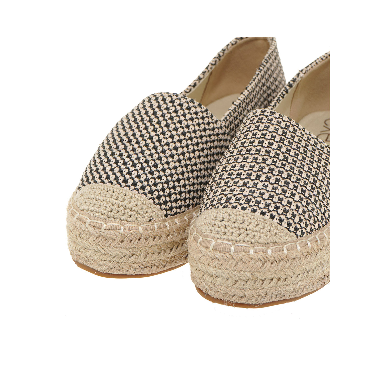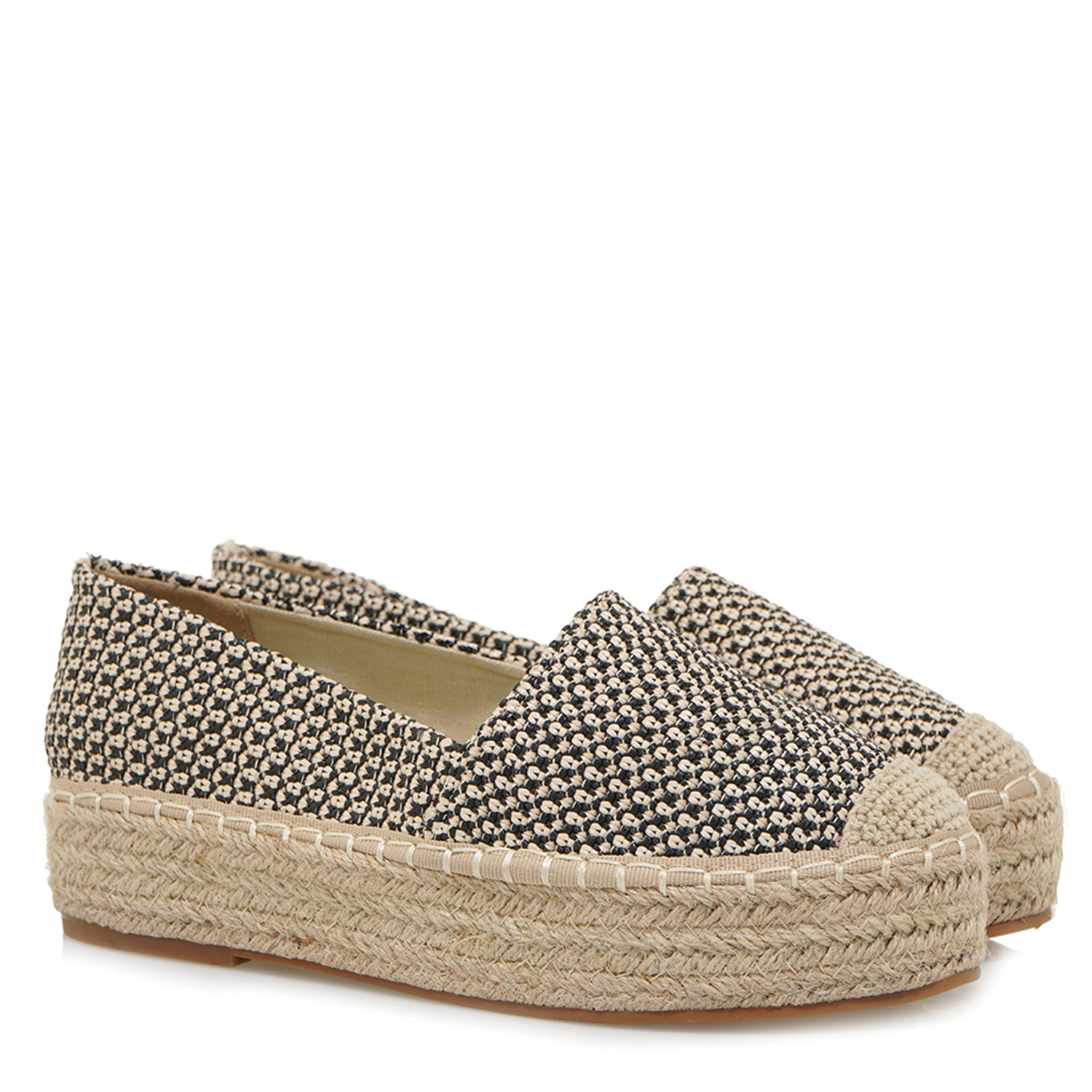 Exe γυναικεία εσπαντρίγια, σε μαύρο-μπεζ χρώμα, κατασκευασμένη από ύφασμα. Ύψος σόλας 5εκ.