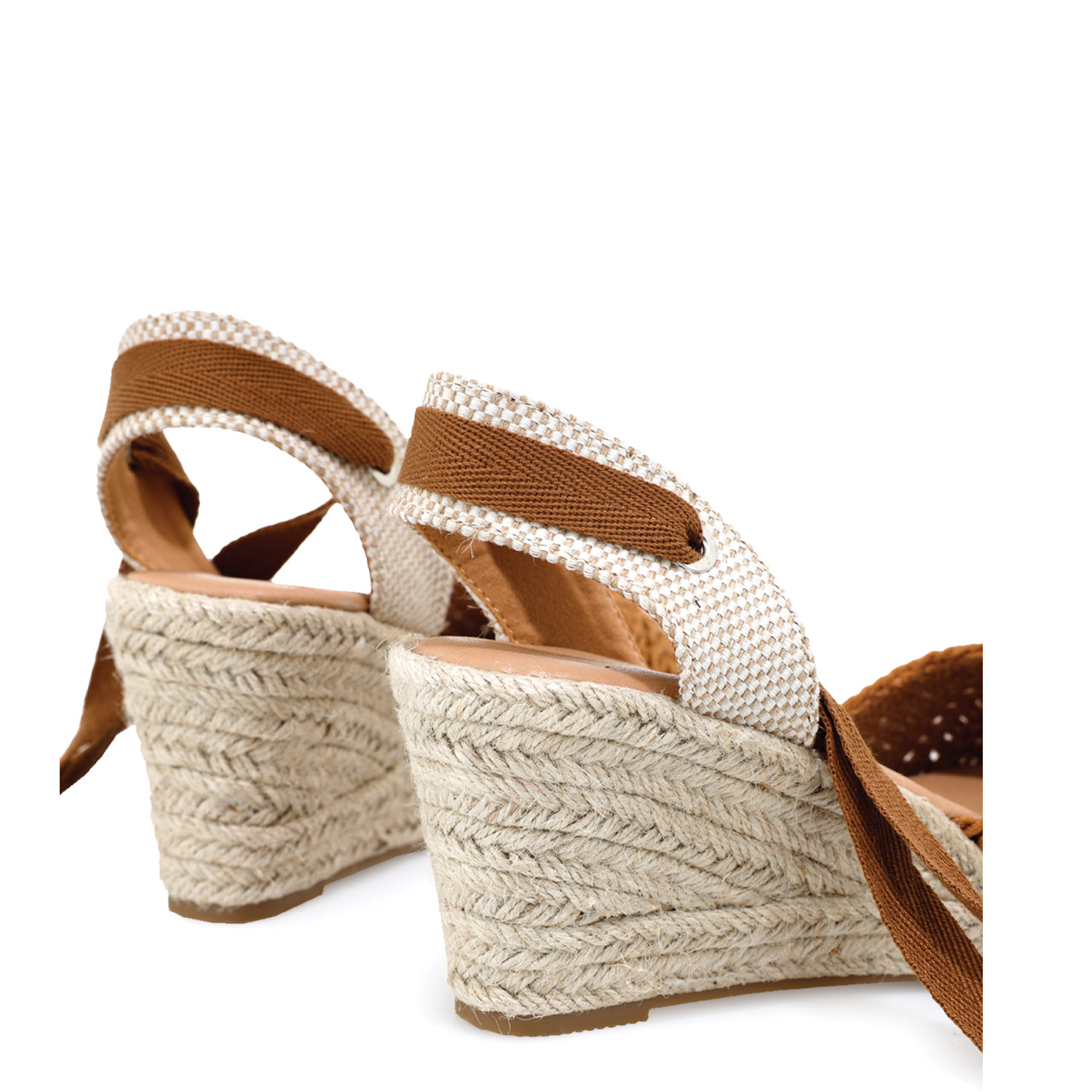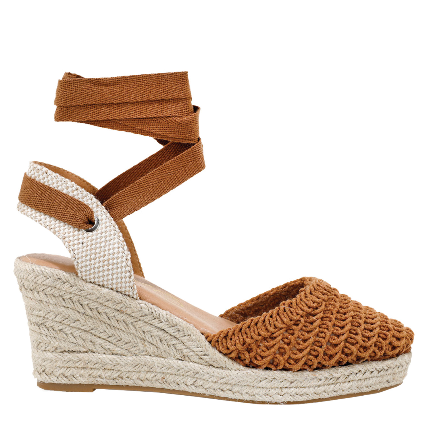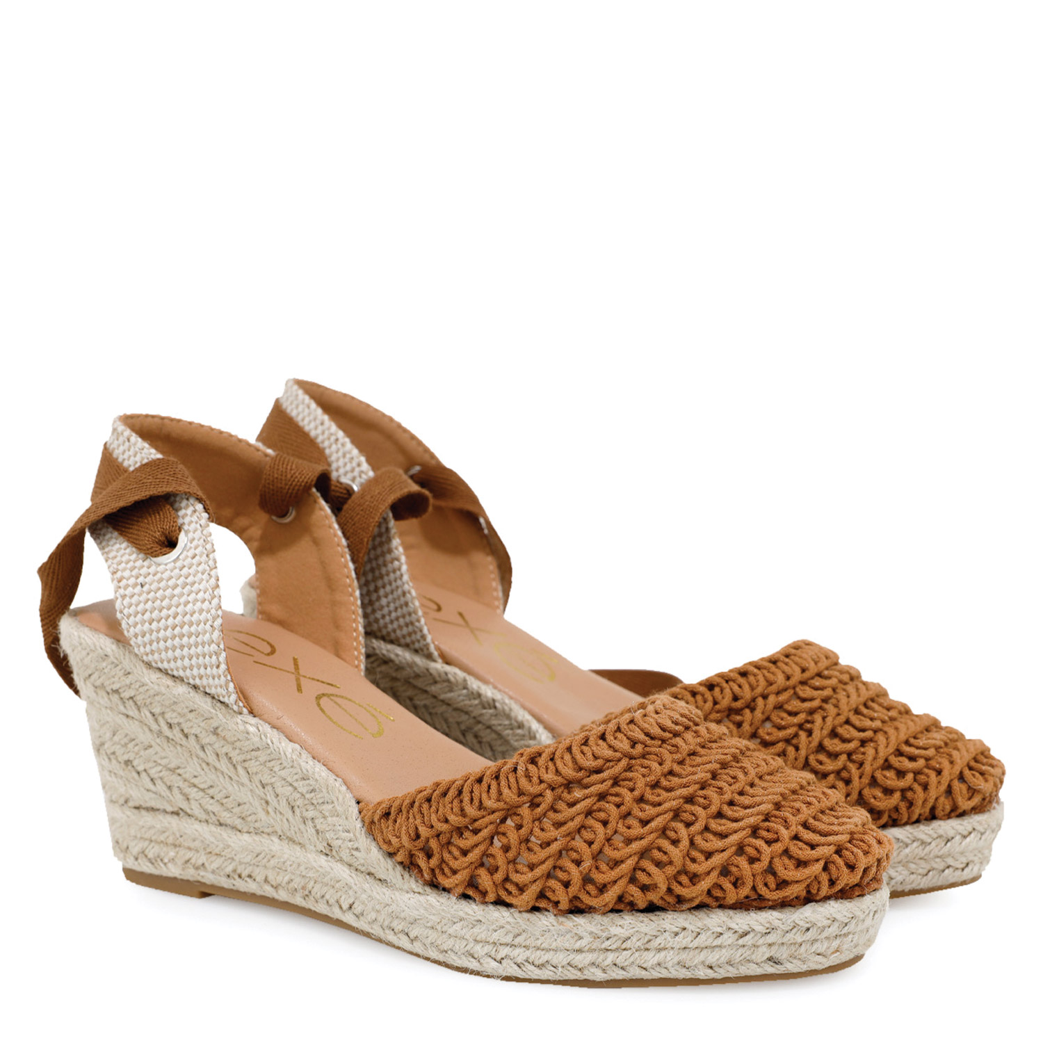 Exe γυναικεία εσπαντρίγια, σε ταμπά χρώμα, κατασκευασμένη από ύφασμα. Ύψος σόλας 8εκ.