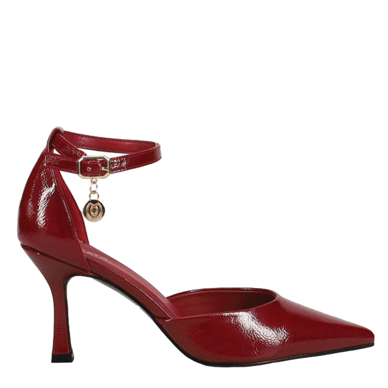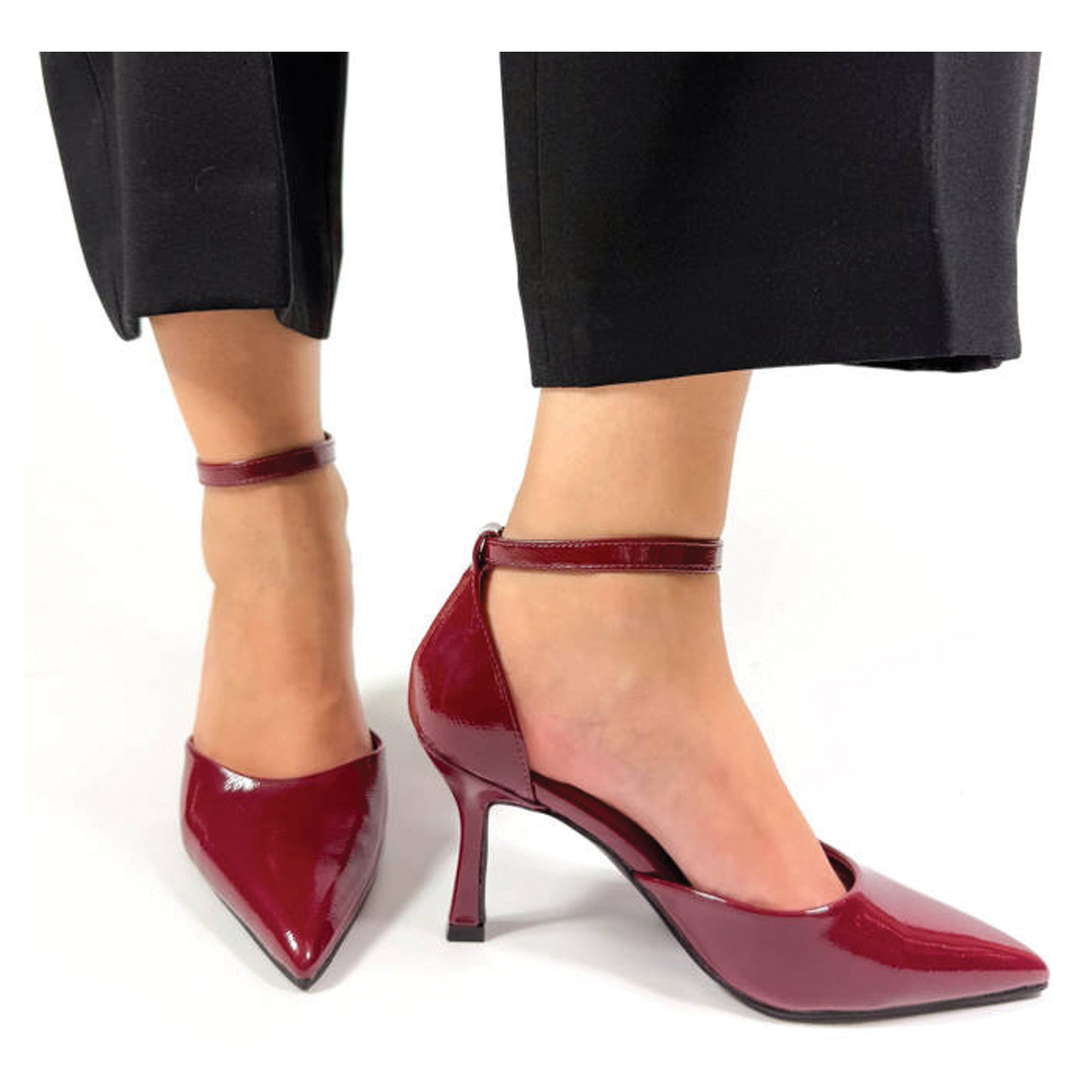 Μπορντώ γόβα. Διαθέτει μυτερή φόρμα και ψηλό τακούνι. Δένει με ρυθμιζόμενο λουράκι στον αστράγαλο.