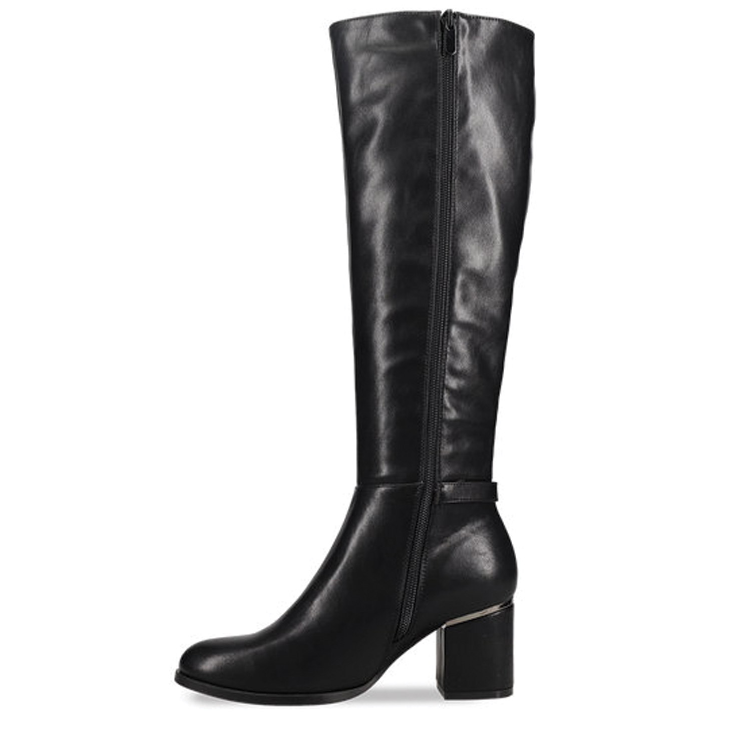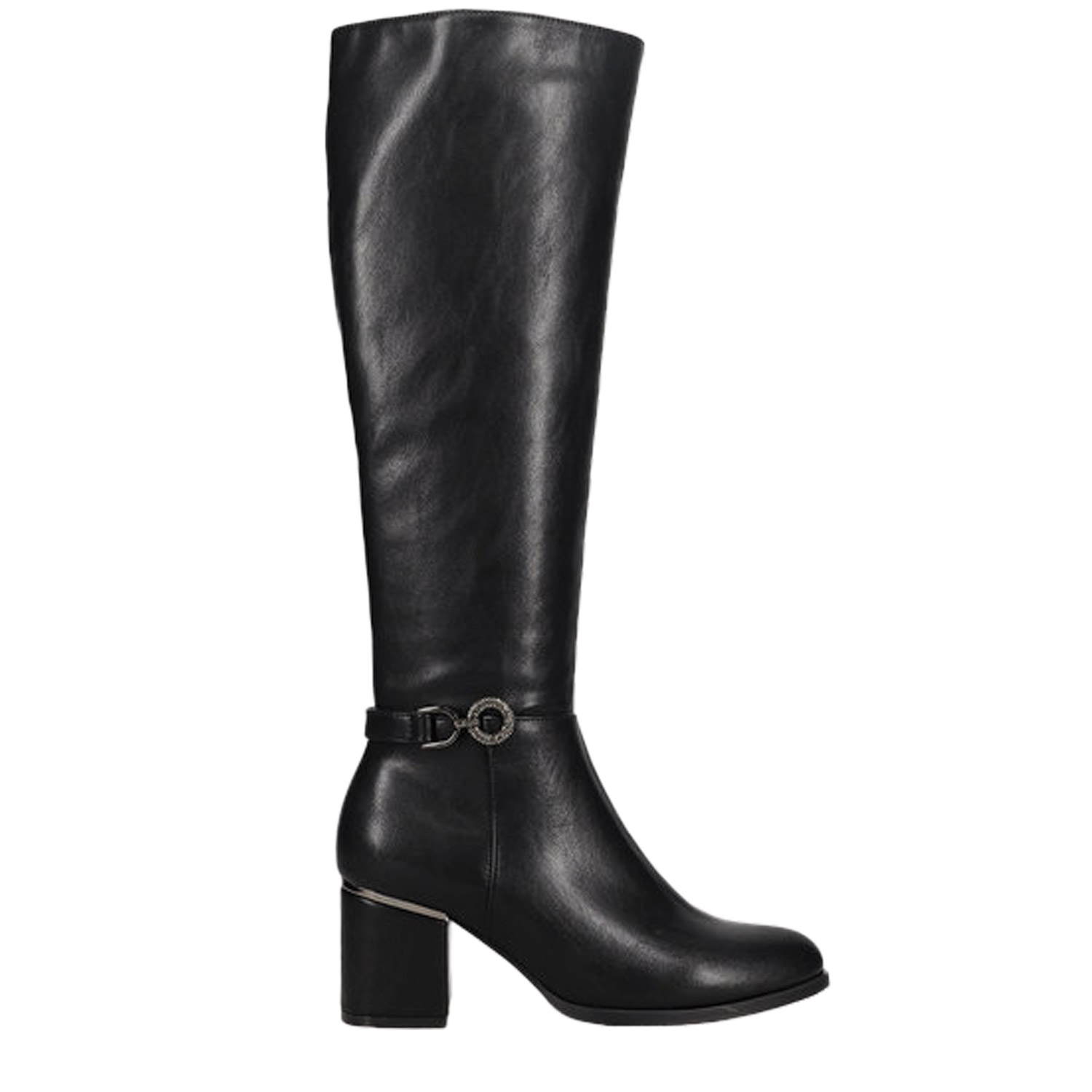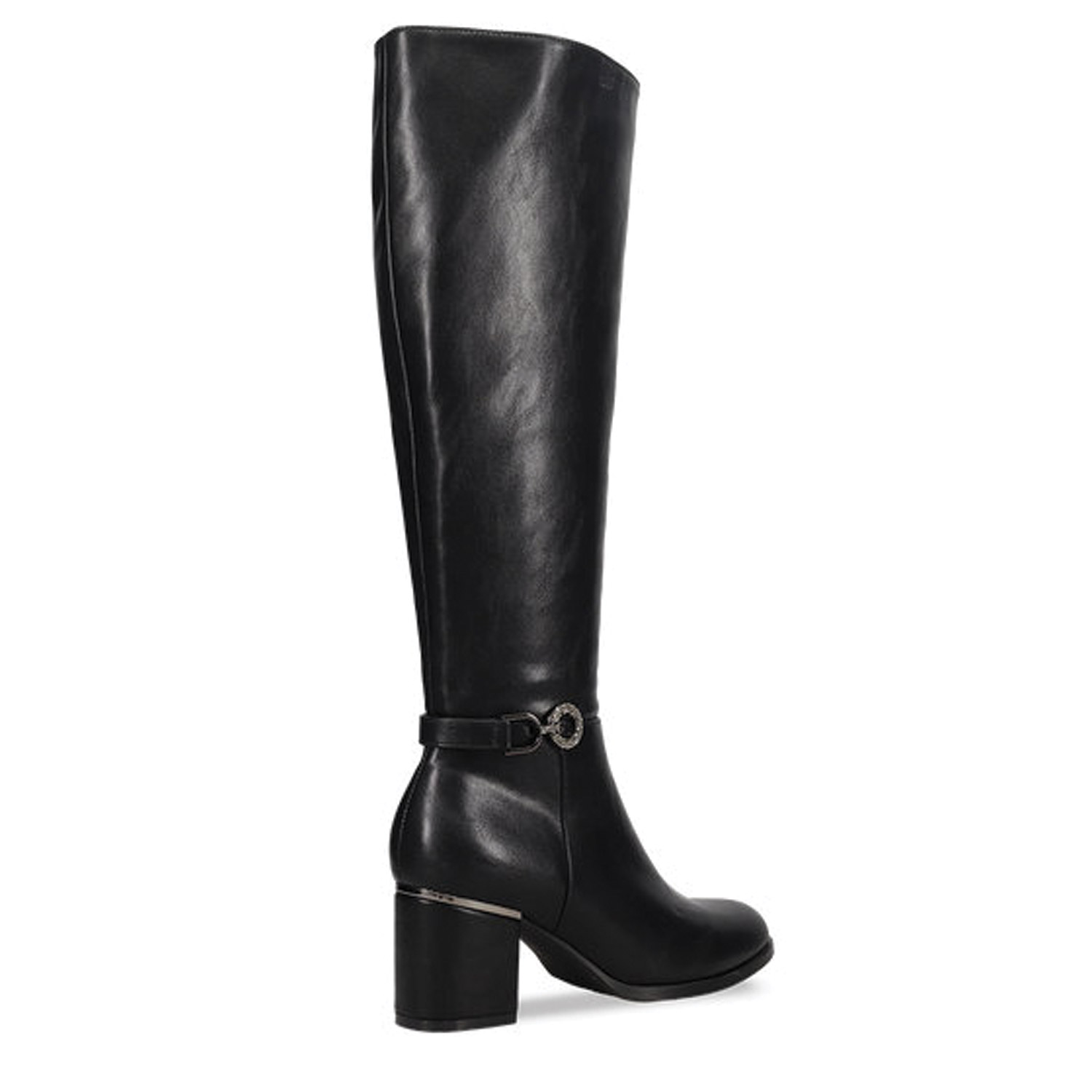 Μαύρη μπότα μέχρι το γόνατο. Διαθέτει διακοσμητικό λουράκι και χοντρό τακούνι μεσαίου ύψους. Κλείνει με φερμουάρ στην εσωτερική μεριά.