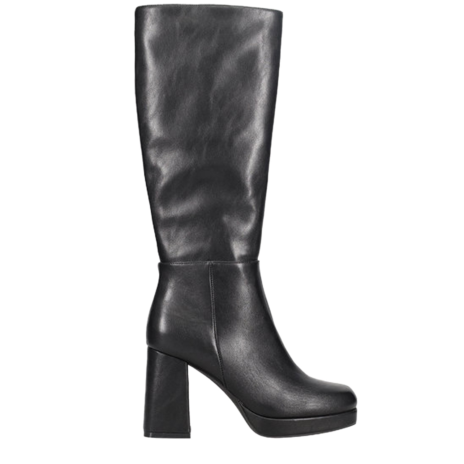 Μαύρη μπότα μέχρι το γόνατο. Διαθέτει ψηλό χοντρό τακούνι και πλατφόρμα μπροστά. Κλείνει με φερμουάρ στο πλάι.