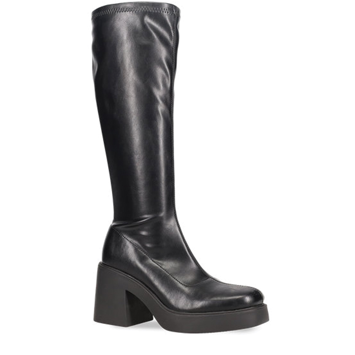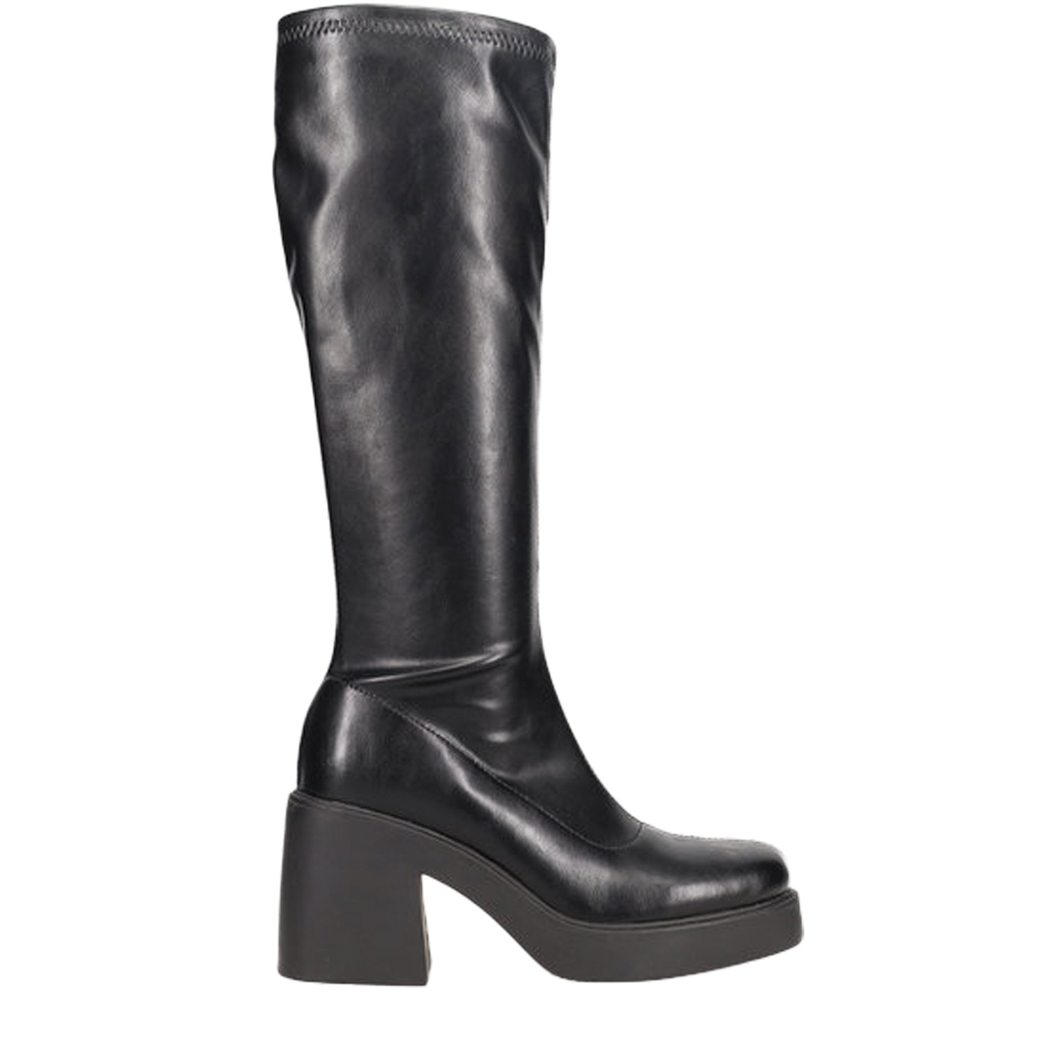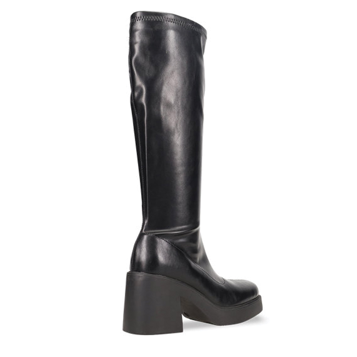Μαύρη μπότα μέχρι το γόνατο με ελαστική όψη. Διαθέτει χοντρή σόλα και ψηλό χοντρό τακούνι. Κλείνει με φερμουάρ στο πλάι.