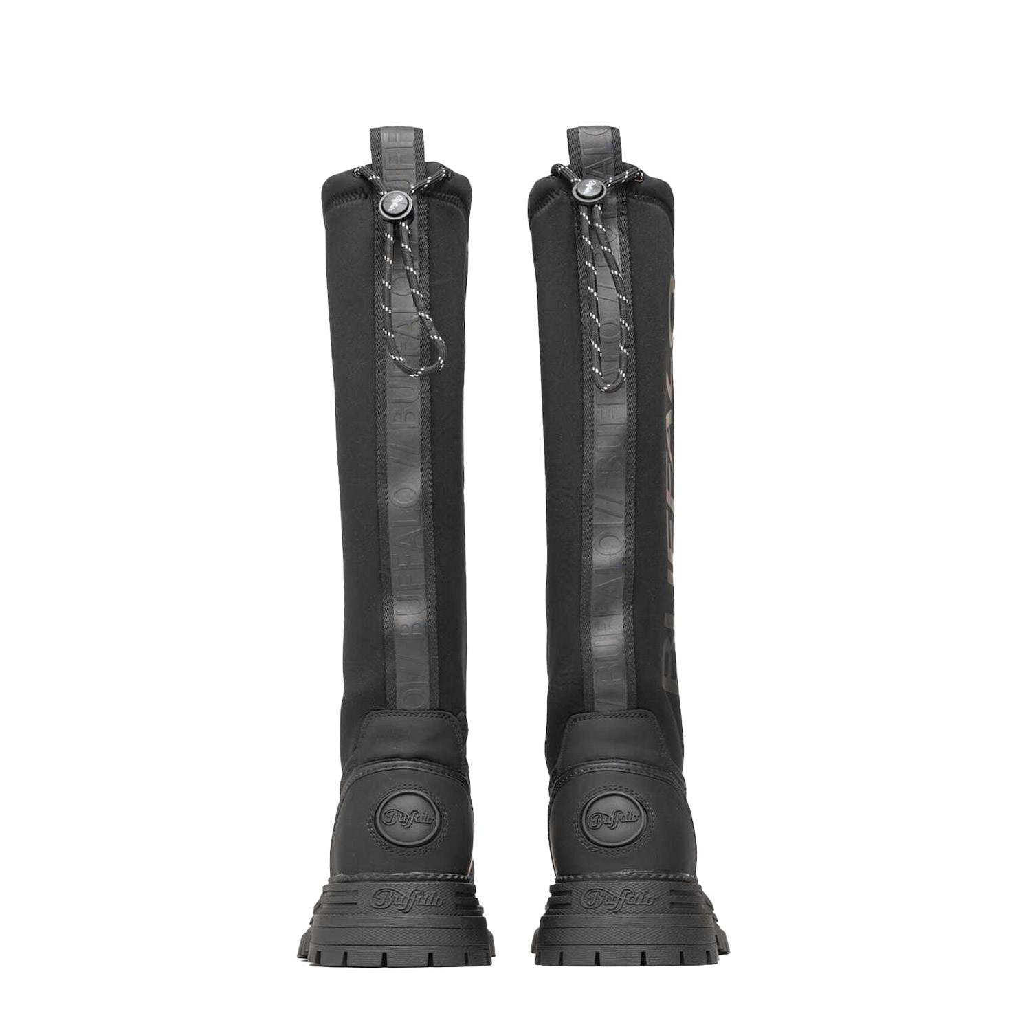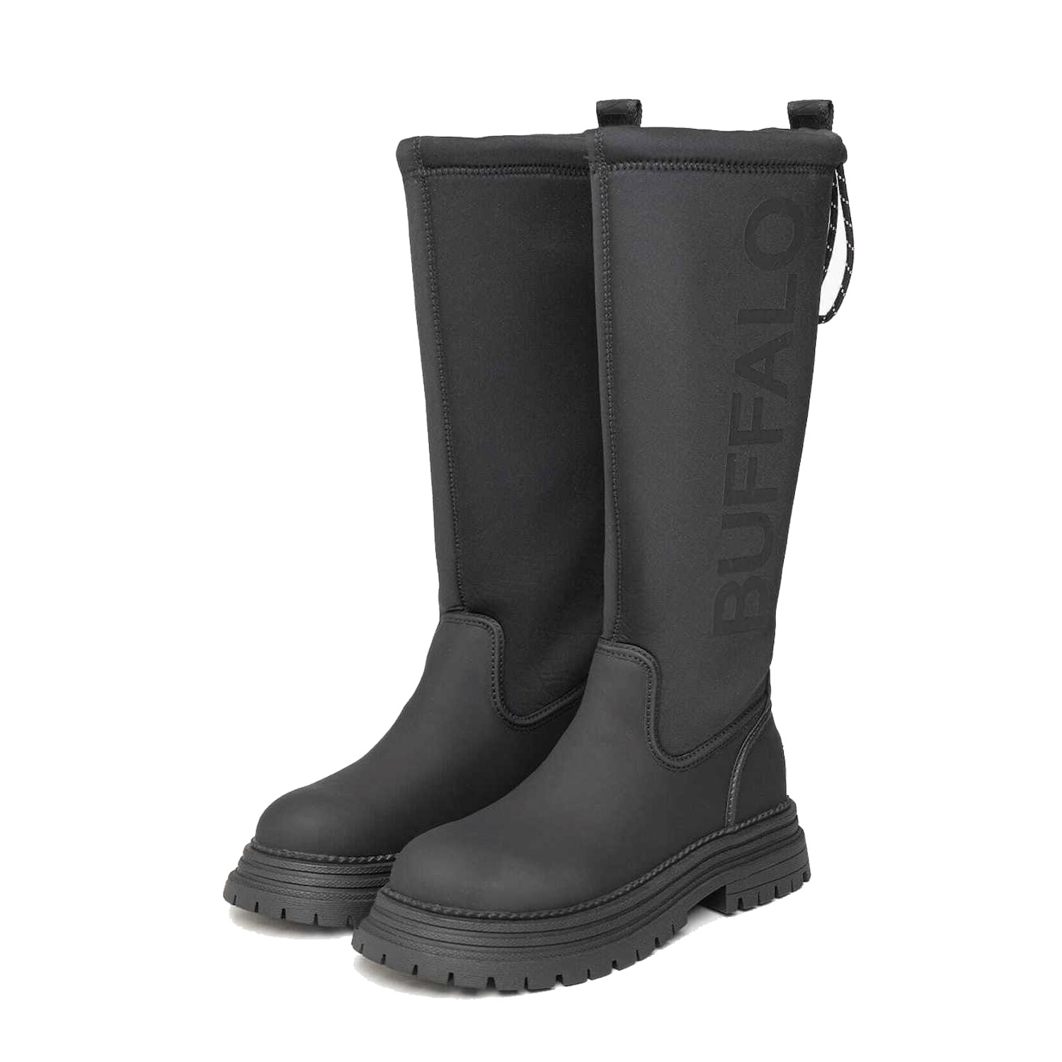Buffalo γυναικεία μπότα, σε μαύρο χρώμα, κατασκευασμένη από καουτσούκ και νάυλον. Ύψος τακουνιού 4εκ.