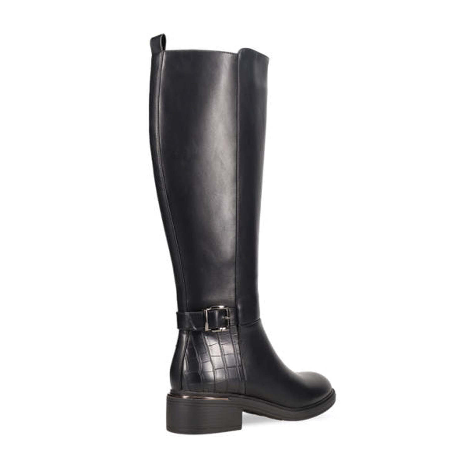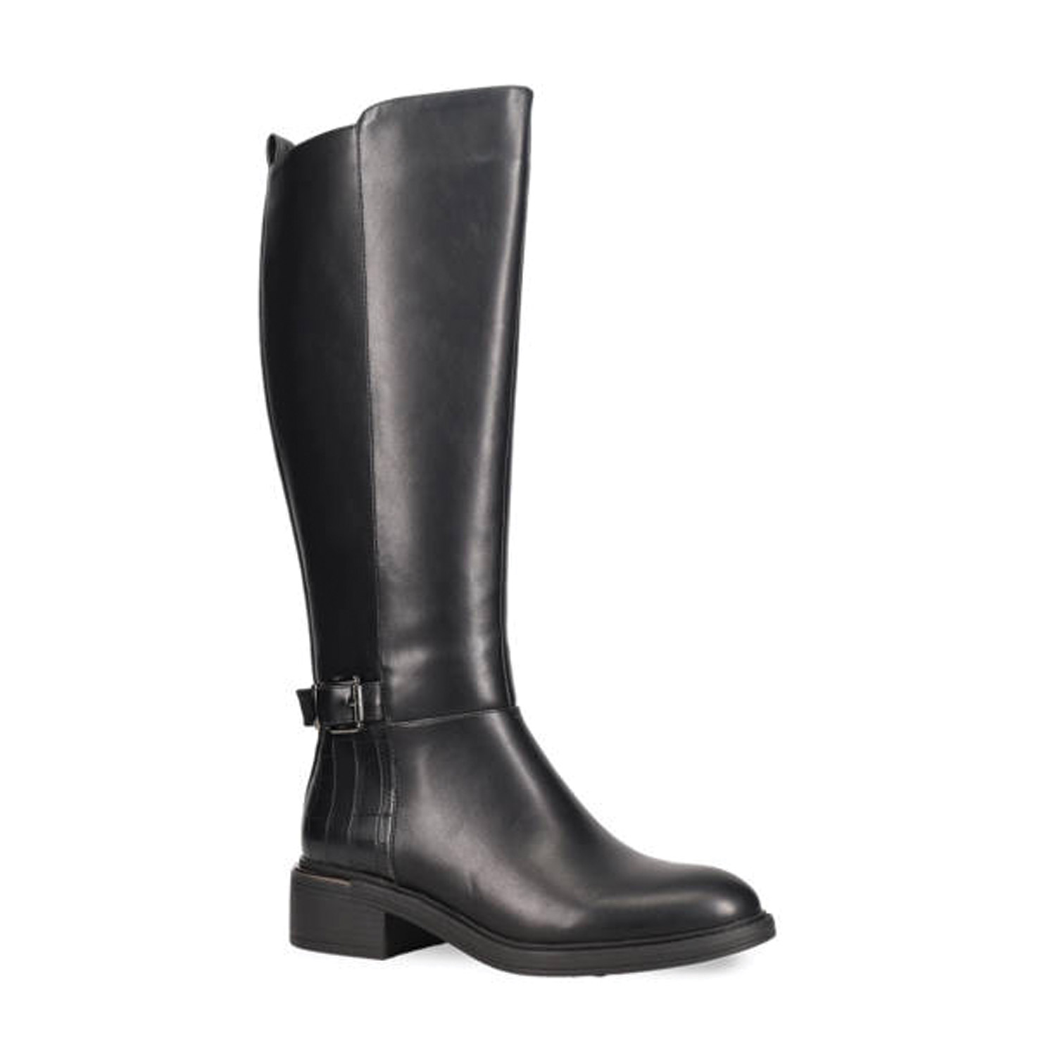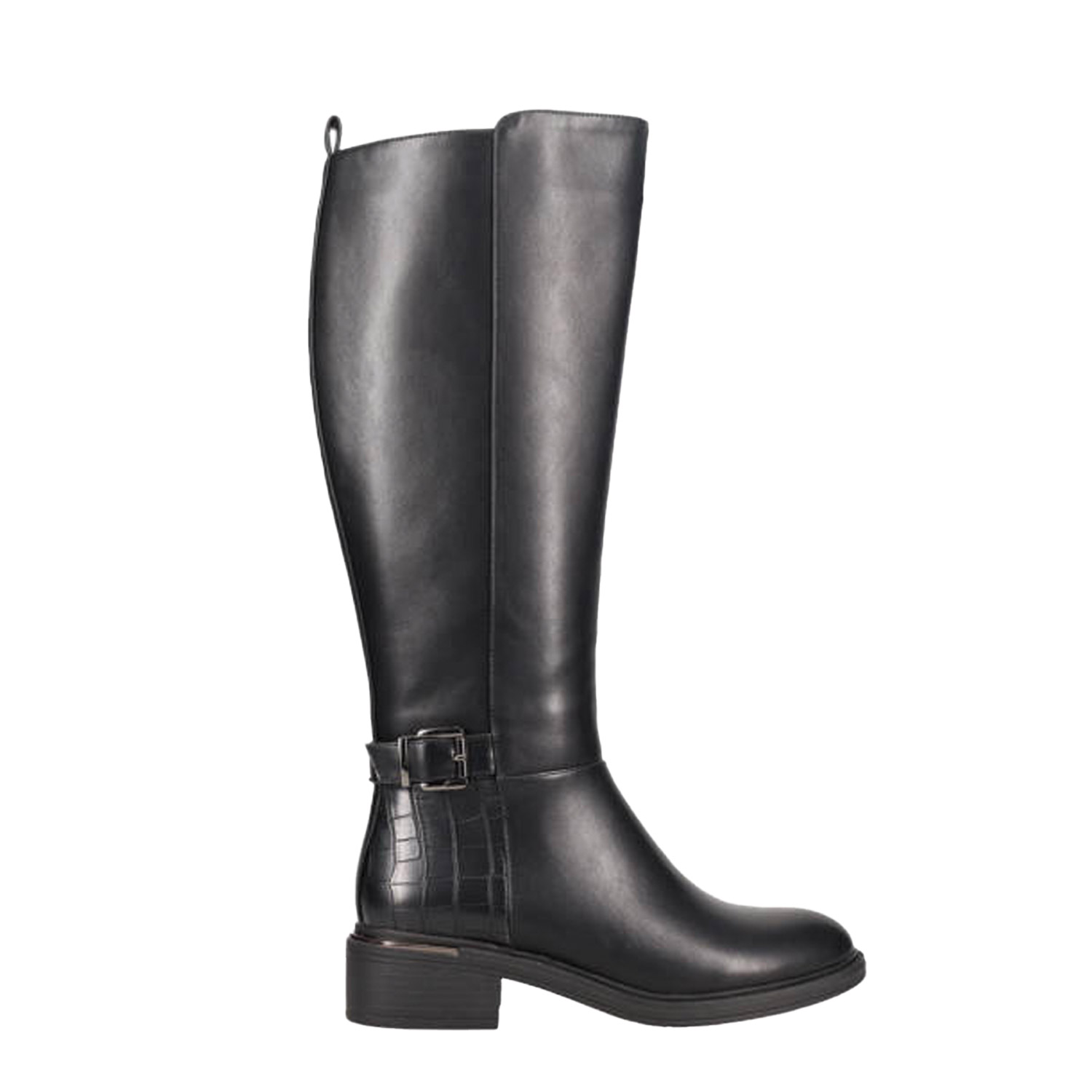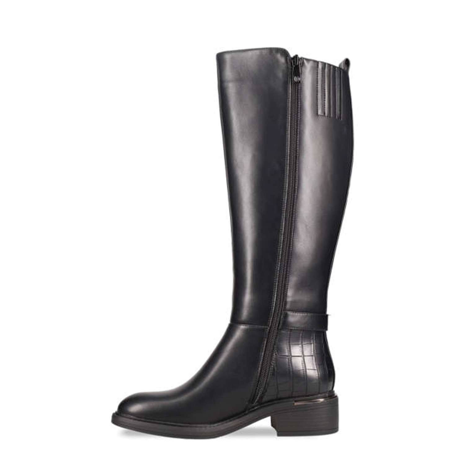 Μαύρη μπότα μέχρι το γόνατο. Διαθέτει διακοσμητικό λουράκι αστραγάλου με αγκράφα και χοντρό χαμηλό τακούνι. Κλείνει με φερμουάρ στο πλάι.
