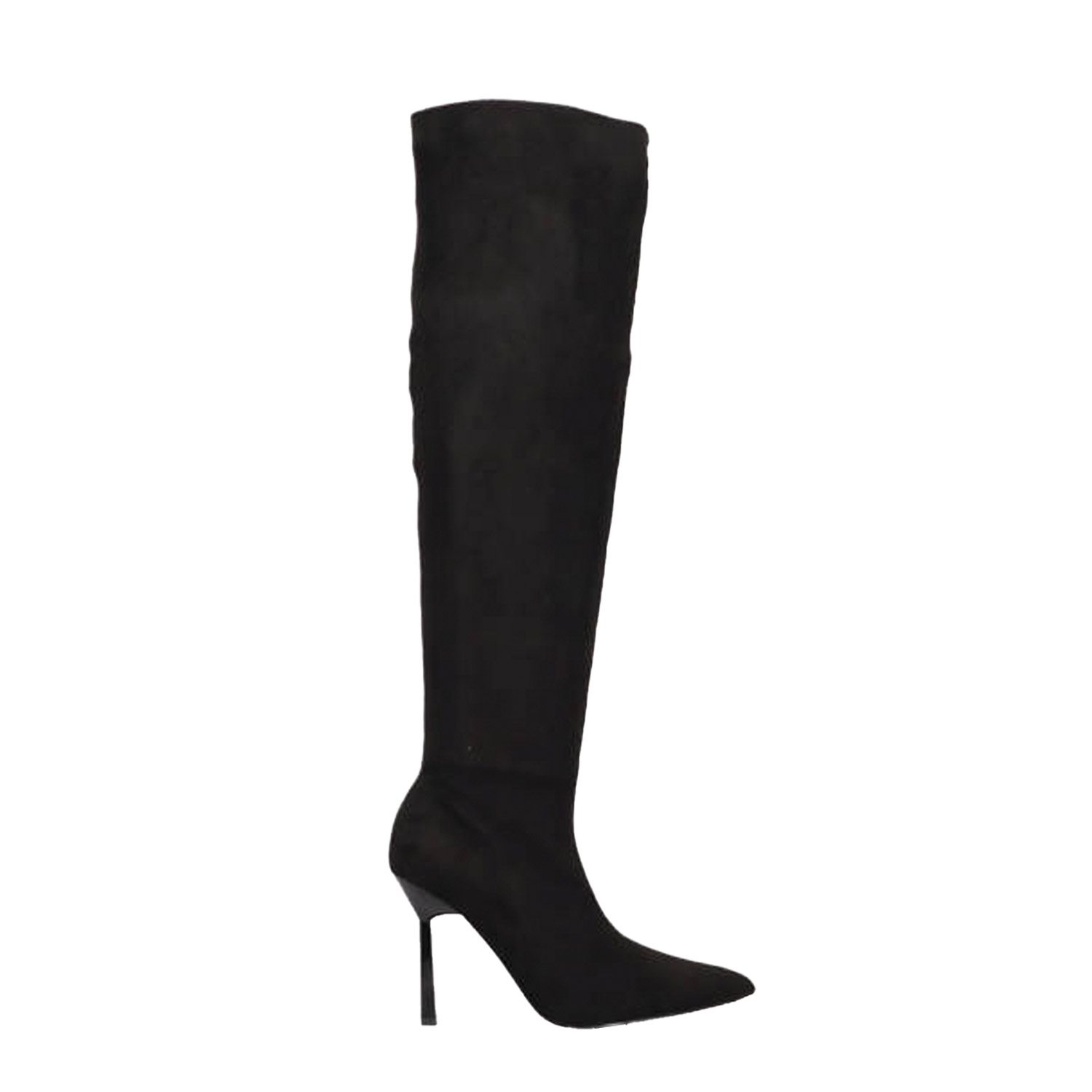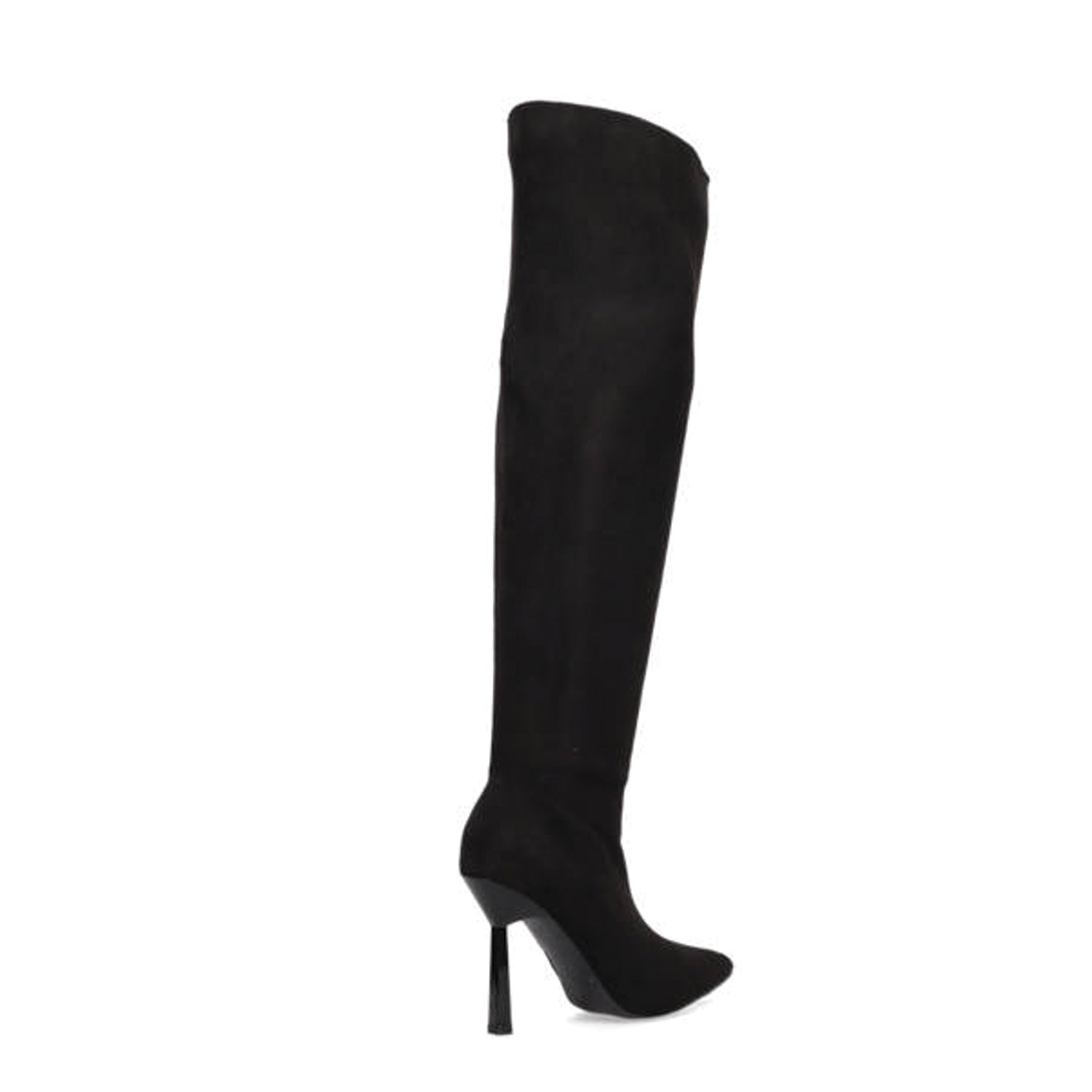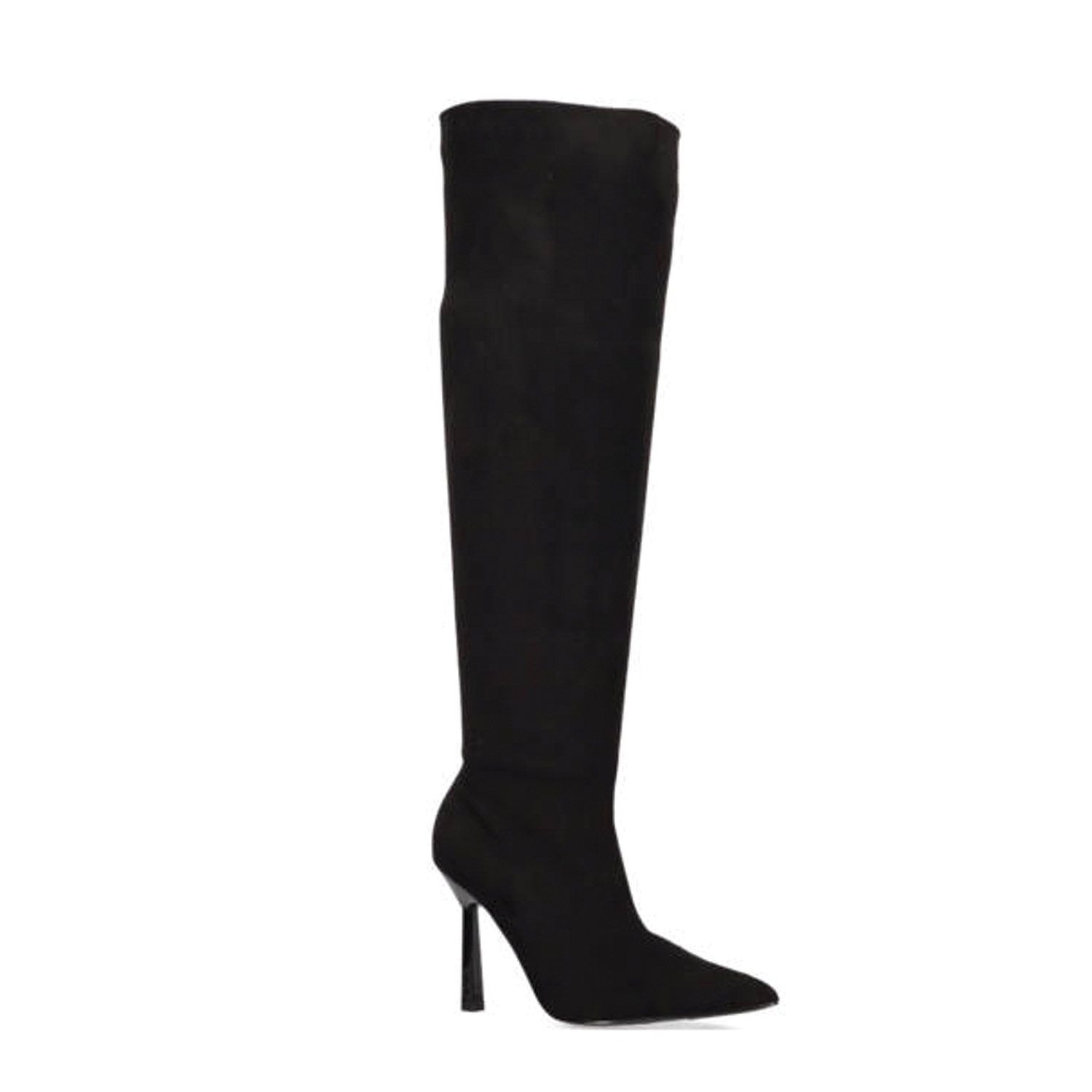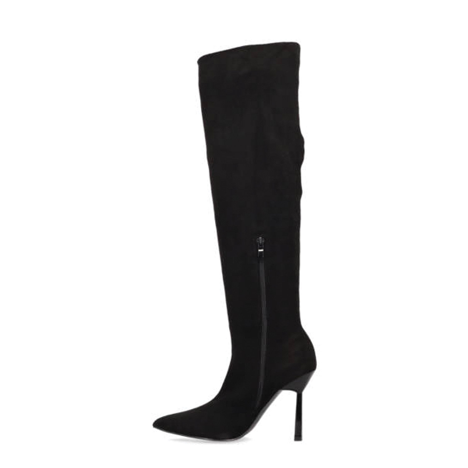 Μαύρη καστόρι μπότα πάνω από το γόνατο. Διαθέτει λεπτό τακούνι. Κλείνει με φερμουάρ.