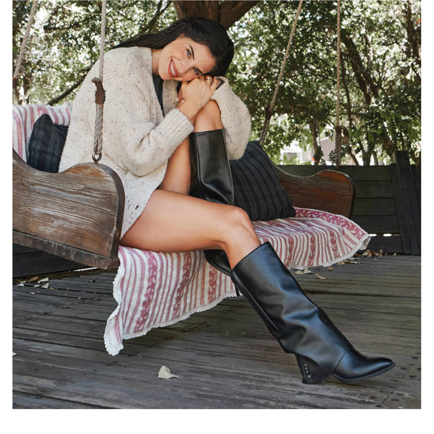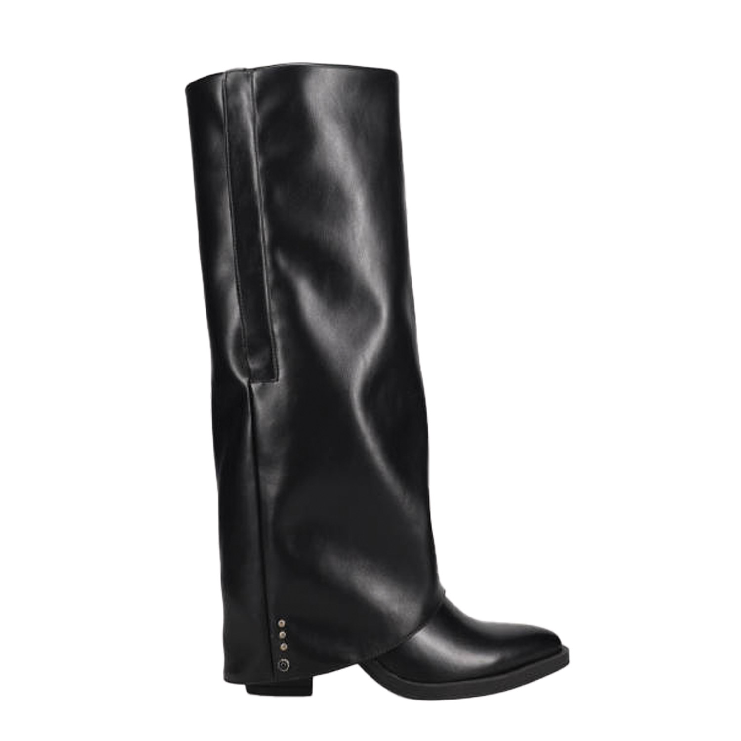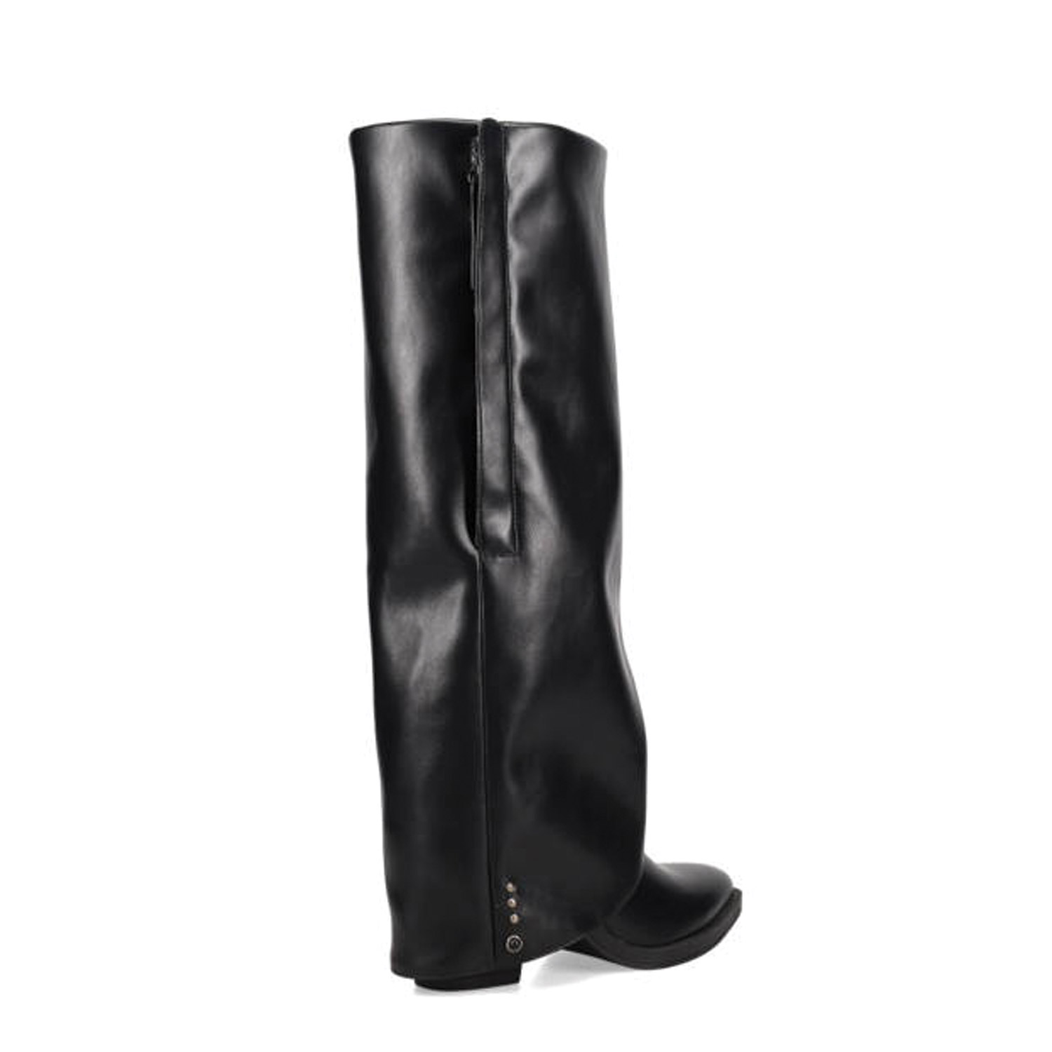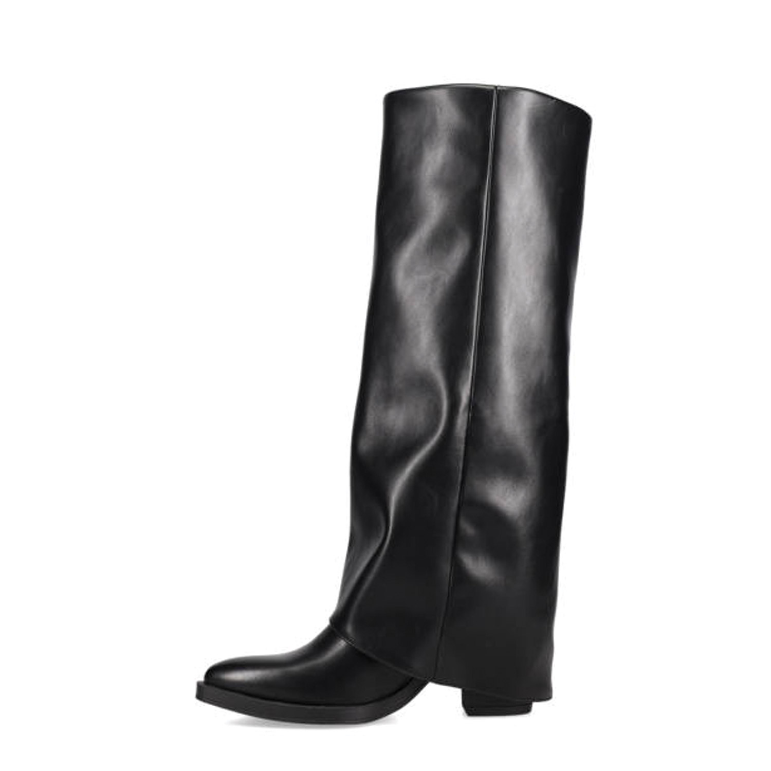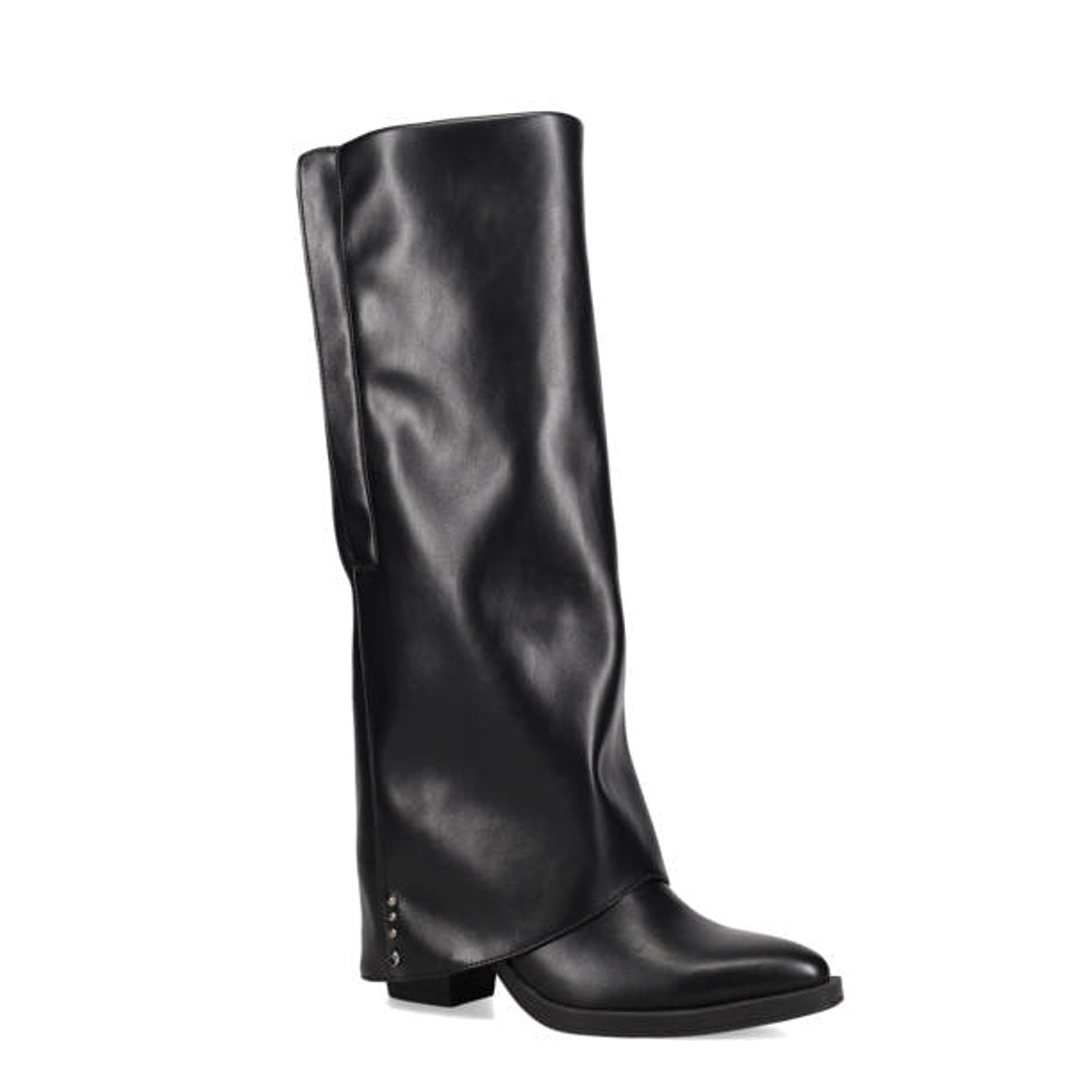 Μαύρη μπότα με γκέτα μέχρι το γόνατο. Διαθέτει μεσαίο χοντρό τακούνι. Κλείνει με φερμουάρ.