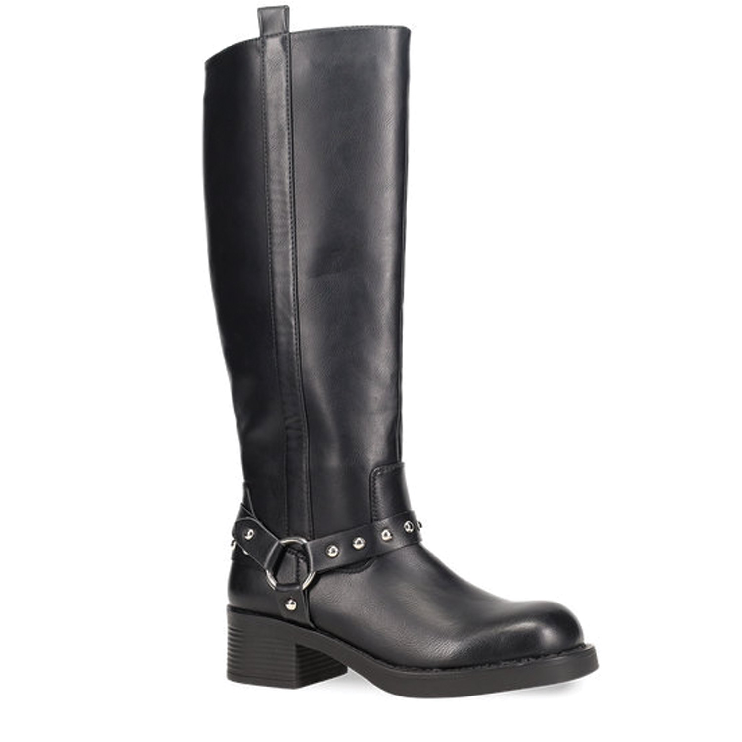 Μαύρη μπότα biker μέχρι το γόνατο. Διαθέτει διακοσμητικά λουράκια στον αστράγαλο. Κλείνει με φερμουάρ στο πλάι.