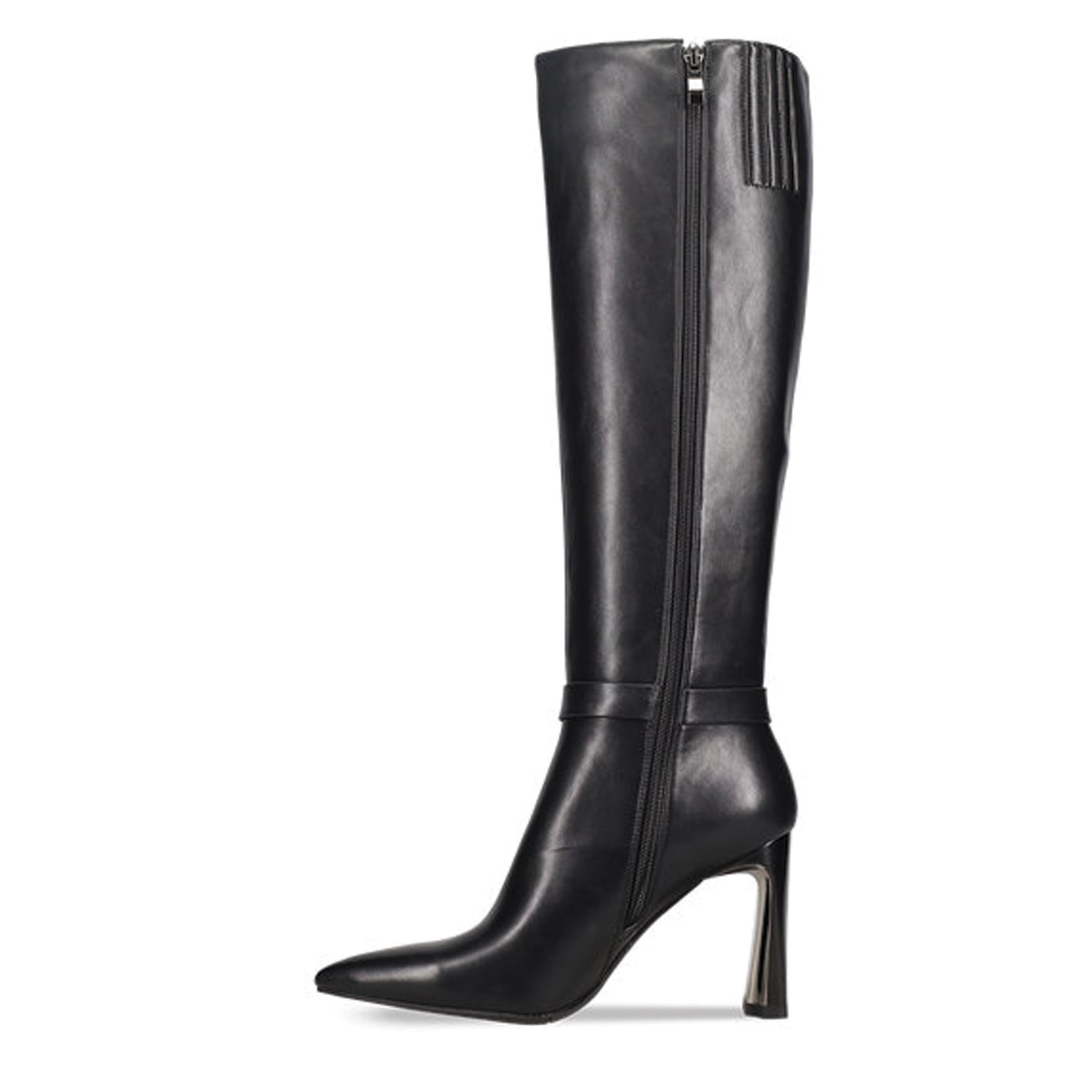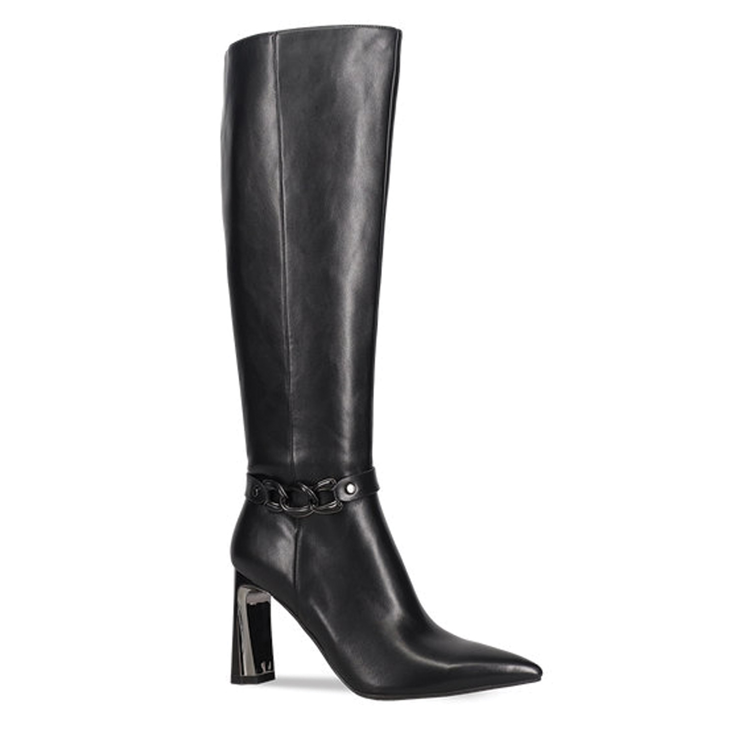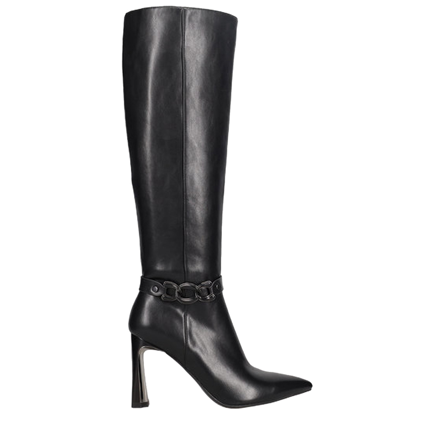 Μαύρη μπότα μέχρι το γόνατο. Διαθέτει χοντρό ψηλό τακούνι με χρυσή λεπτομέρεια και χρυσή διακοσμητική αλυσίδα αστραγάλου. Κλείνει με φερμουάρ στο πλάι.