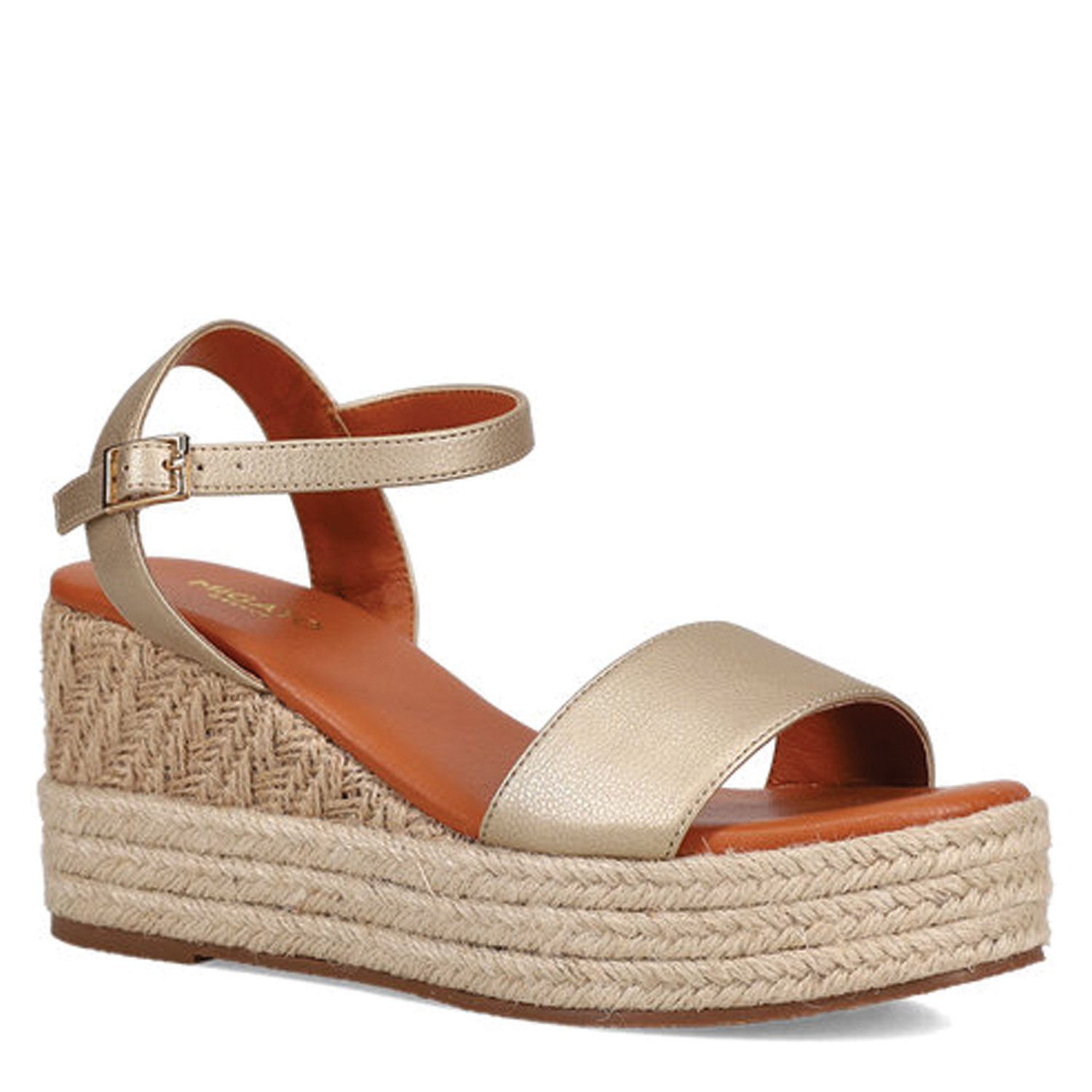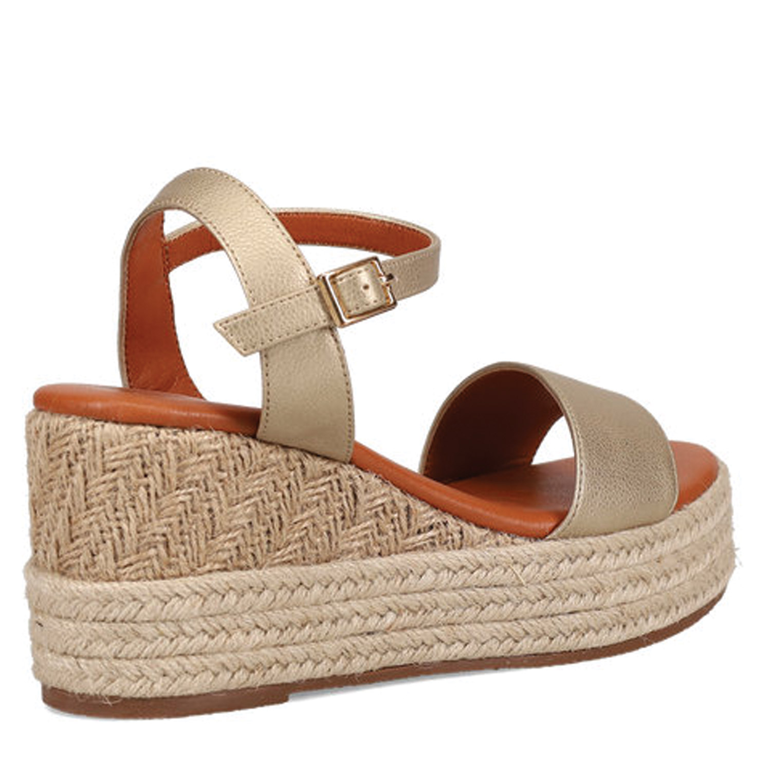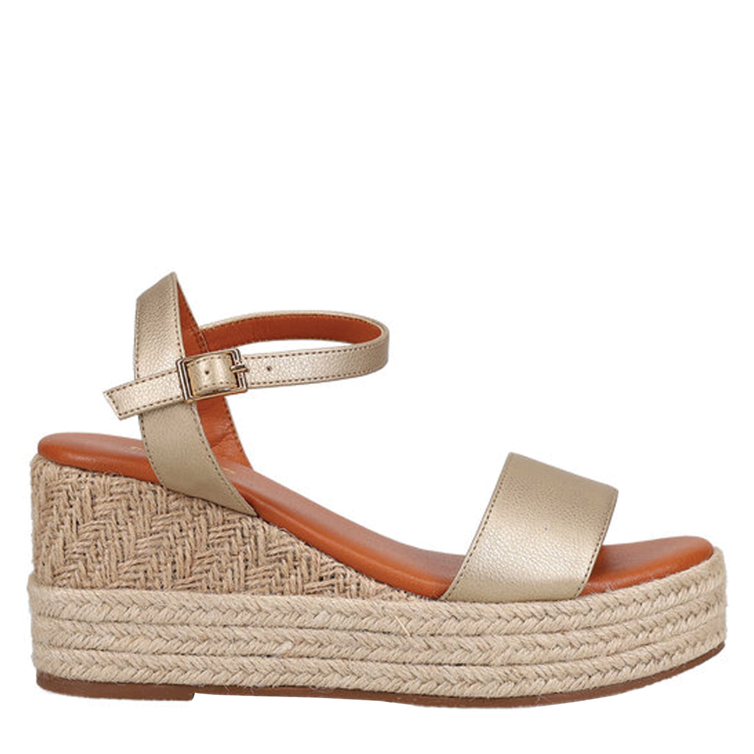 Χρυσή πλατφόρμα με φαρδιά φάσα. Δένει με ρυθμιζόμενο λουράκι αστραγάλου με αγκράφα.