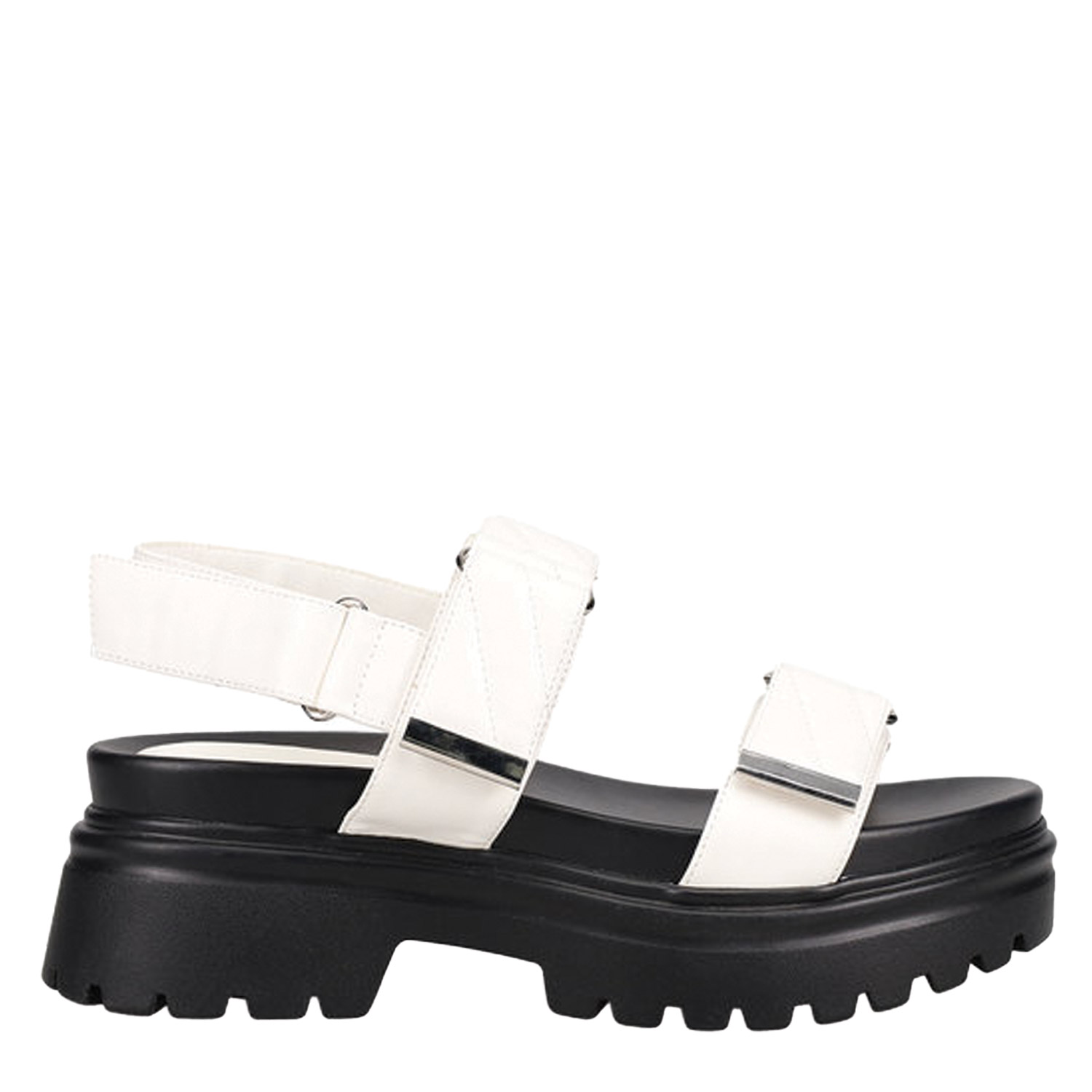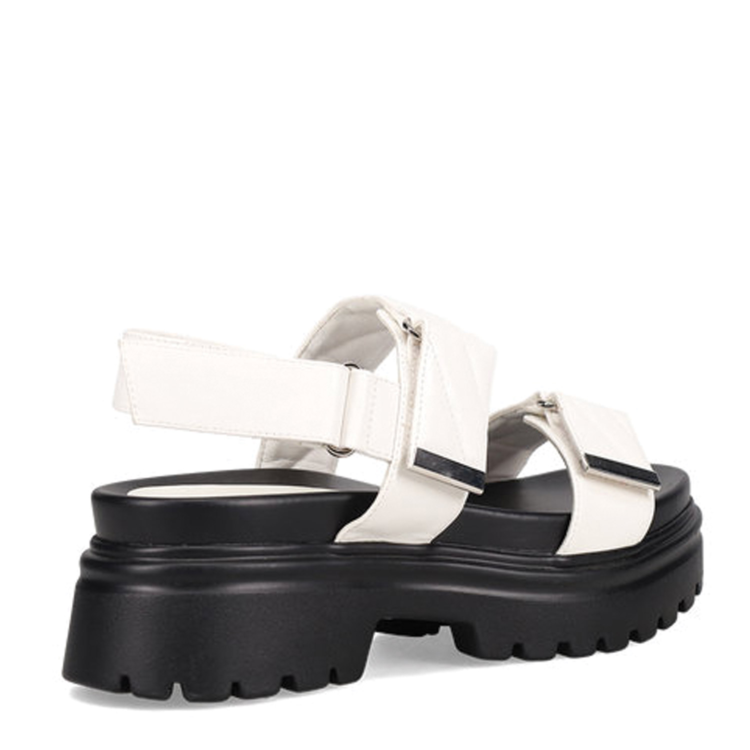 Λευκό σανδάλι. Διαθέτει δύο λουράκια αυτοκόλλητα velcro και τρακτερωτή σόλα. Δένει με λουράκι στη φτέρνα με αυτοκόλλητο velcro.