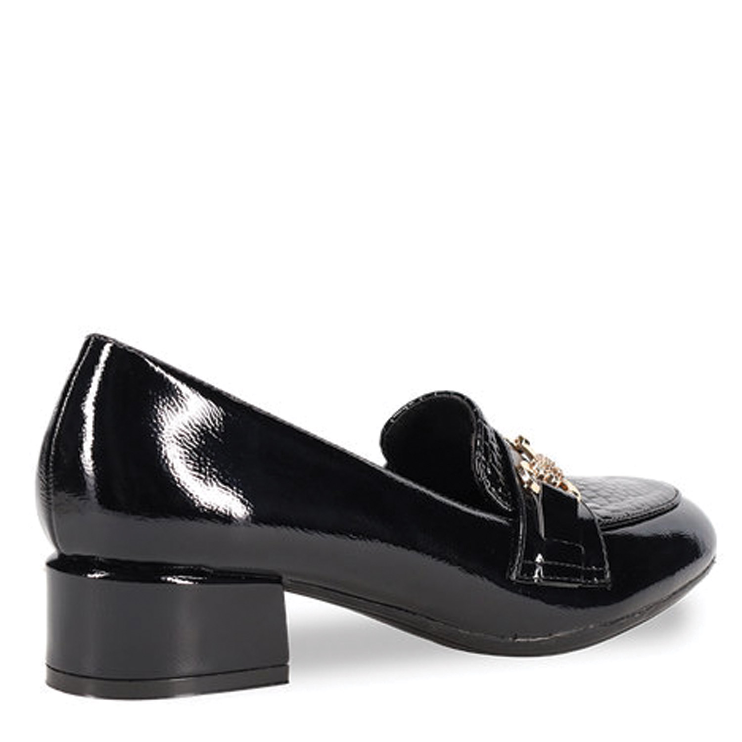 Μαύρο loafer λουστρίνι της εταιρείας WALK2. Διαθέτει χρυσό διακοσμητικό χαλινάρι και χαμηλό τακούνι.
