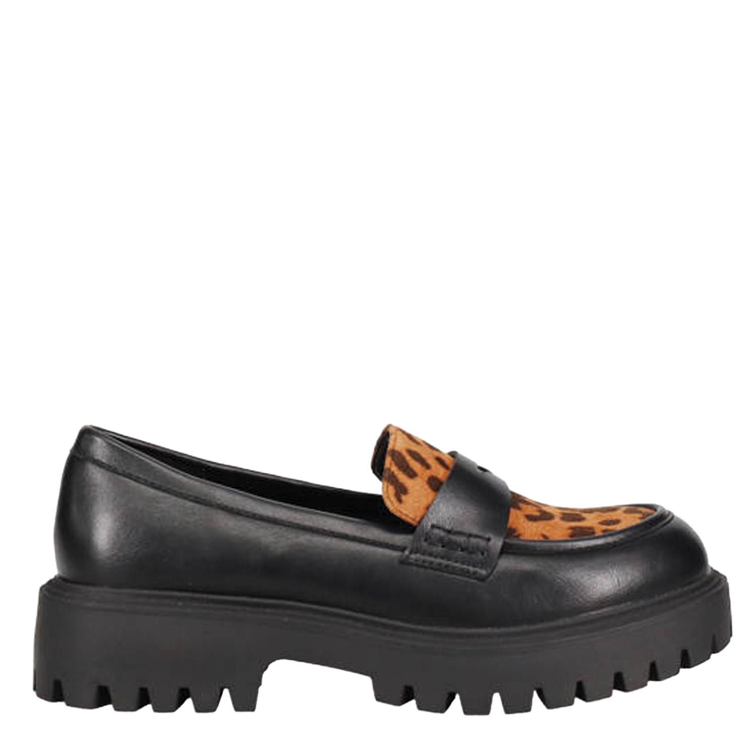 Μαύρο loafer. Διαθέτει λεοπάρ animal print λεπτομέρεια και τρακτερωτή σόλα.