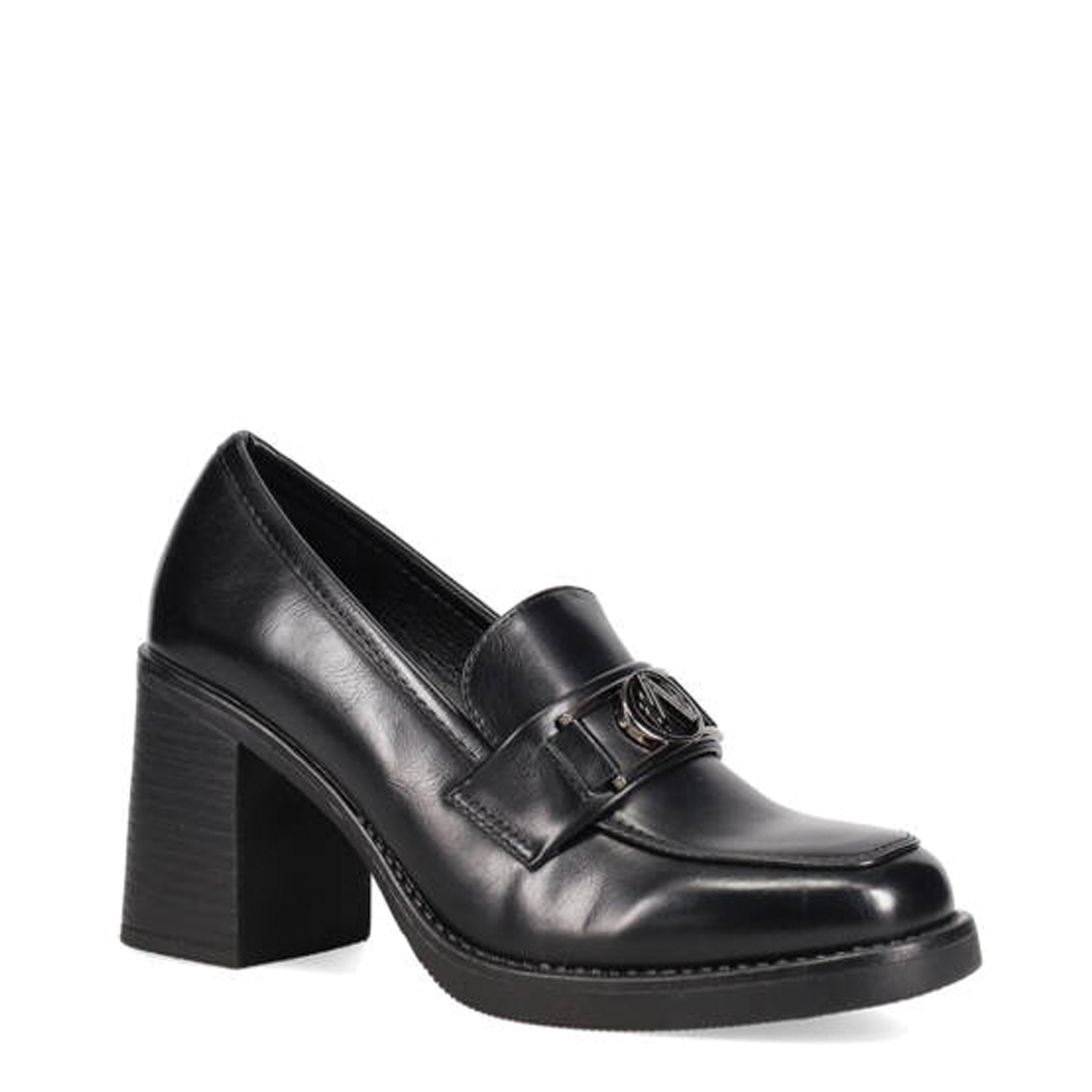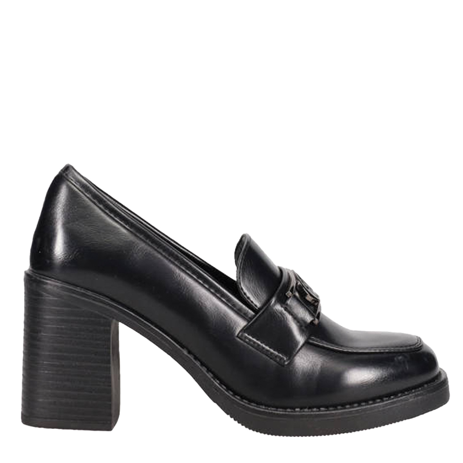 Μαύρο loafer. Διαθέτει ψηλό χοντρό τακούνι.