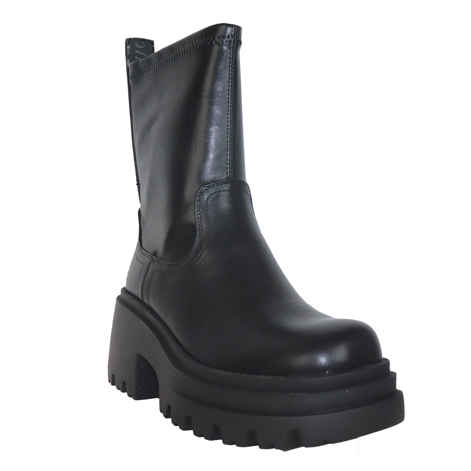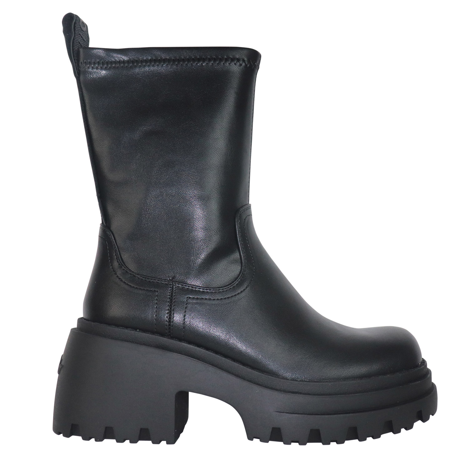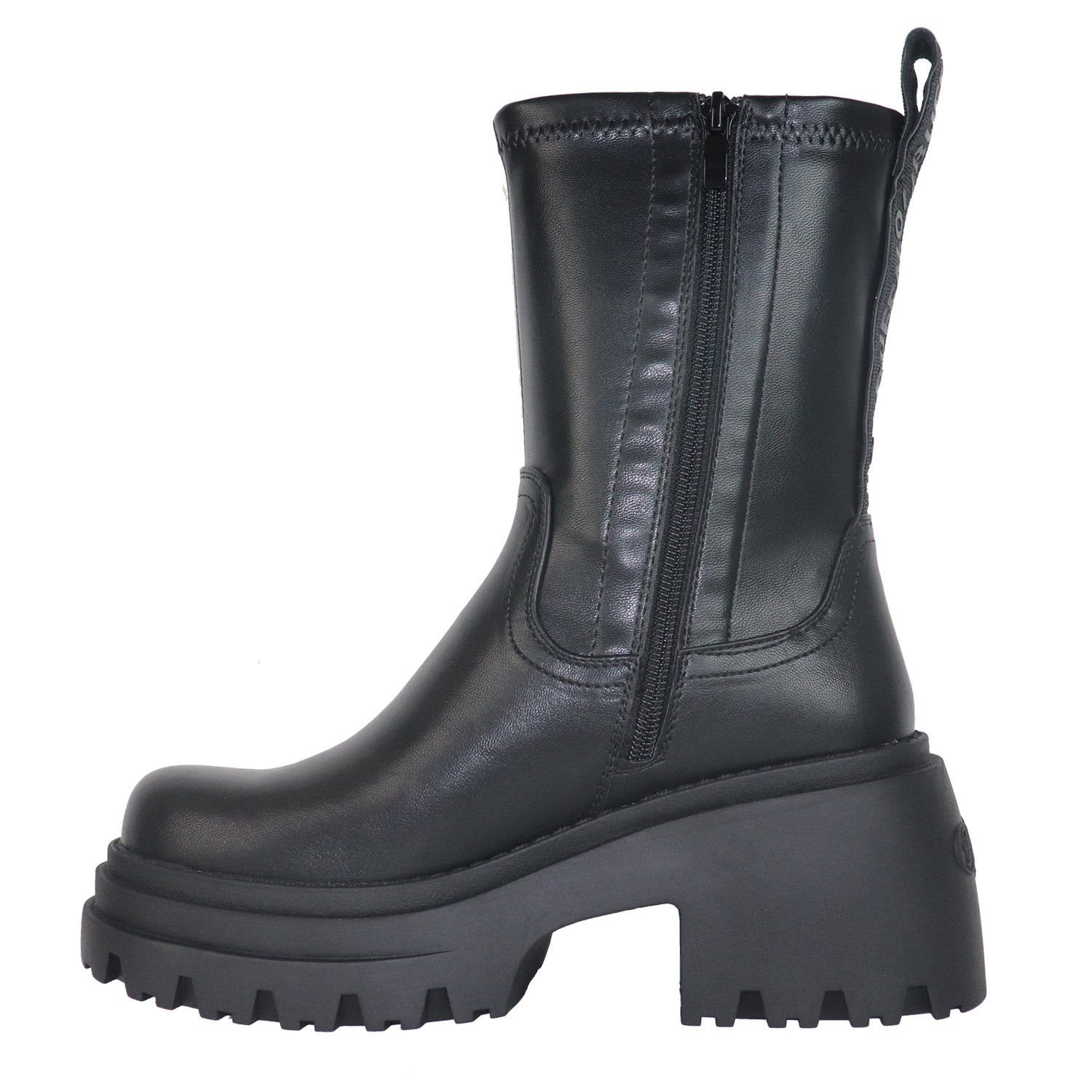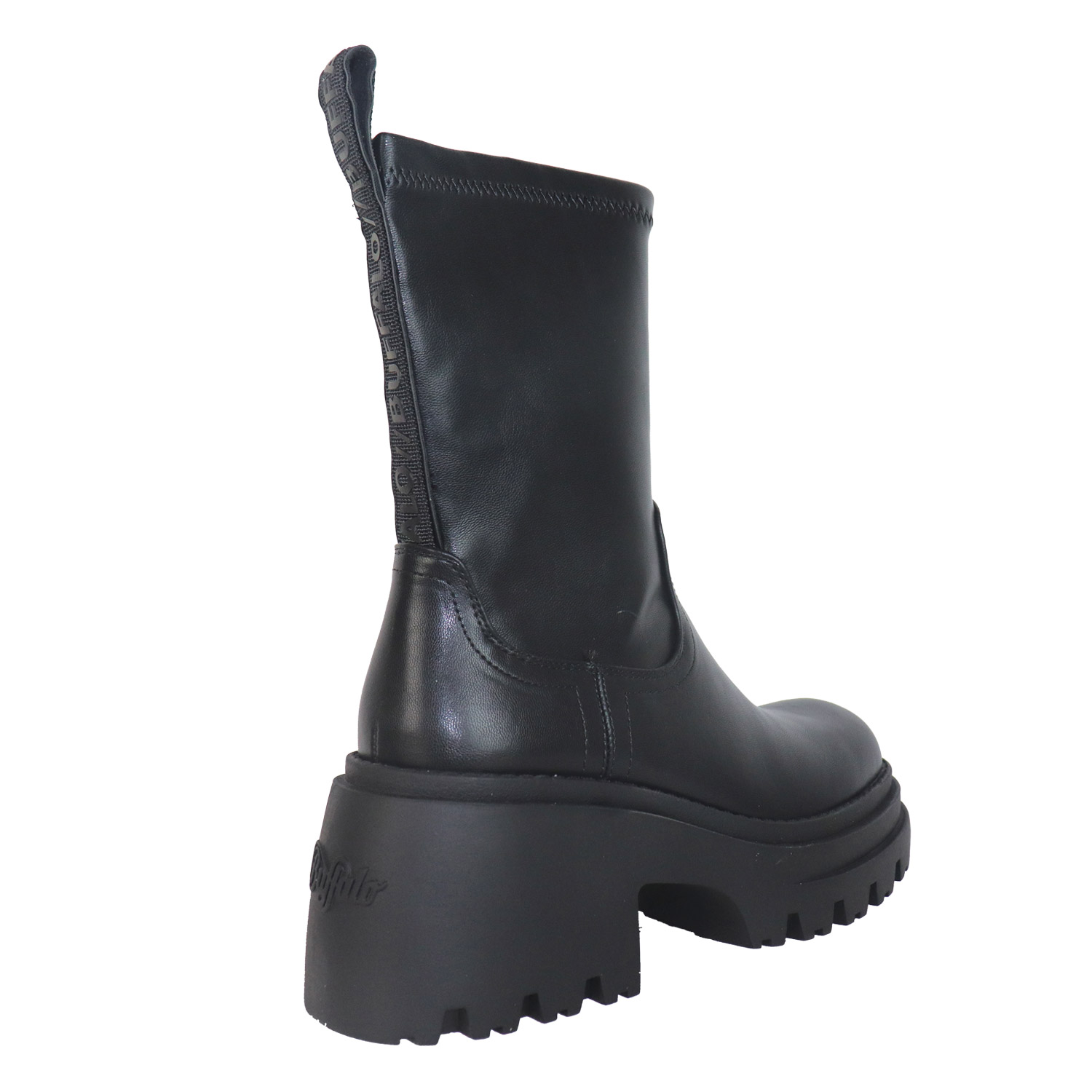 Buffalo γυναικείο μποτάκι, σε μαύρο χρώμα, κατασκευασμένο από οικολογικό δέρμα. Ύψος τακουνιού 8εκ.