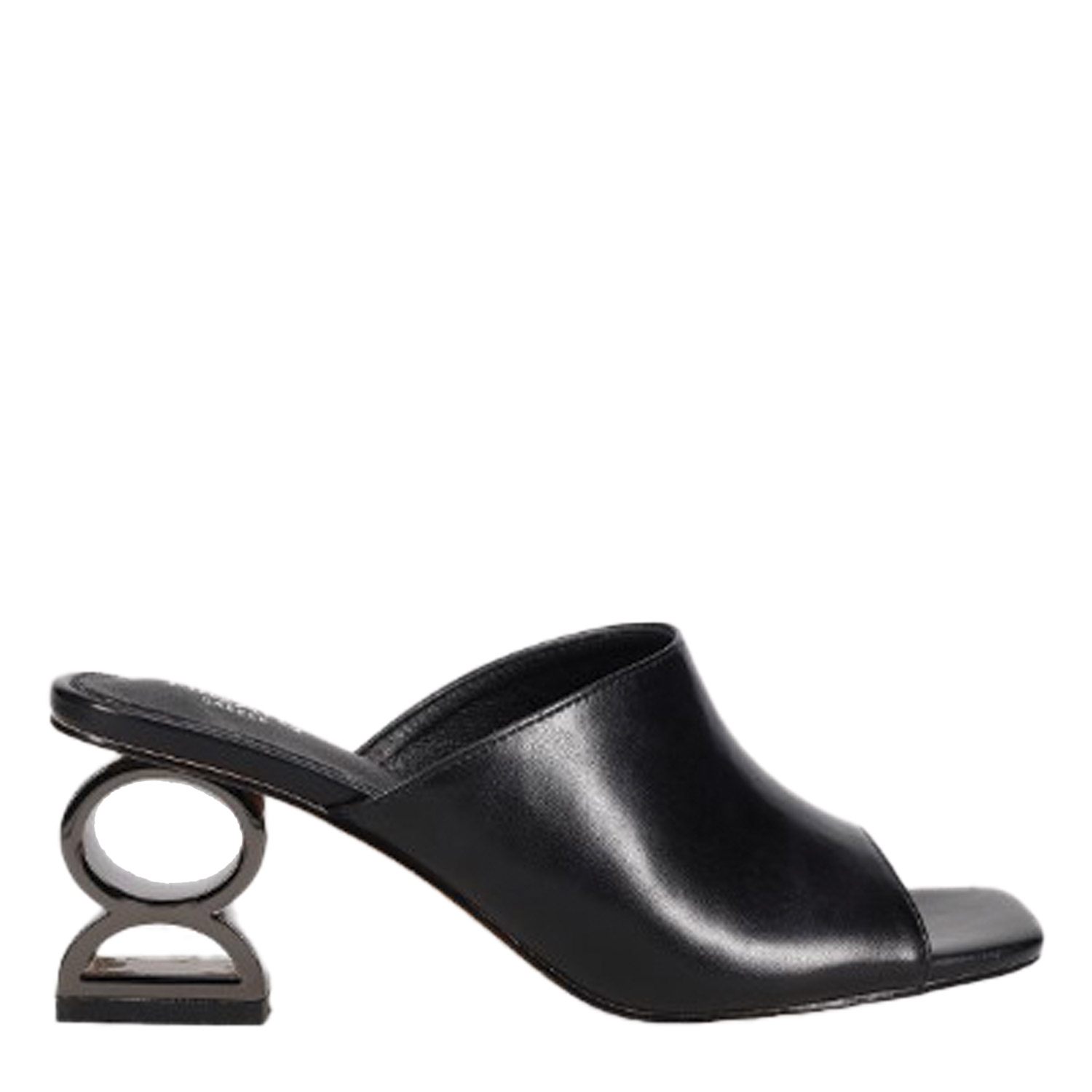 Μαύρο mule πέδιλο με φαρδιά φάσα. Διαθέτει ιδαίτερο γλυπτό τακούνι μεσαίου ύψους.