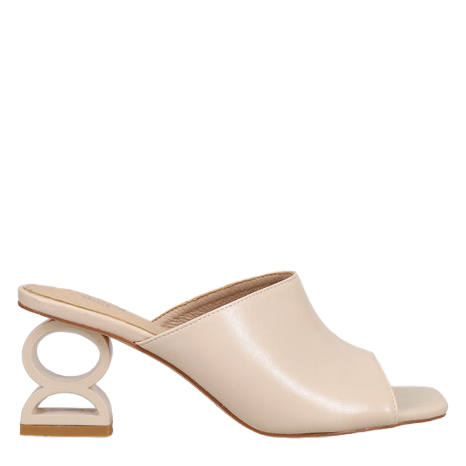 Μπεζ mule πέδιλο με φαρδιά φάσα. Διαθέτει ιδαίτερο γλυπτό τακούνι μεσαίου ύψους.