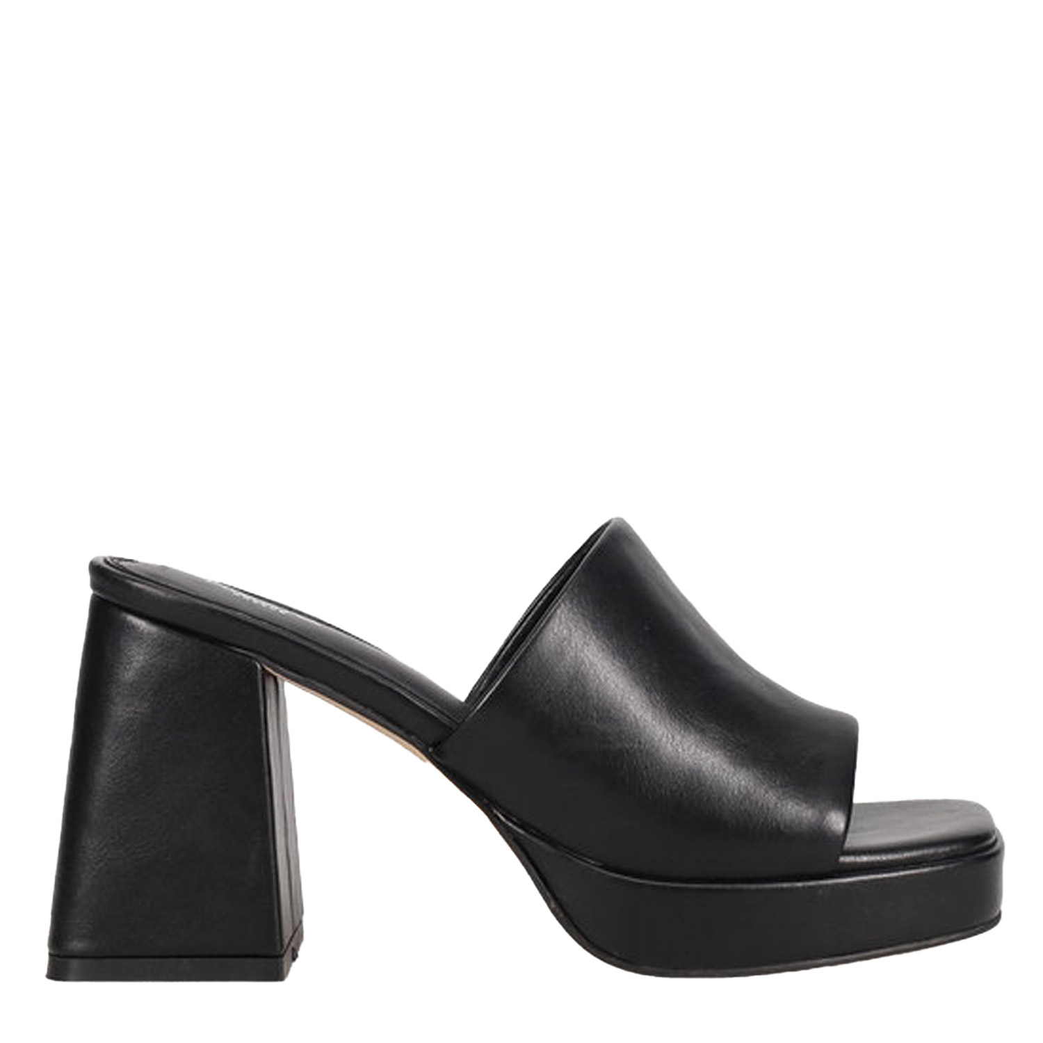 Μαύρο mule πέδιλο. Διαθέτει μαλακό μαξιλαράκι στη σόλα, φαρδιά φάσα, φιάπα και ψηλό χοντρό τακούνι.