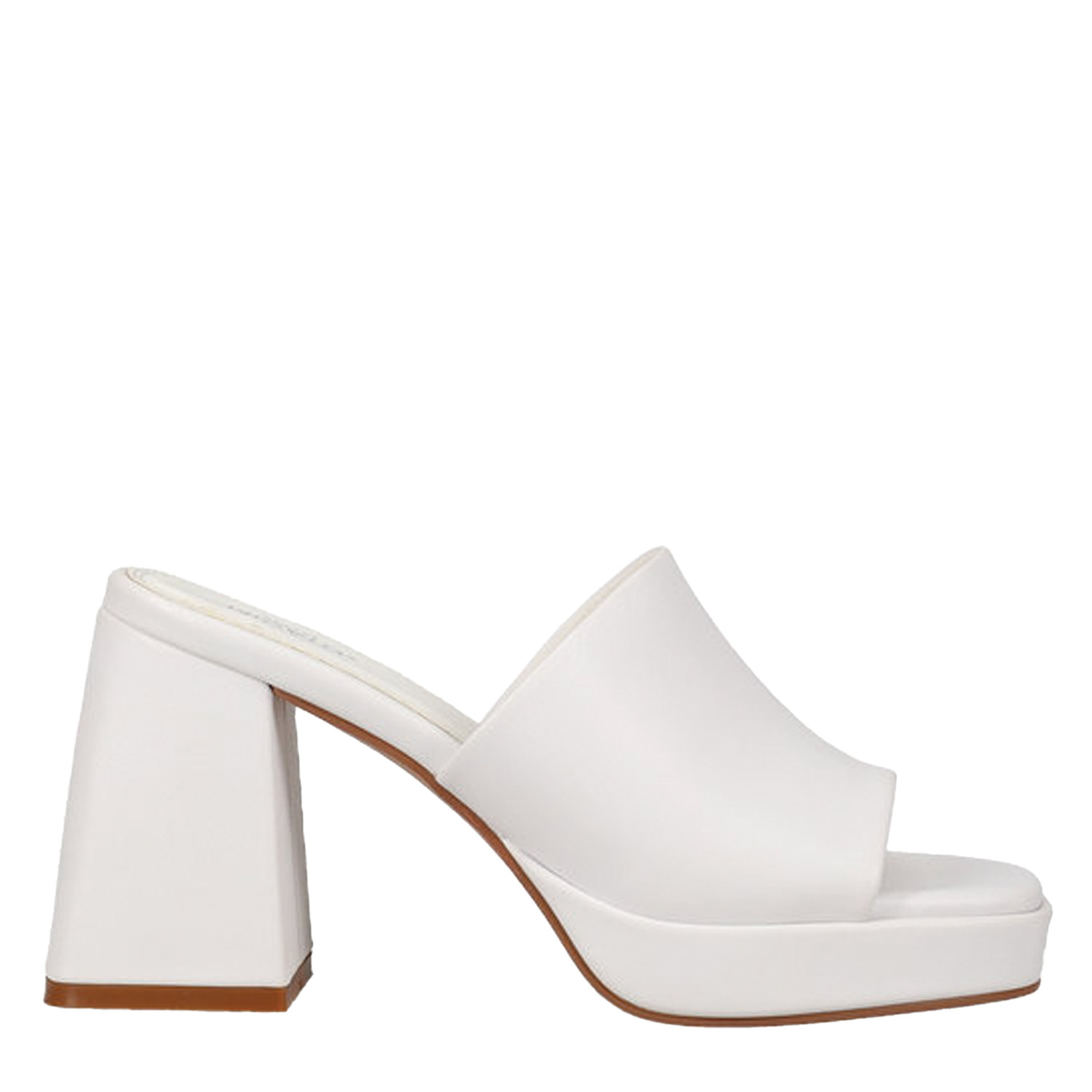 Λευκό mule πέδιλο. Διαθέτει μαλακό μαξιλαράκι στη σόλα, φαρδιά φάσα, φιάπα και ψηλό χοντρό τακούνι.