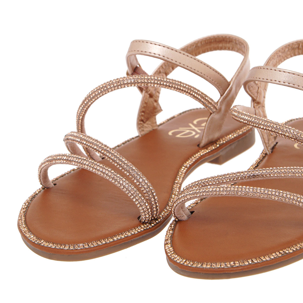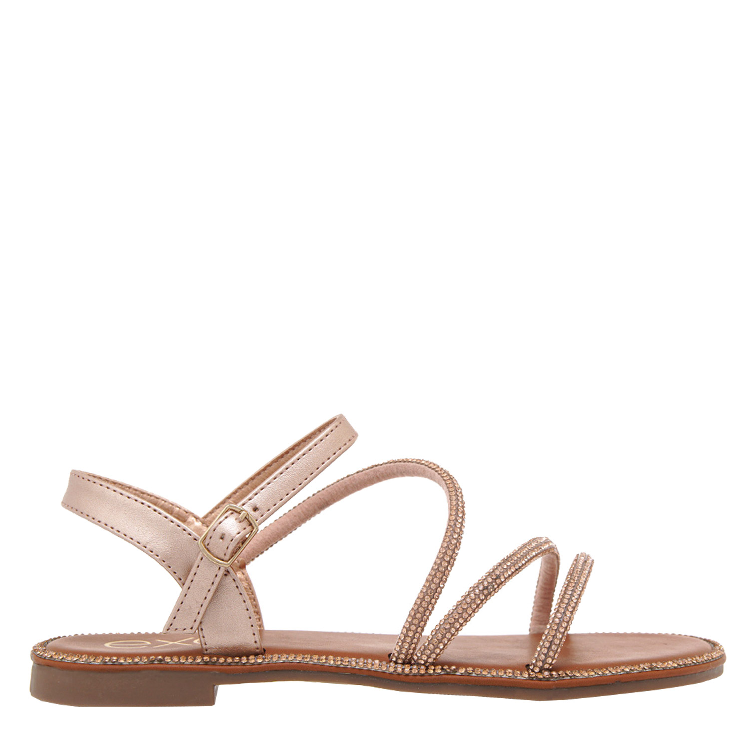 Exe γυναικείο σανδάλι σε ροζ χρυσό χρώμα κατασκευασμένο από οικολογικό δέρμα με στρας. Ύψος σόλας 1εκ.