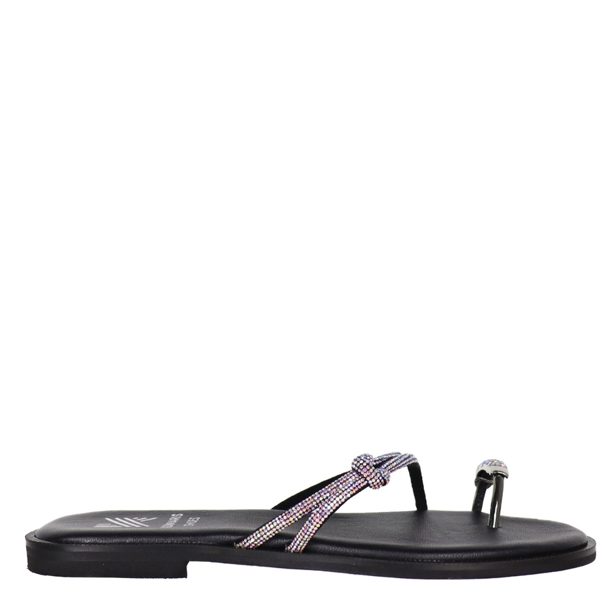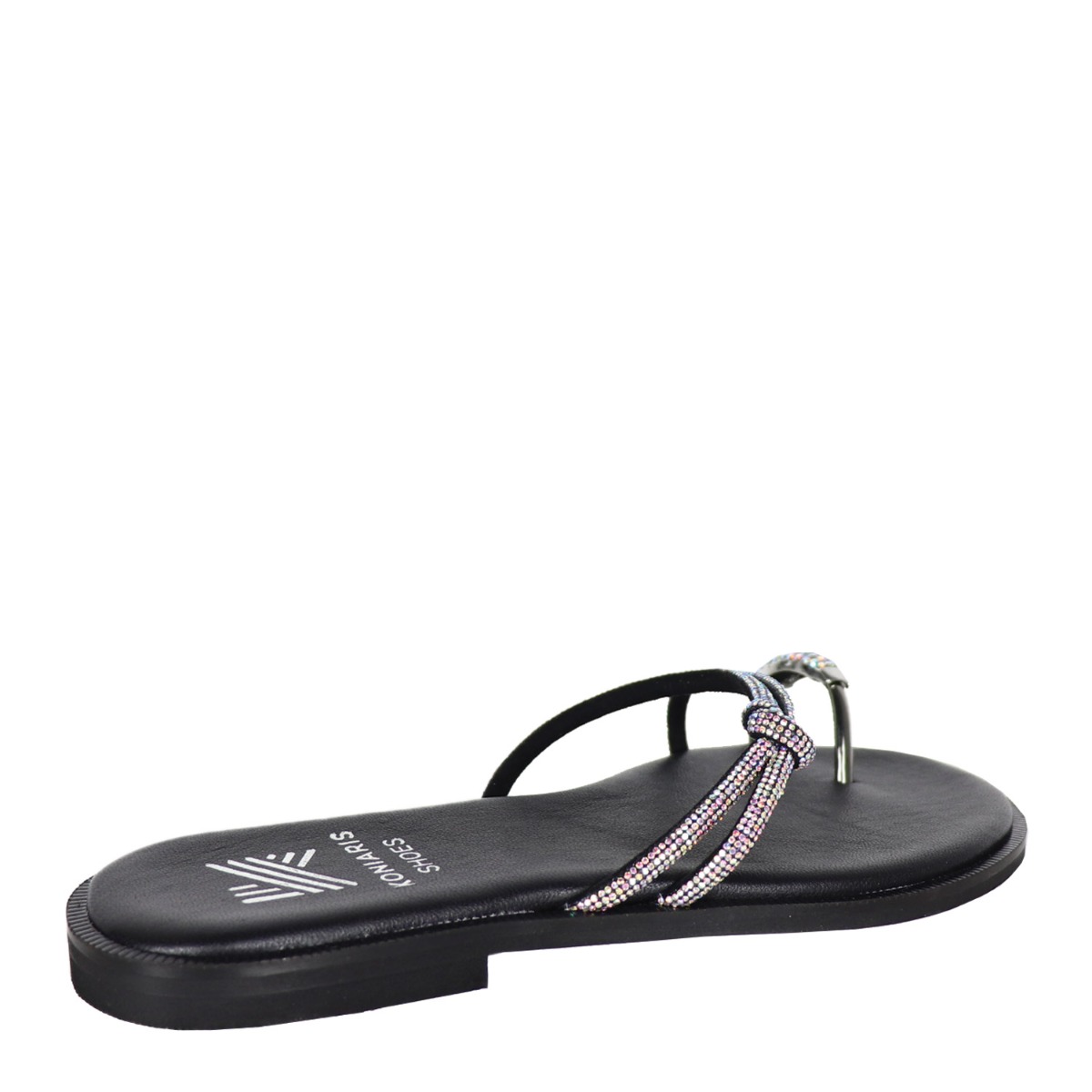 Koniarisshoes γυναικείο σανδάλι σε μαύρο χρώμα κατασκευασμένο από ύφασμα με στρας και δερμάτινο πατάκι. Ύψος τακουνιού 1εκ.