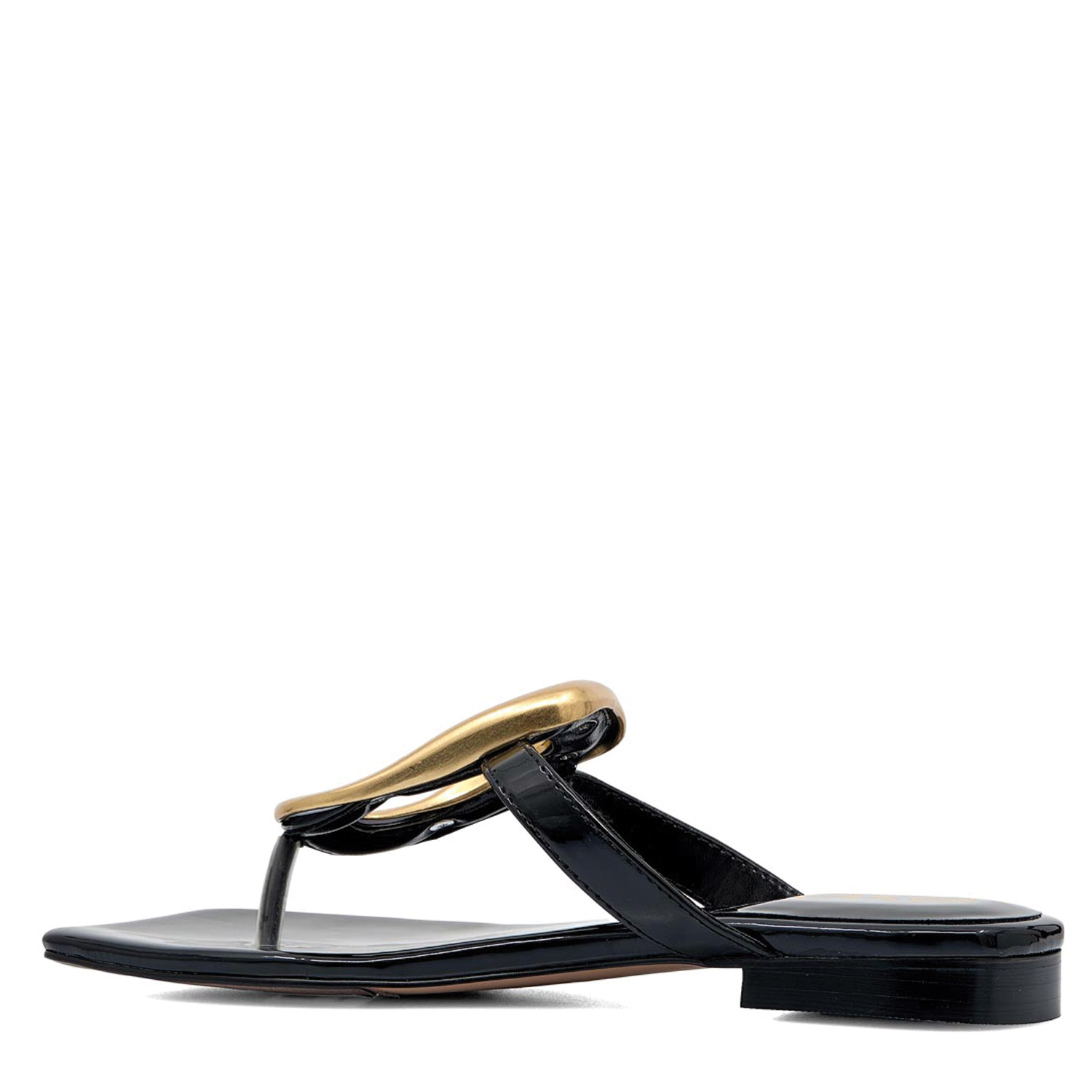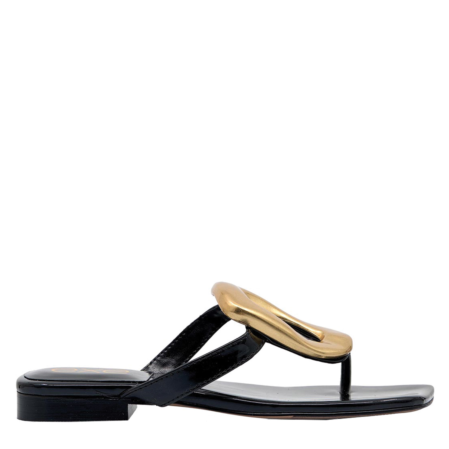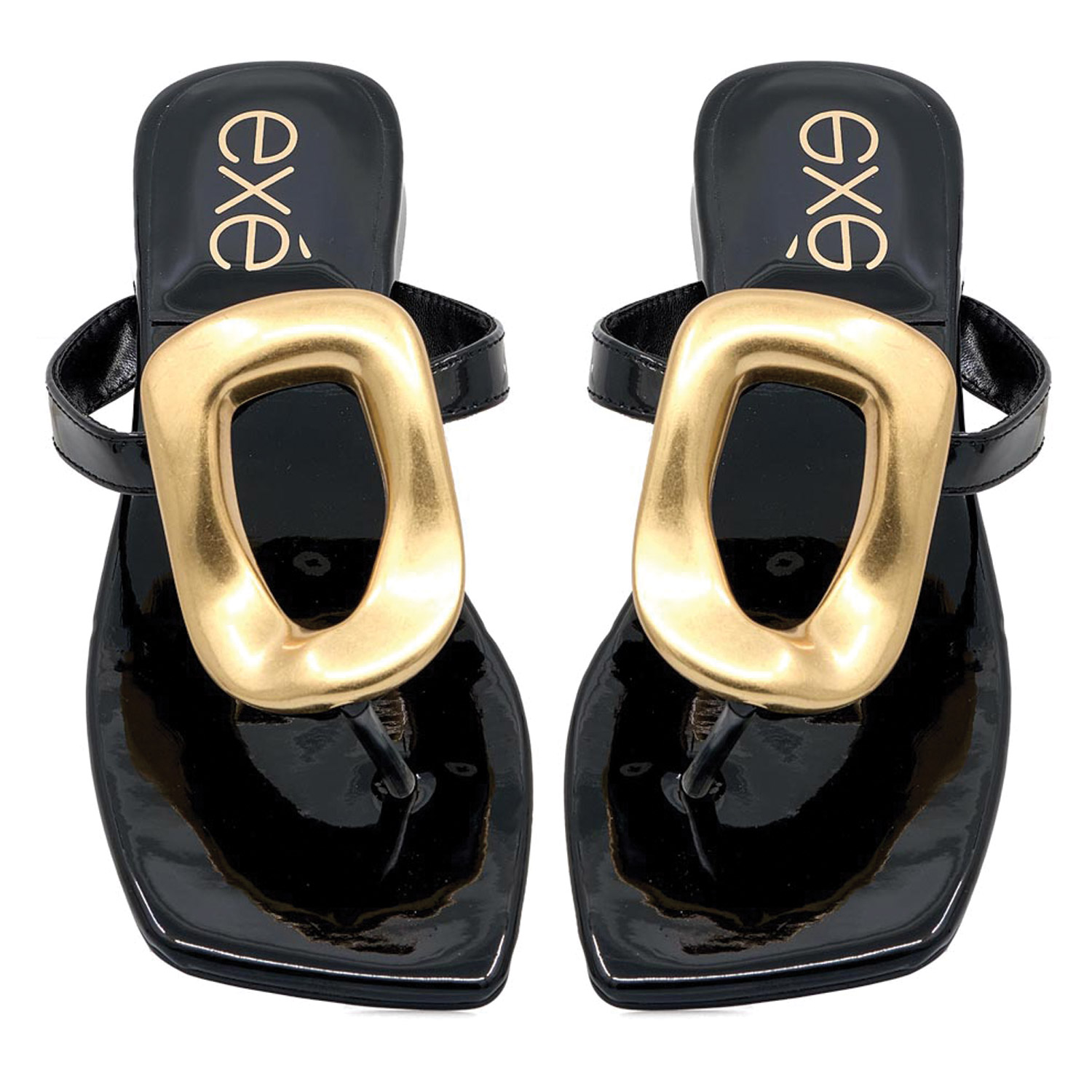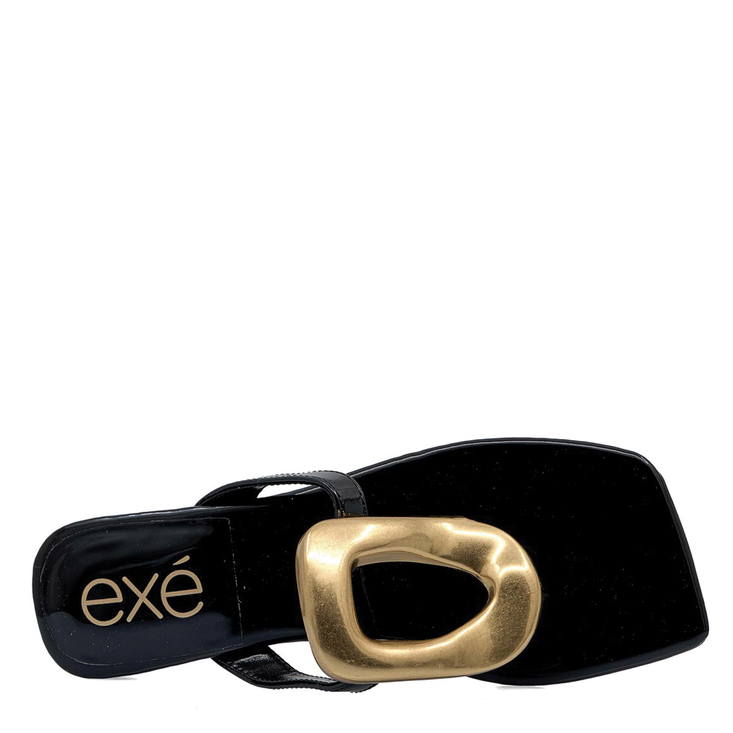 Exe γυναικείο σανδάλι, σε μαύρο χρώμα, κατασκευασμένο από λουστρίνι. Ύψος τακουνιού 4.5εκ.