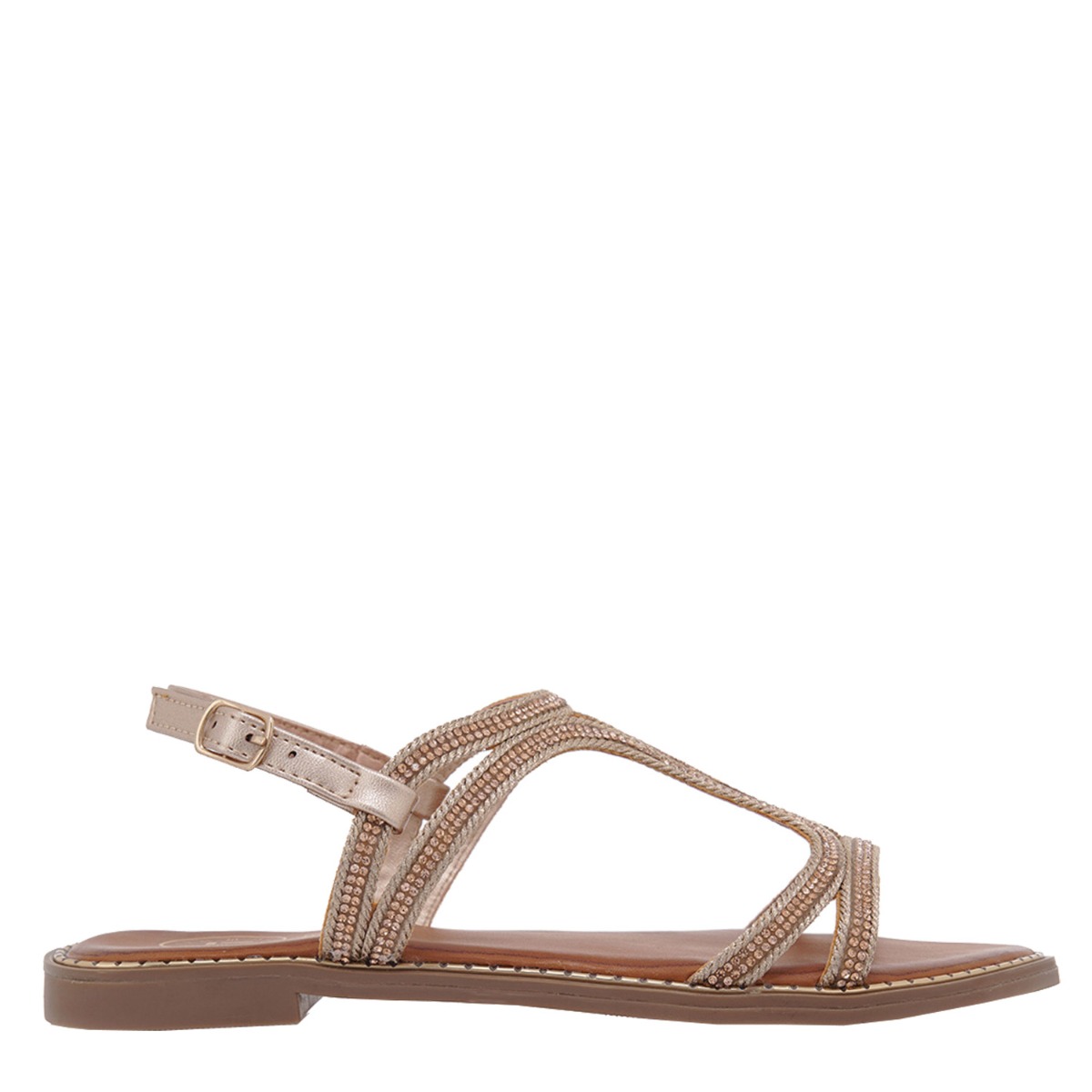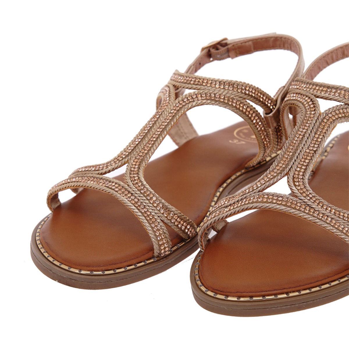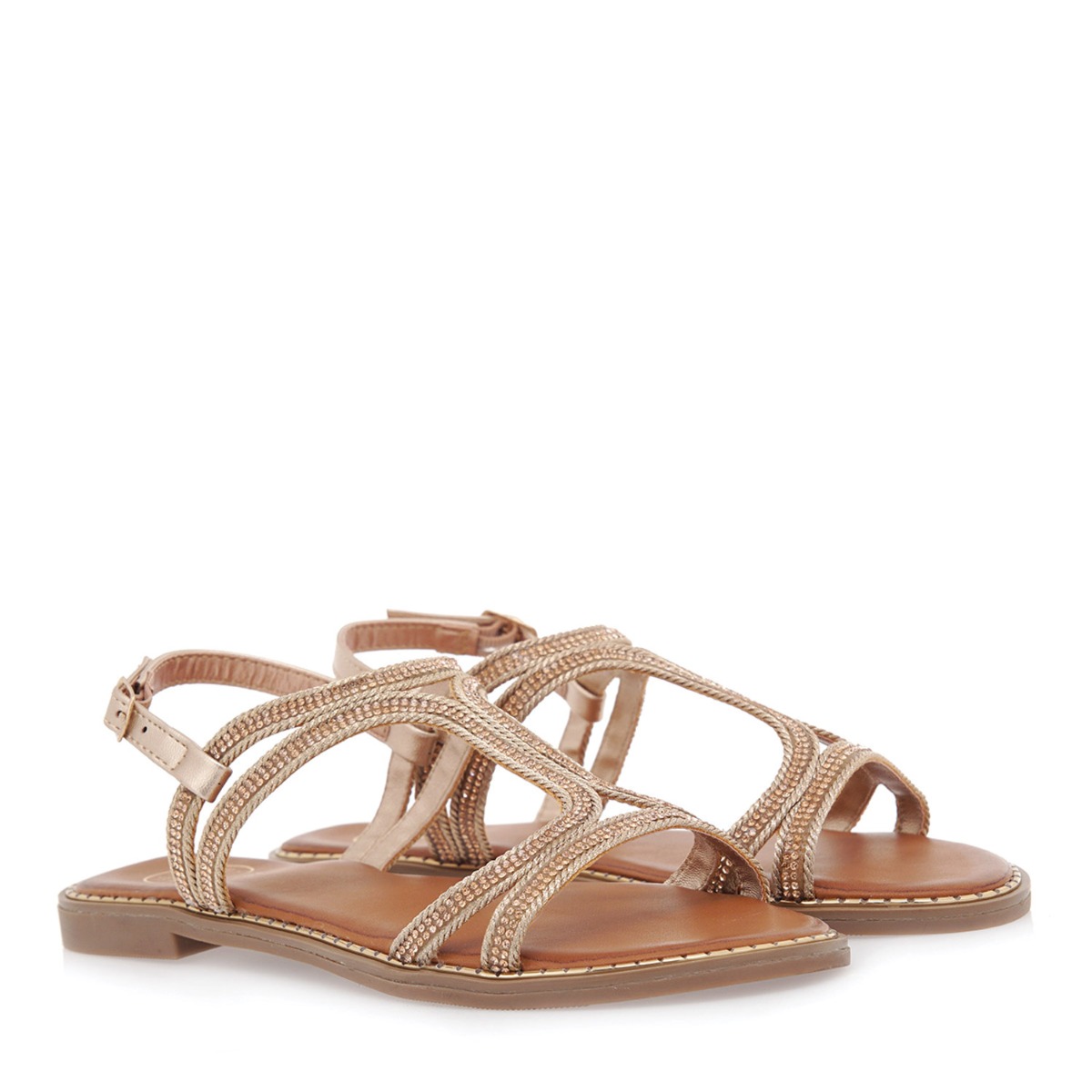 Seven γυναικείο σανδάλι σε ροζ χρυσό χρώμα, κατασκευασμένο από ύφασμα και οικολογικό δέρμα. Ύψος τακουνιού 1,5εκ.