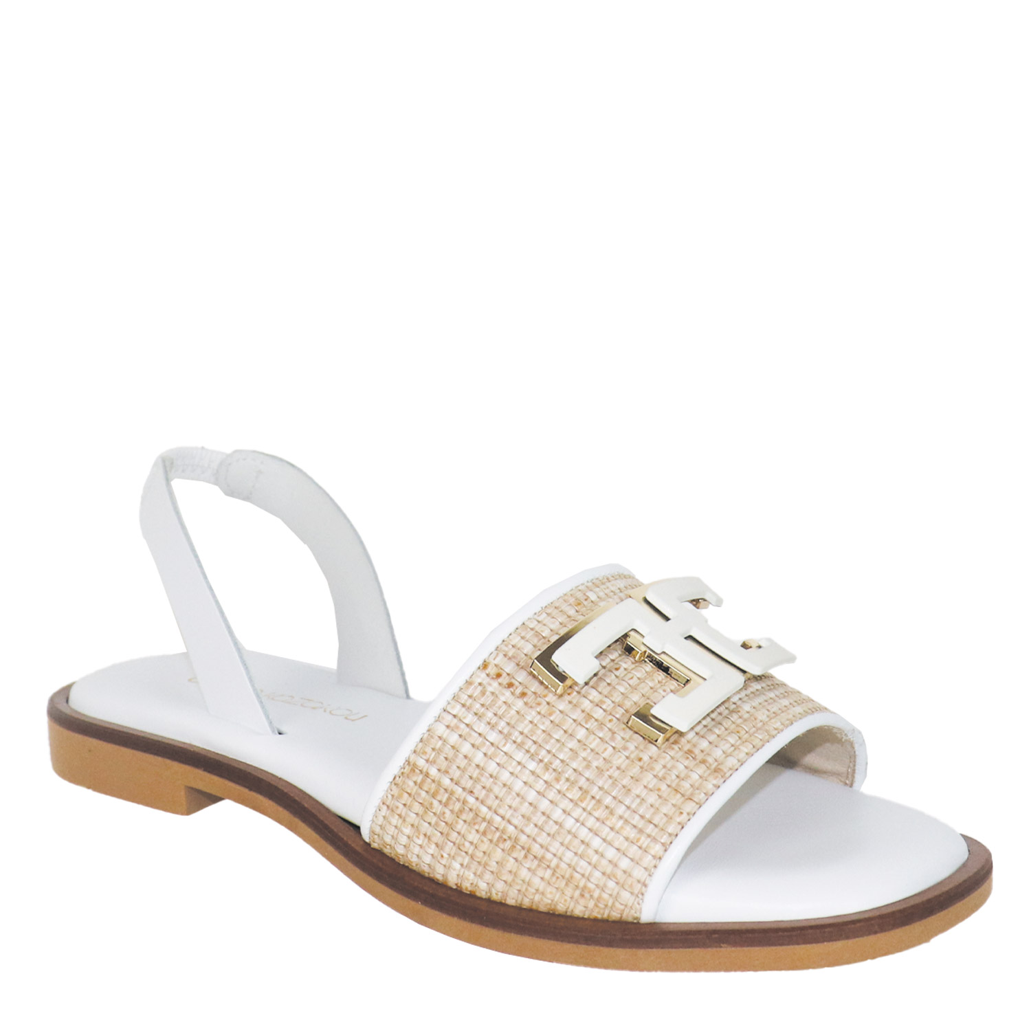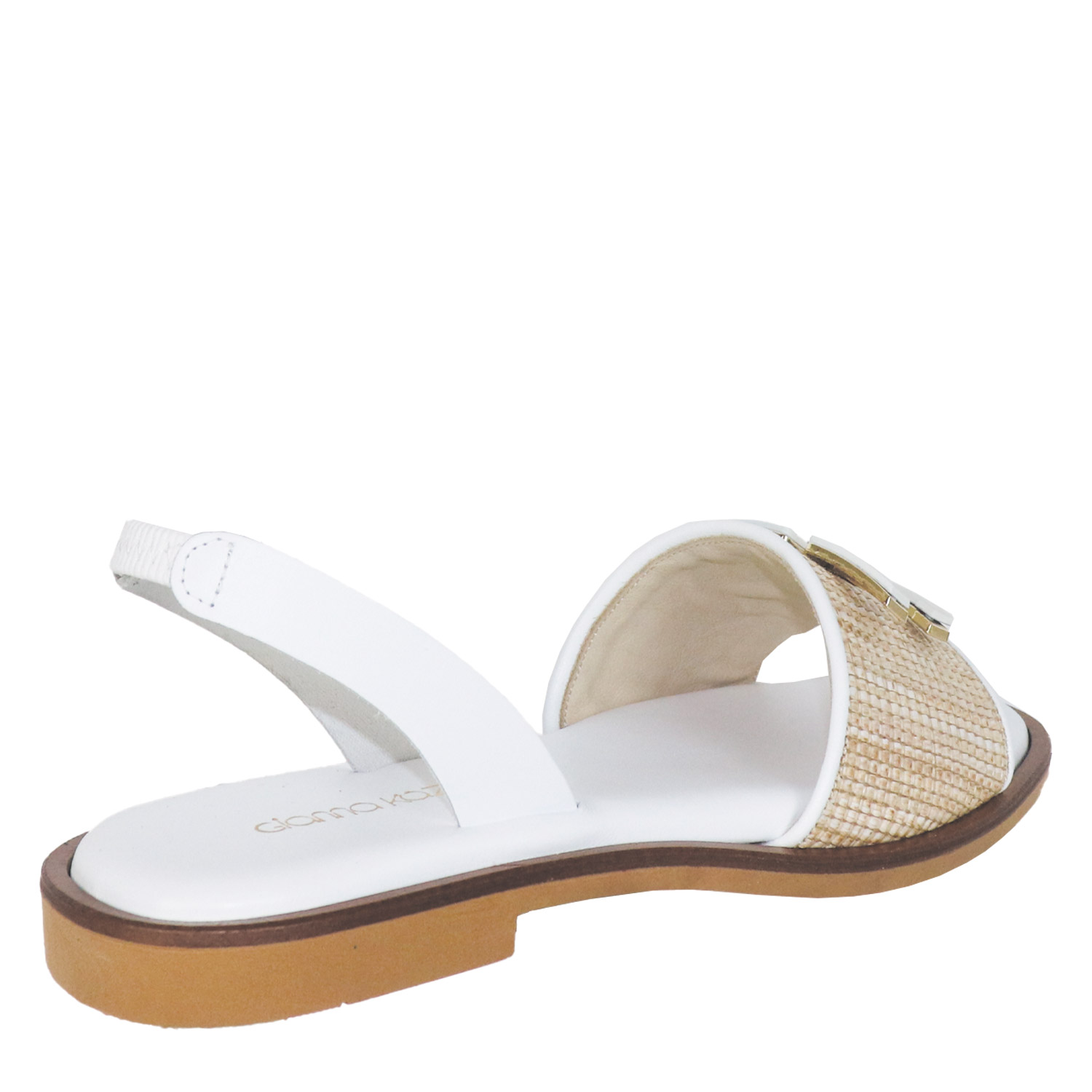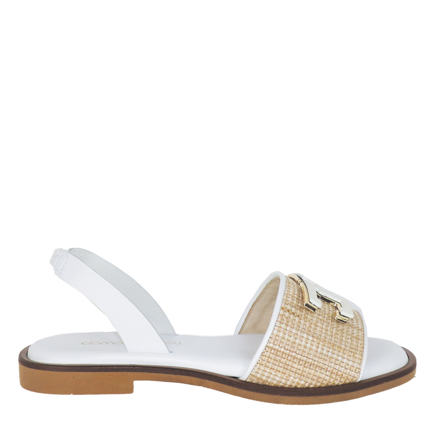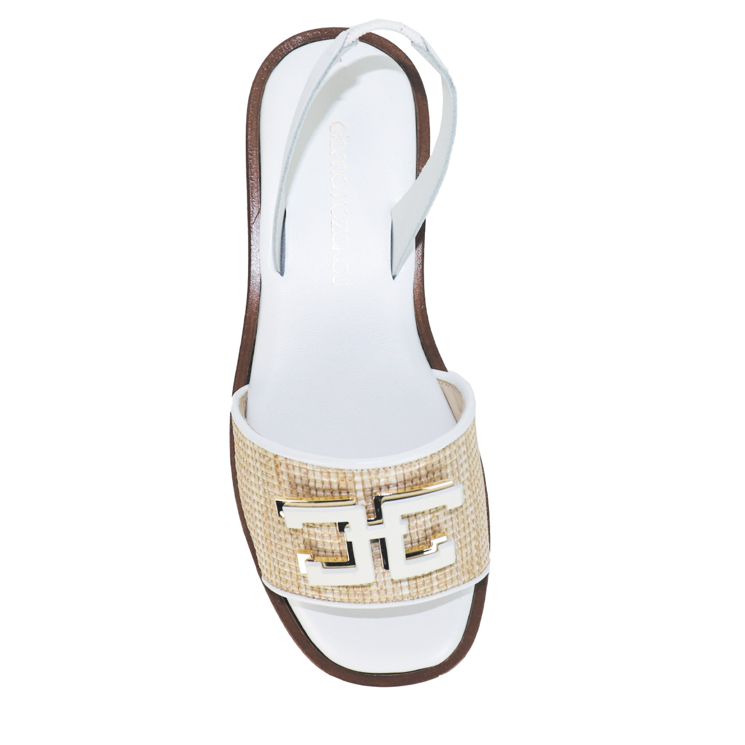 Gianna Kazakou γυναικείο σανδάλι σε μπεζ-λευκό χρώμα κατασκευασμένο από ψάθα και δέρμα. Ύψος τακουνιού 2εκ.
