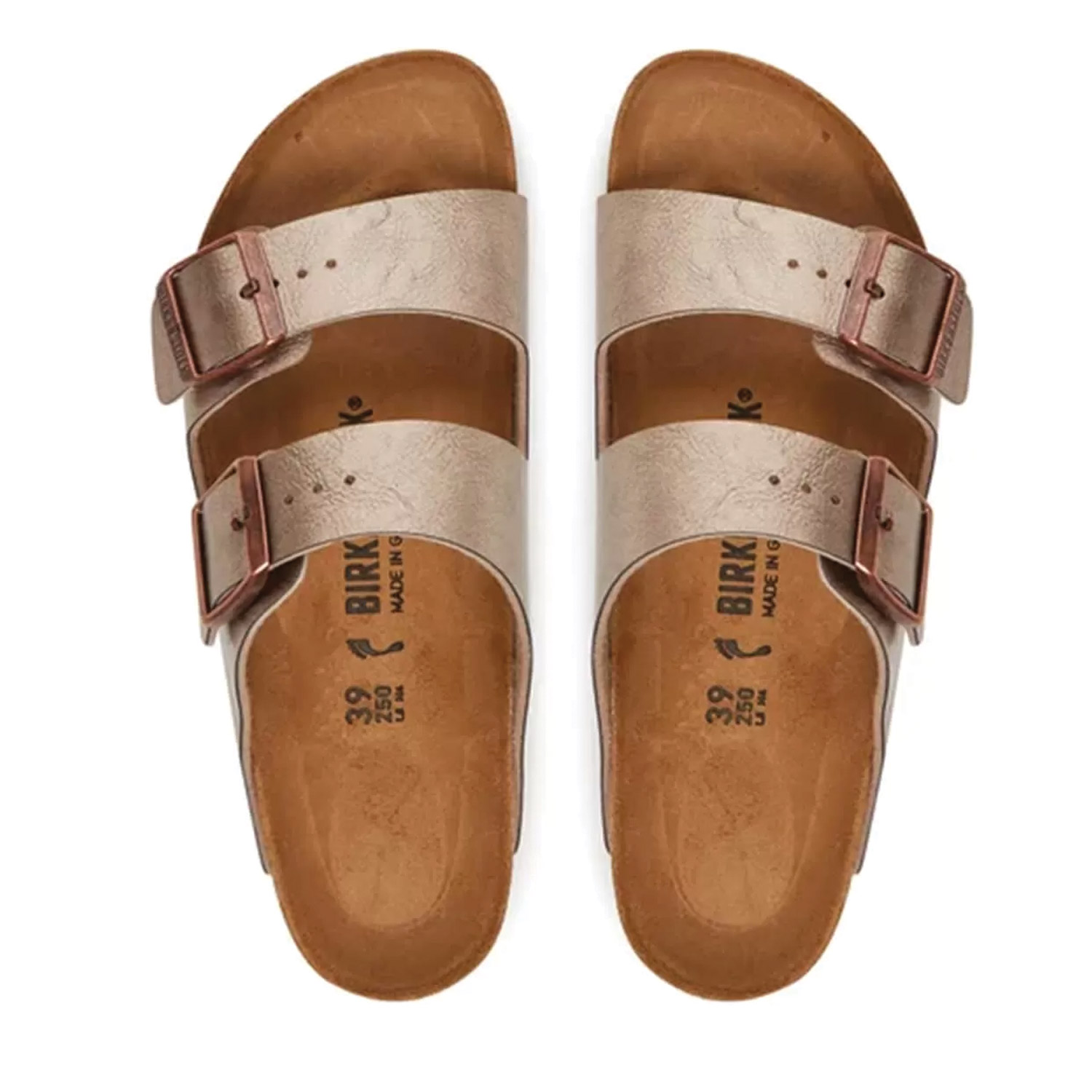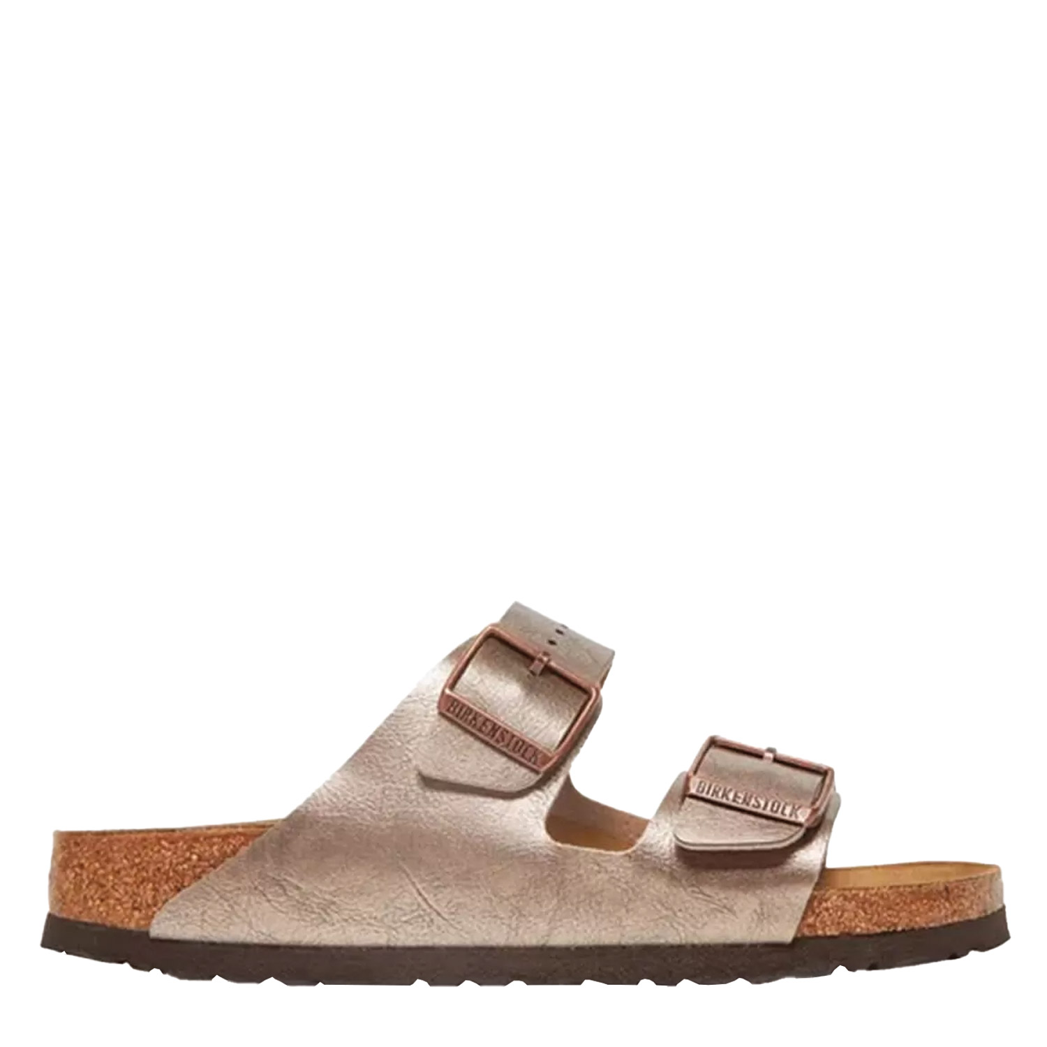 Birkenstock γυναικείο σανδάλι, σε πλατίνα χρώμα, κατασκευασμένο από οικολογικό δέρμα, με ανατομικό πάτο. Ύψος σόλας 3εκ.